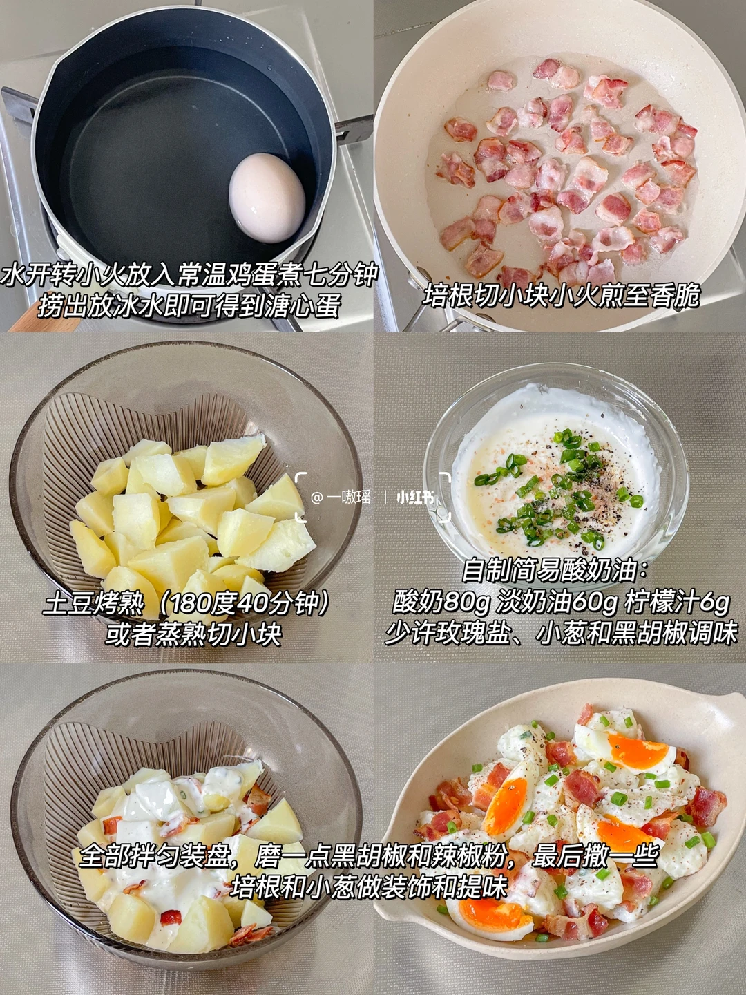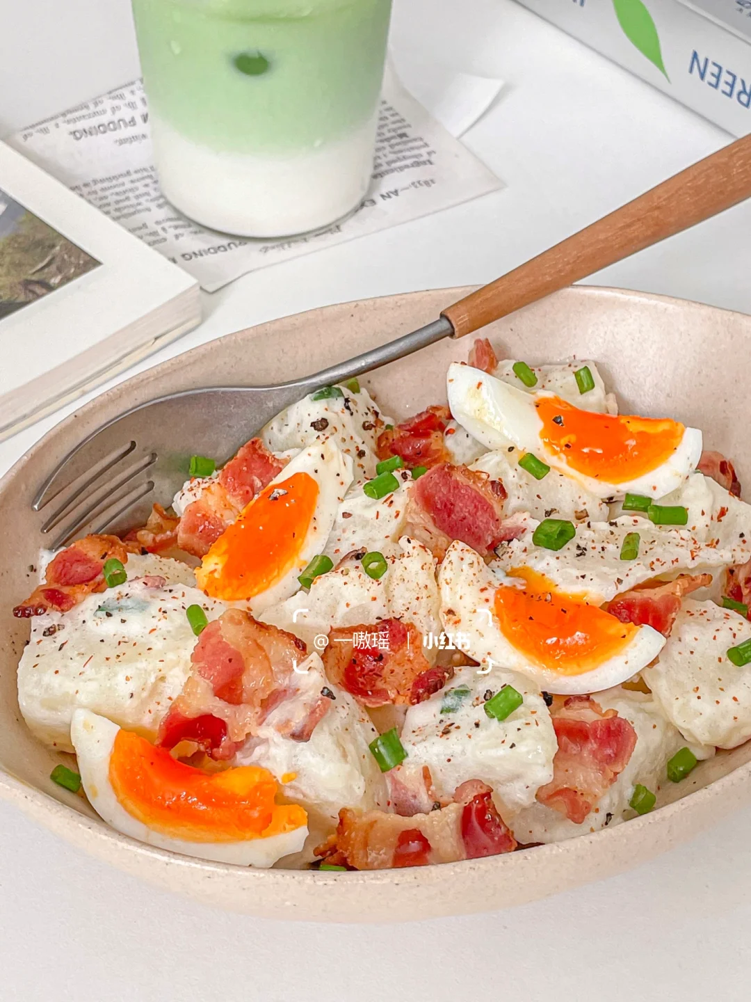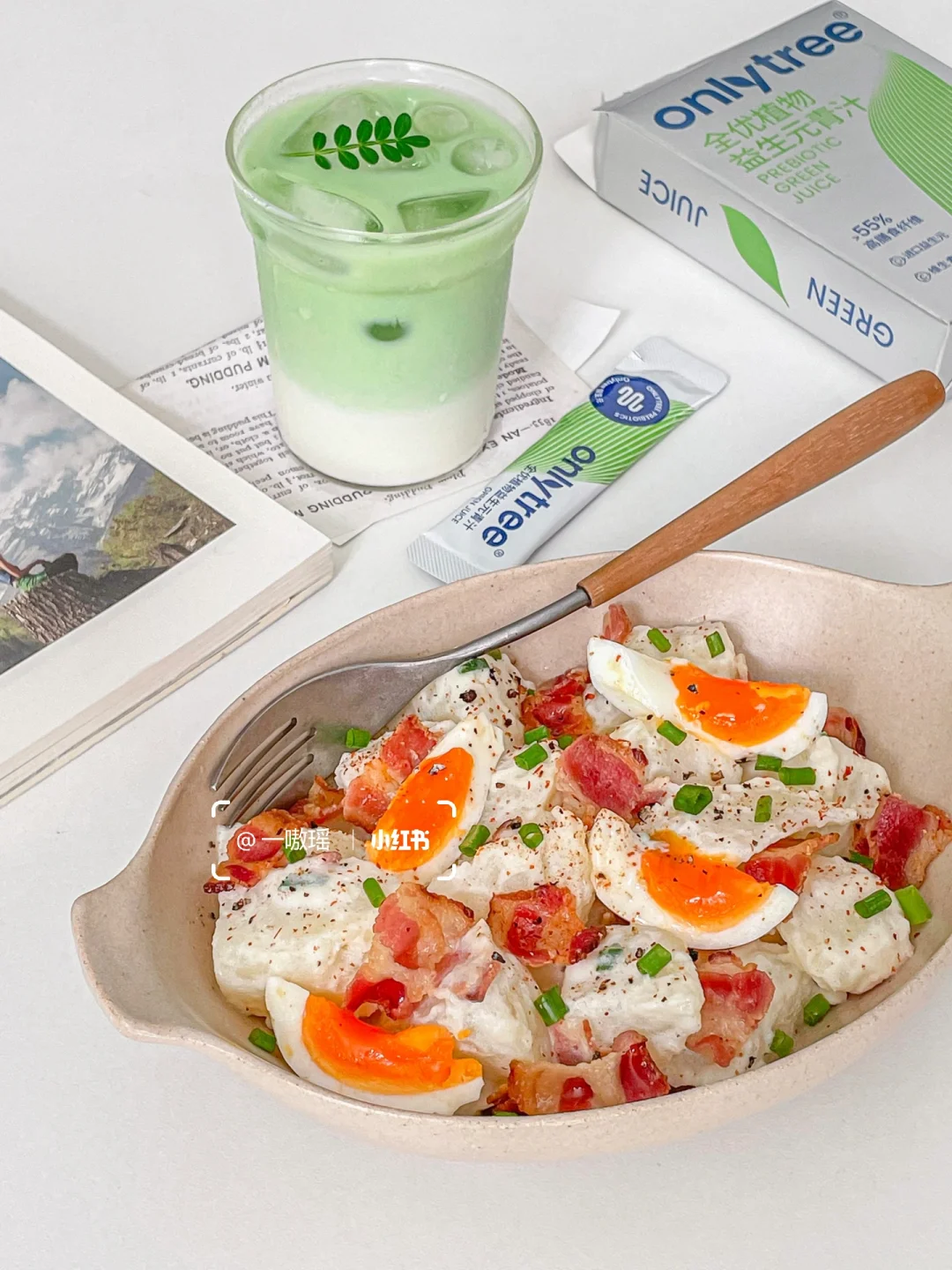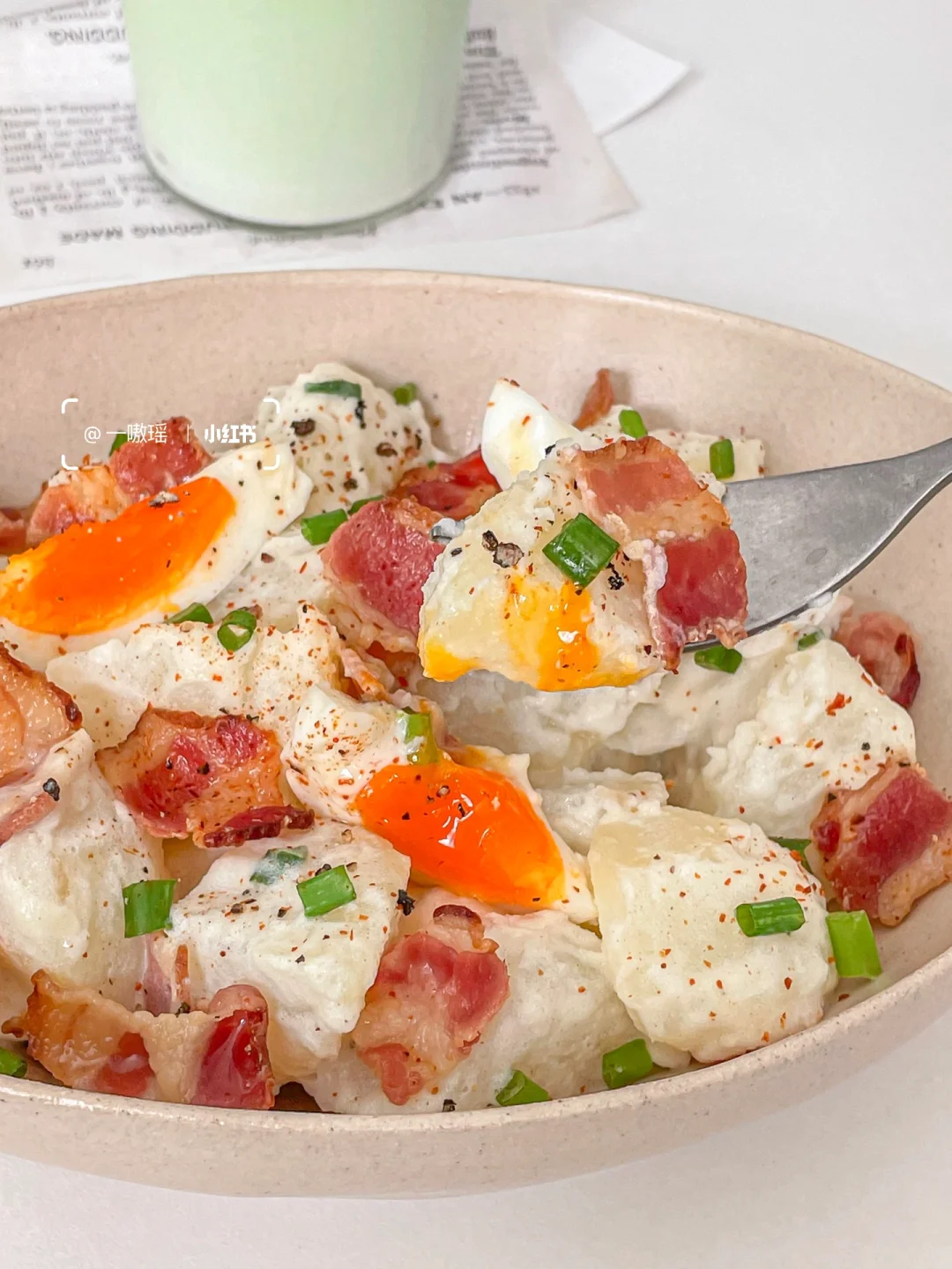 土豆建议烤熟,或者蒸熟也🉑️,培根煎到焦香,加上溏心蛋,营养均衡,饱腹感超强