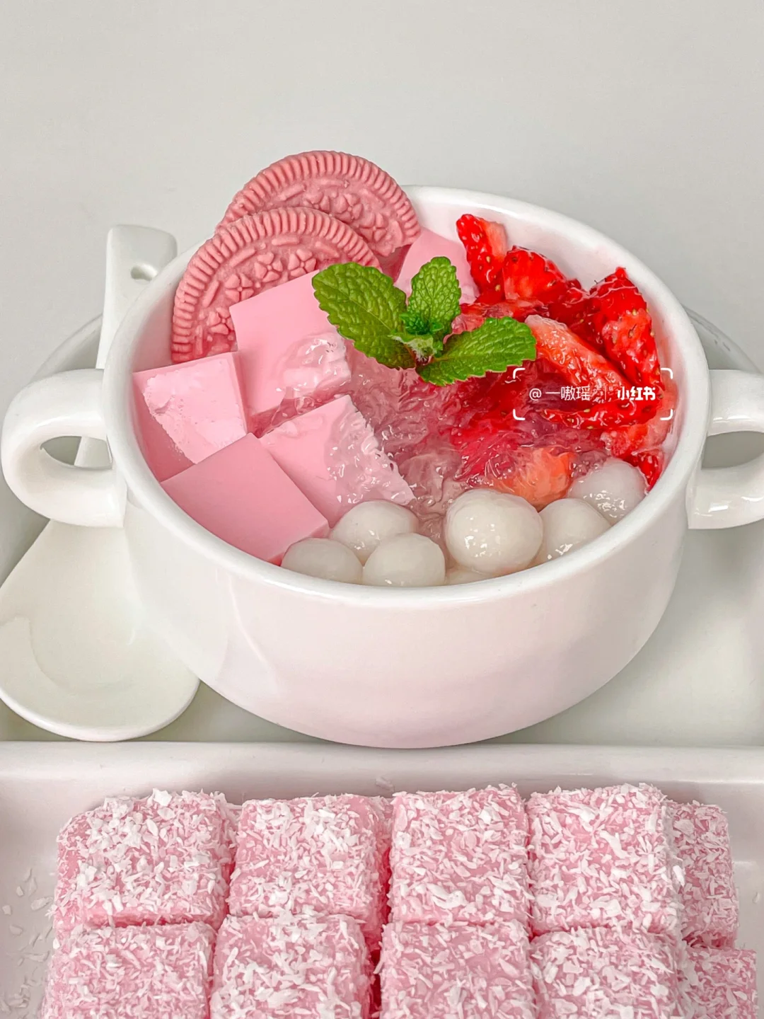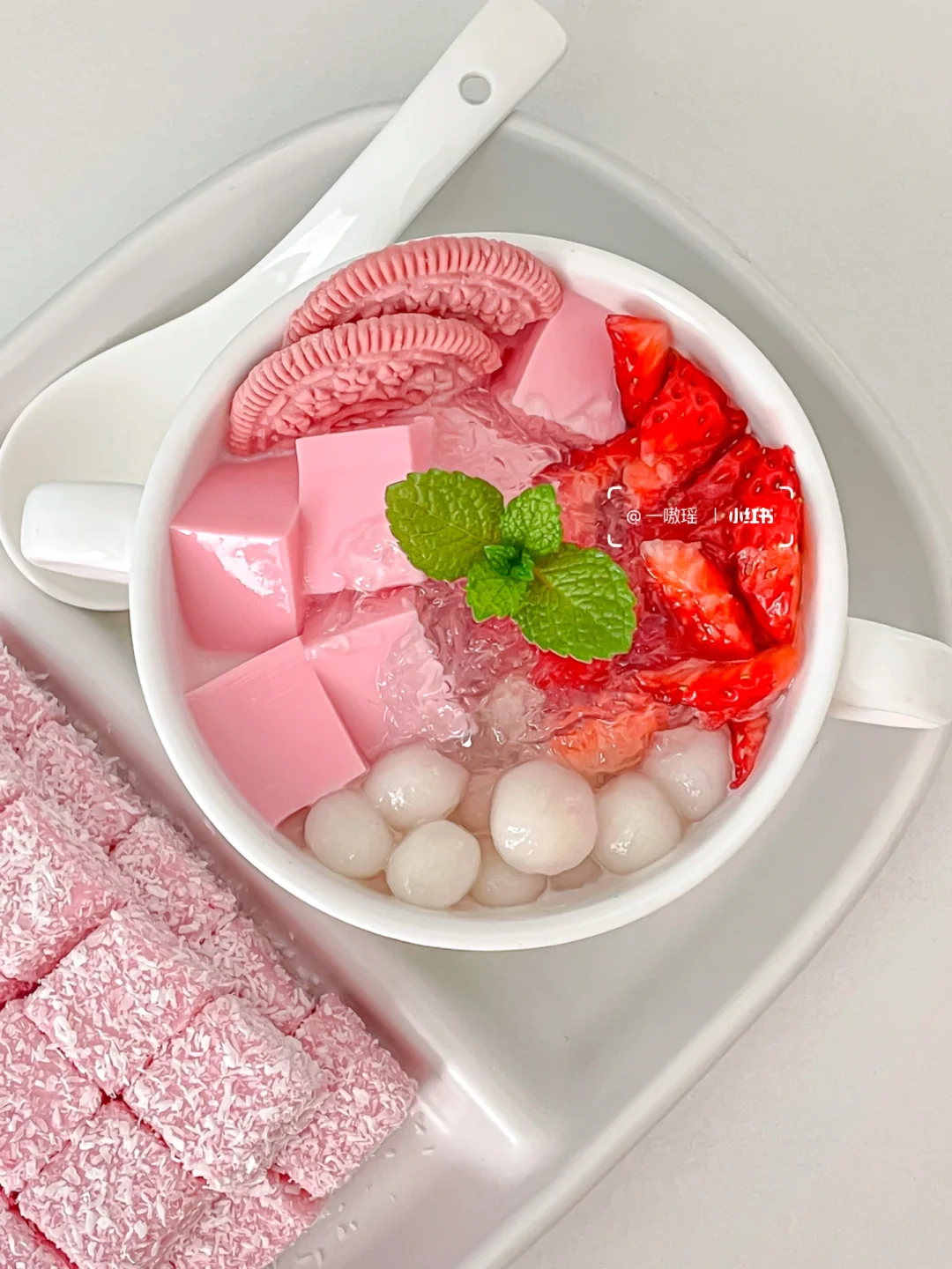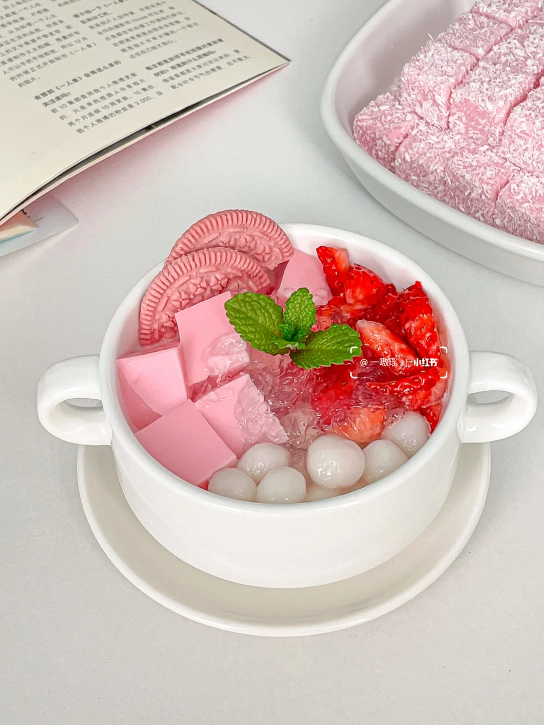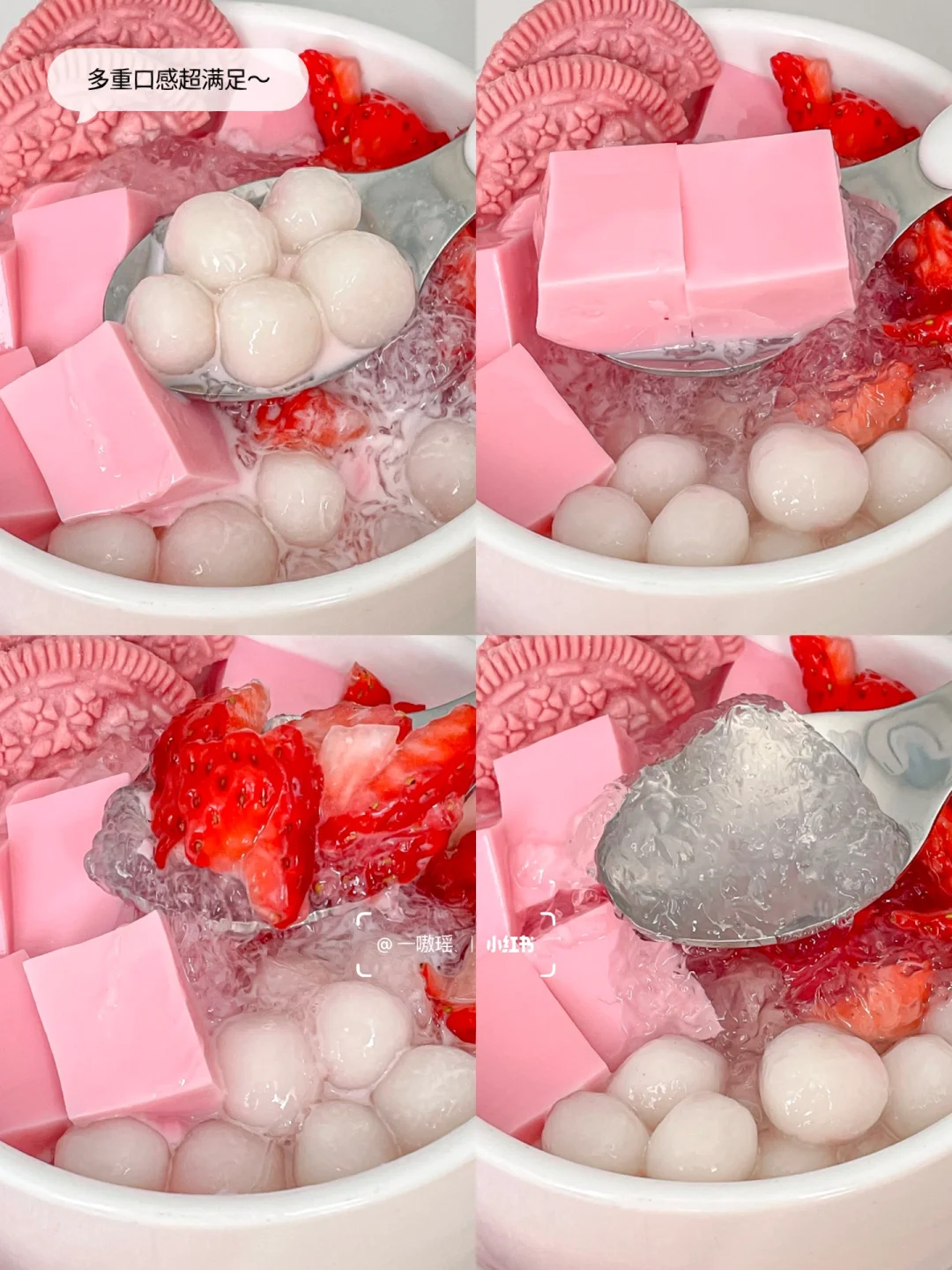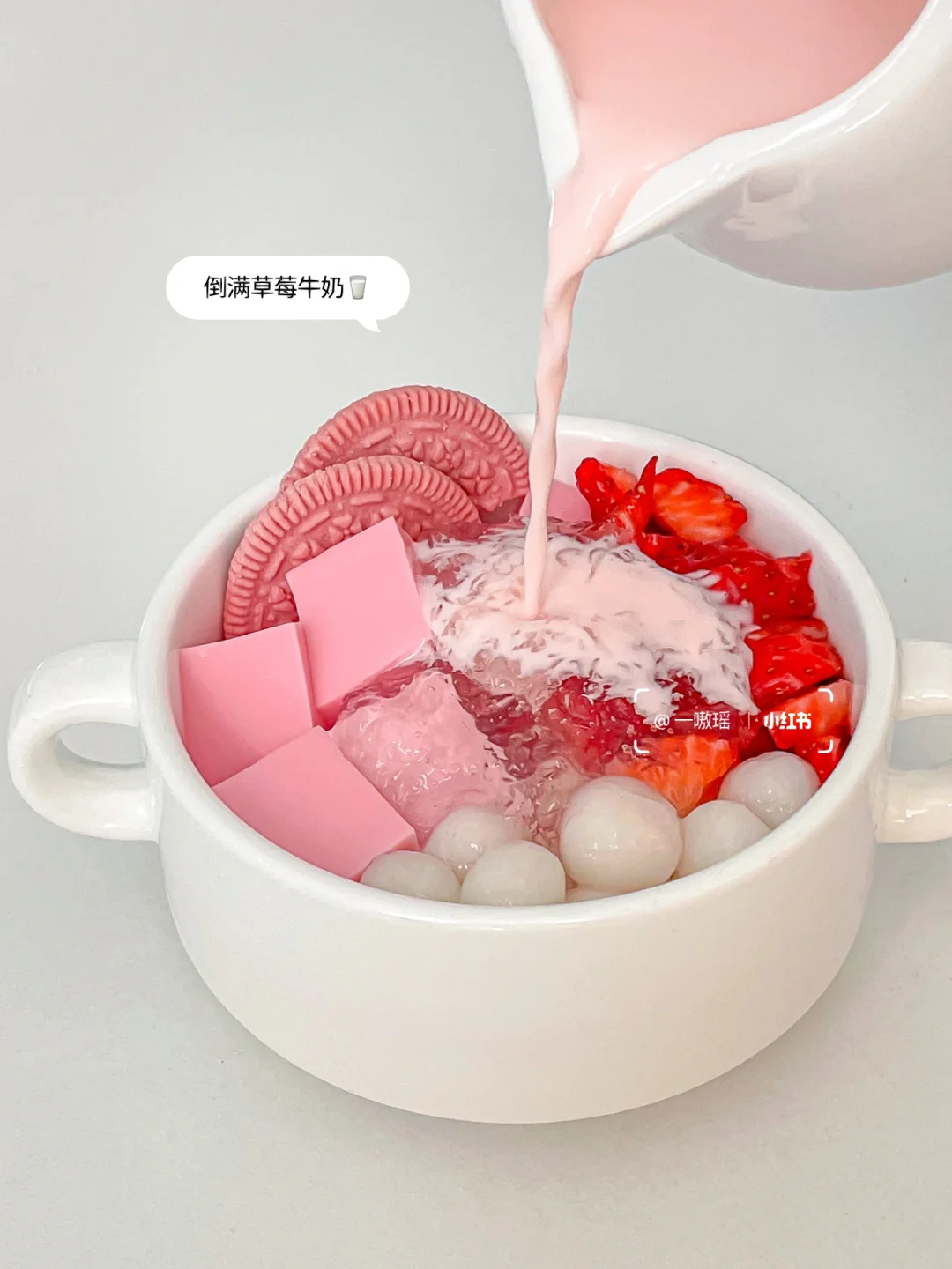 ▫️碗里放入奶冻、小圆子、草莓丁,淋上牛奶即可
