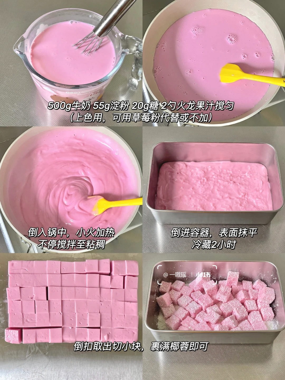 ▫️500g牛奶 55g淀粉 20g糖 2勺火龙果汁搅匀(上色用,可用草莓粉代替或不加)