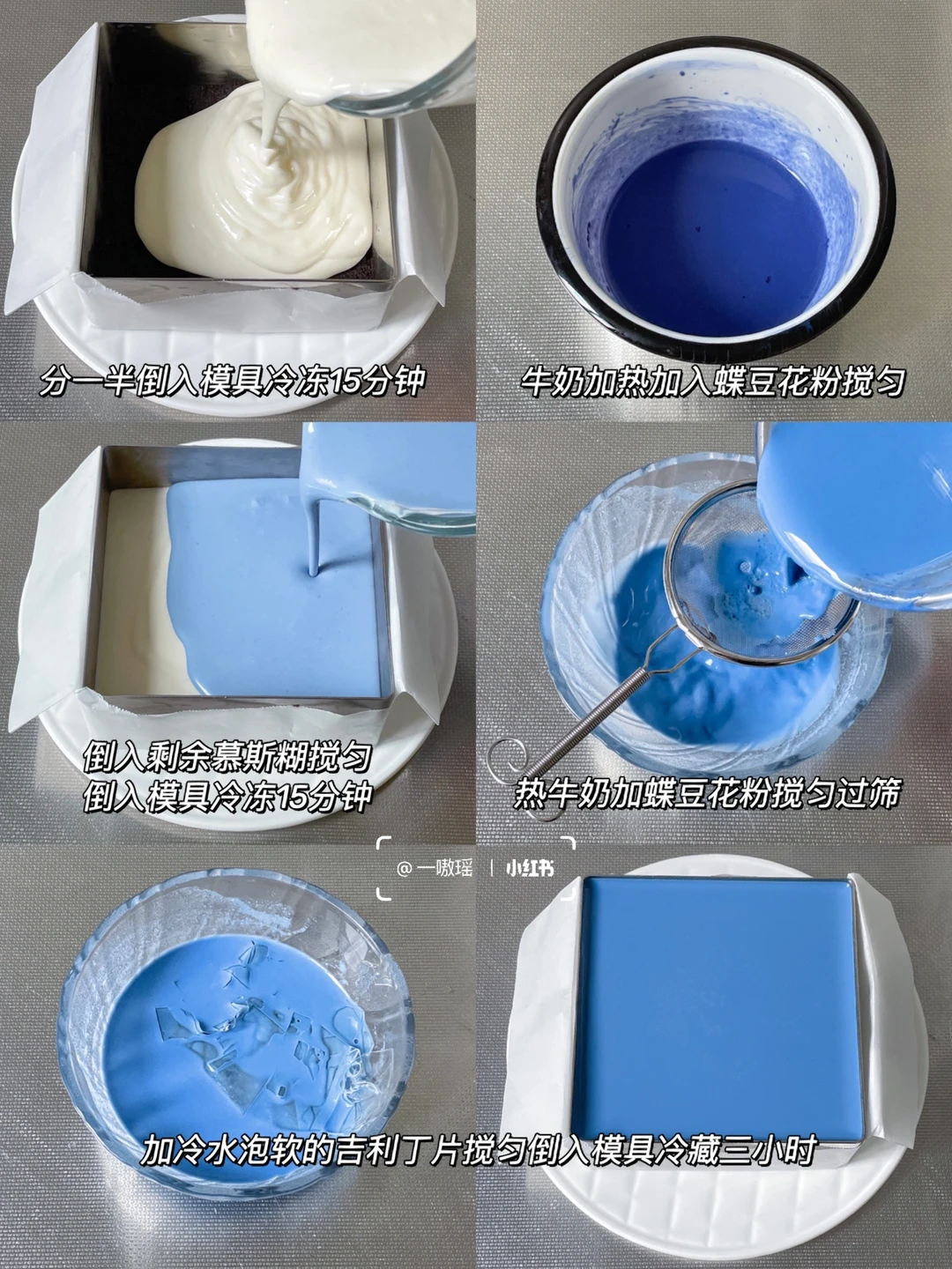 水牛奶80g 蝶豆花粉2g 吉利丁片5g 糖3g