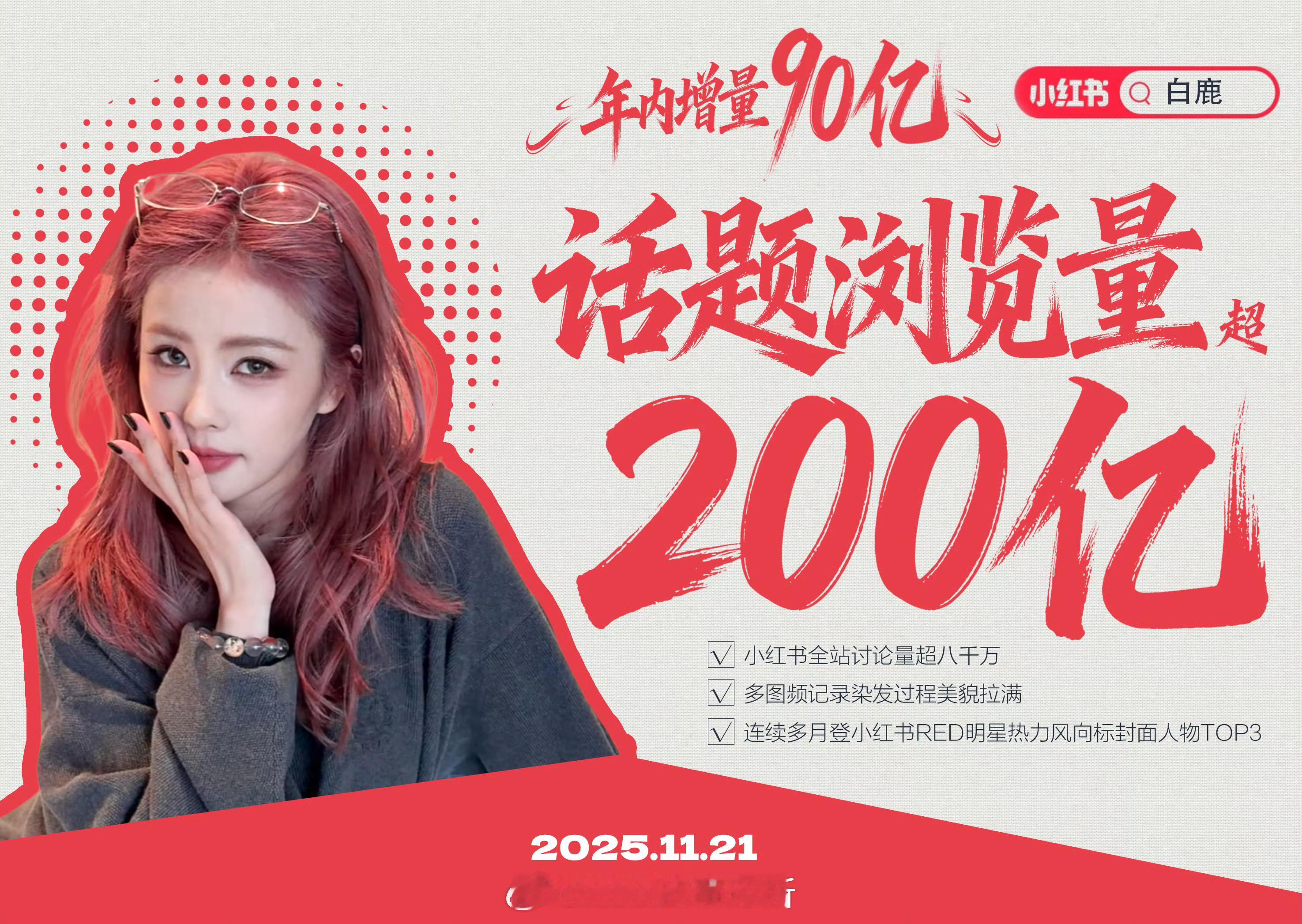 白鹿🍠话题浏览量超200亿 话题年内增量已达90亿她怎么各个平台的数据都好顶