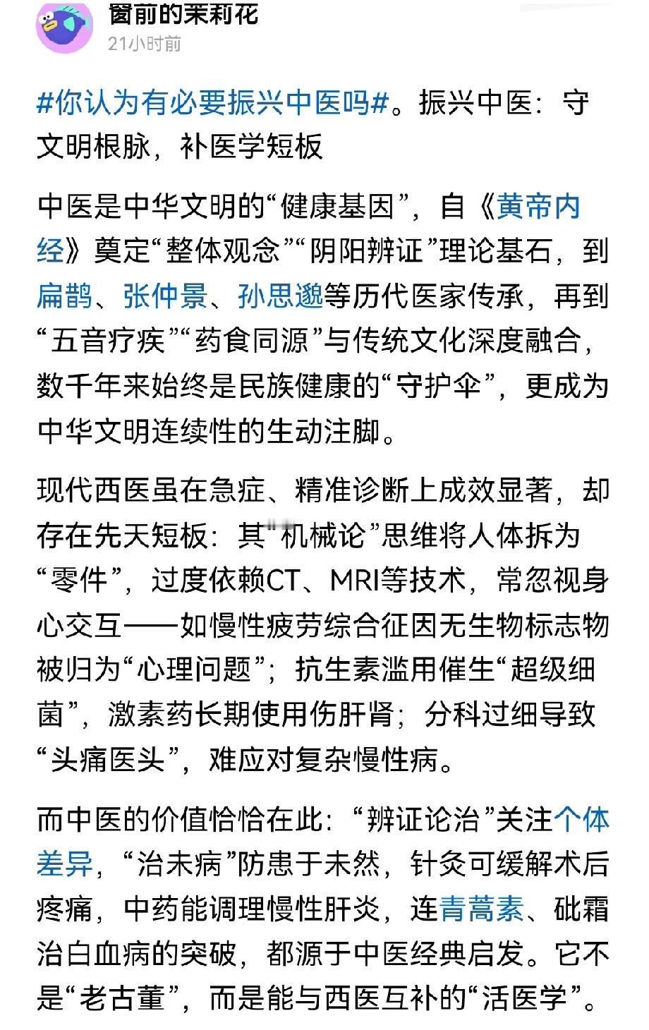 头条有问题是这样问的:你认为有必要振兴中医吗? 我觉得没必要。需要“振兴”的,都是式微的,比如京剧,可以也应该保护,但是“振兴”是没有可能的。中医一样。