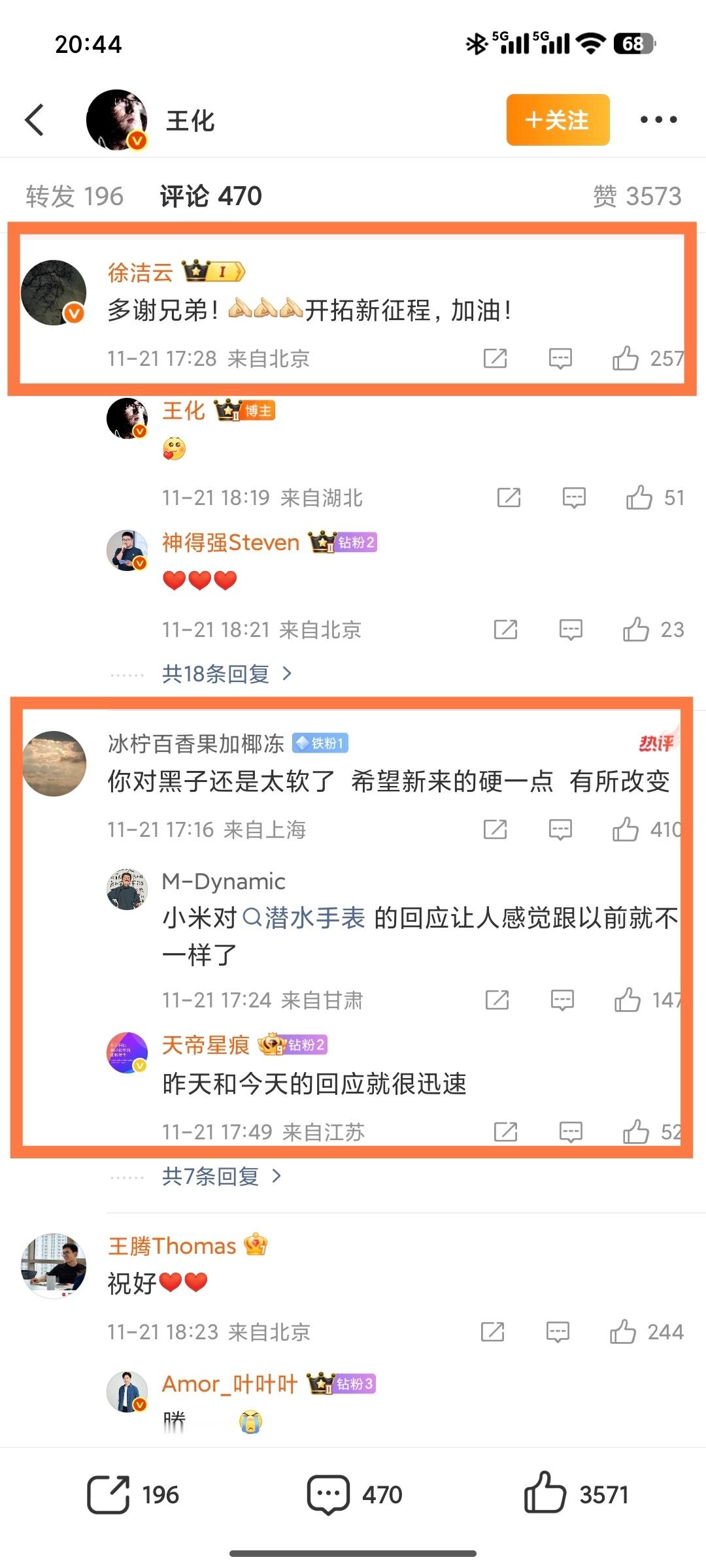 看王化评论区挺有意思,首先内部关系肯定很和谐,其次粉丝的留言也可以看出来大家希望小米以后针对各种突发事件能够快速回应。最后,王腾也留言了