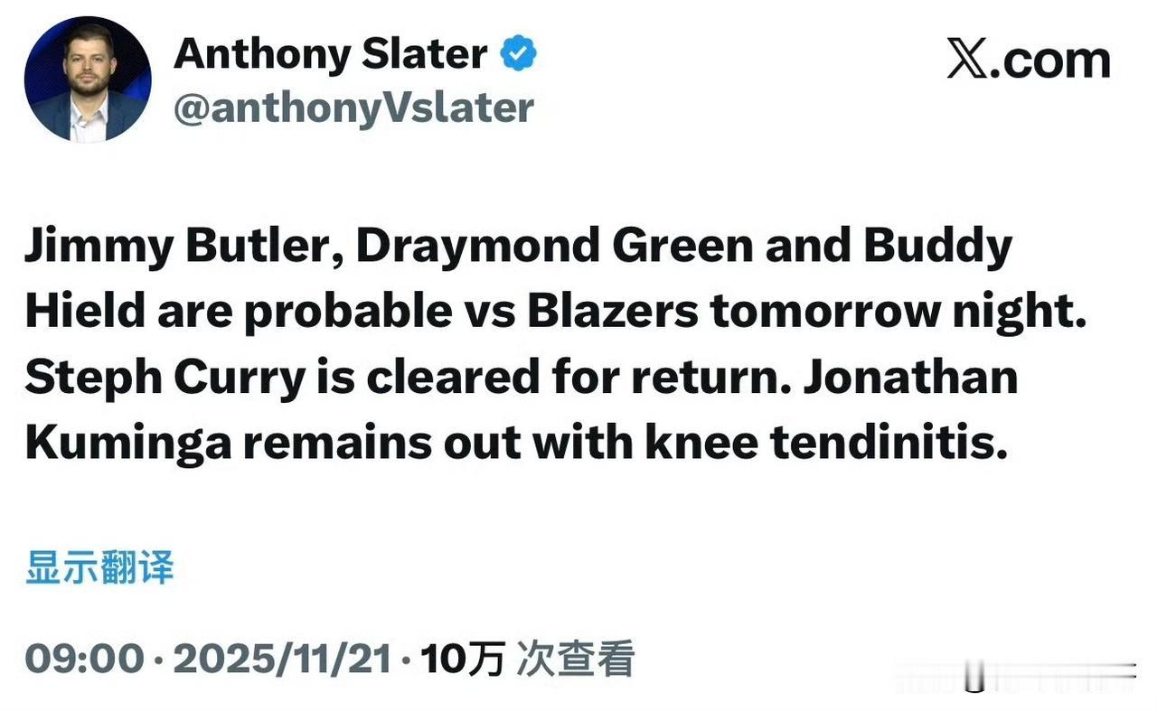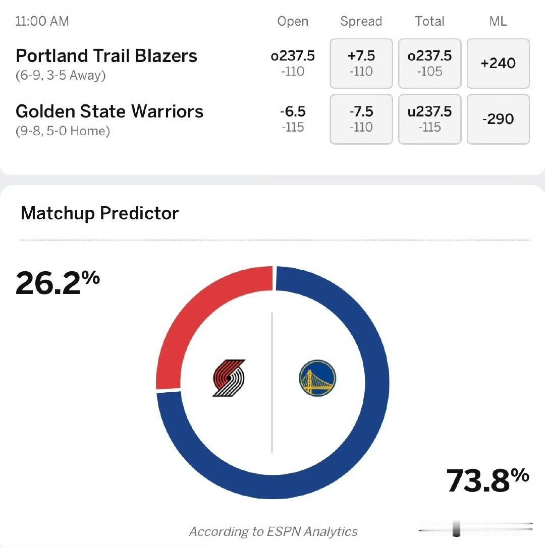 开拓者vs勇士比赛报告!!!开拓者对阵勇士比赛预测,勇士被看好! 北京时间22号周六上午11点,也就是今天最后一场比赛,勇士终于回到了主场迎战开拓者,目前勇士第八,开拓者第九,两者也是直接的竞争对手,一起来看下比赛预测和伤病报告吧。 开拓者方面: 亨德森、利拉德、塞布尔、韦斯利都缺阵,其他球员都可以出战。 勇士方面: 巴特勒、追梦、希尔德都大概率可以打,库里确定回归,而库明加继续缺阵。 目前从ESPN给出的结果看,勇士被认为以超过7成的概率能够拿下比赛,这是非常看好他们啊,勇士主场给出了-7.5。 巴特勒、追梦、库里和希尔德回到主场应该都能打了,对主场球迷怎么着也得坚持一下吧。 一起锁定今天上午11点,这个时间也比较晚,大家都可以睡到自然醒了! 开拓者阵容 勇士勇士队 西部勇士队 勇士队阵容 勇士队 金州勇士