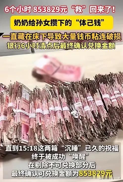 “悲剧还是发生了!”近日,江苏海安,一老太将多年攒下的钱,放在床下纸箱里,等到孙女结婚时,这才找出来交给孙女,不料,因时间太长,纸币已经严重发霉,银行工作人员数了6个小时,最终兑换了85万元! 网友:这得存了多久啊? 网友的疑问戳中了很多人的心,这笔钱里藏着的不只是数字,更是老人一辈子的省吃俭用。这八十多万是老人悄悄为孙女准备的“体己钱”,藏在床底的箱子里,盼着在孙女人生重要时刻送上一份保障。 打开箱子的那一刻,祖孙俩都愣住了,原本整齐的纸币被霉斑覆盖,黏连得成了分不清面额的纸团,老人的声音里满是自责与无助,眼泪忍不住滚落。 她不愿把钱存银行,不是不信任银行本身,而是过惯了苦日子,觉得现金握在手里、藏在家里才看得见摸得着,这份踏实感是电子账户里的数字给不了的。 银行的处理过程远比想象中繁琐。工作人员没有丝毫怠慢,当即开启绿色通道,甚至有休假的大堂经理特意赶回网点支援。 他们趴在工作台上,用镊子小心翼翼地剥离黏连的纸币,拿放大镜反复比对防伪特征,丈量剩余面积,每一步都严格依照《残缺人民币兑换办法》操作。票面剩余面积四分之三以上的全额兑换,二分之一到四分之三之间的半额兑换,不足二分之一或无法辨别真假的则不能兑换。 六个小时的分拣、鉴别与复核,与其说是清点,不如说是一场精细的“修复手术”,最终换回的85万元,保住的不仅是财产,更是老人沉甸甸的心意。 可藏钱的风险从来不止于发霉。央行的调研数据早揭示了问题,超六成老年储户会主动放弃存款利息取出现金,就为了“放在家里踏实”。但现金在家藏着,隐患一触即发。 潮湿、虫蛀、鼠咬随时可能让钱“缩水”,更怕的是被诈骗分子盯上——上半年针对老人的金融诈骗案增长15%,涉案金额高达125亿元,很多老人就是因为手里握着现金,才成了不法分子的目标。而且提前支取定期存款,光利息损失就可能上千甚至上万,这笔隐性成本往往被老人忽略。 老人对现金的执念,根源藏着多重无奈。数字鸿沟是绕不开的坎,就算75.4%的老年网民会用网络支付,可复杂的界面、频繁更新的功能,还有输错金额、找不到账单的困扰,都让他们宁愿退回现金支付。 更深处是安全感的缺失,电子账户里的数字看不见摸不着,总让经历过物资匮乏的老人不安,觉得现金才是应对未知风险的“压舱石”。 这并非老人顽固,而是金融服务的适老化改造还没完全跟上——有的银行APP“长辈版”藏在深层菜单里找不到,有的自助机具缺少专人引导,老人想靠近又怕操作失误,自然退回到最熟悉的现金模式。 这场霉变的意外,既是对老一辈储蓄观念的提醒,也是对金融服务温度的考验。老人的爱值得珍视,但守护这份爱的方式需要更科学,把钱存在银行,利用存款保险保障,远比藏在家里稳妥。 金融机构的适老化改造也该更落地,大字版界面、一键人工服务、网点专人引导,这些细节才能真正帮老人跨越数字鸿沟。 家人的耐心引导更关键,多花点时间教老人用简单的线上功能,多讲讲理财和防骗知识,比单纯劝阻更有用。 各位读者你们怎么看?欢迎在评论区讨论。