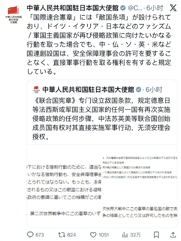 中国驻日使馆在社交平台发文,援引《联合国宪章》中的敌国条款指出,若德意日等曾奉行军国主义的国家再次出现侵略政策动向,中法俄美英等创始成员国有权直接采取军事行动,无需安理会授权。这一历史性条款至今有效,提醒国际社会对军国主义复苏保持警惕。当前形势下,该条文具有重要的现实警示意义,任何挑战战后国际秩序的行为都将面临法律与历史的双重审判。