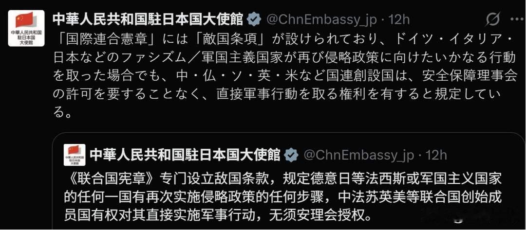 惊了!中国使馆这次直接引用‘敌国条款’,几乎等于明说日本仍是‘潜在敌国’!条款里白纸黑字写着中法苏英美五国能对日德意‘先斩后奏’,这玩意儿战后几十年没人提,如今突然变成外交武器——说明什么?台海问题已触到中国红线中的红线!日本要是还跟着美国拱火,中国完全可以凭这一条‘特权’动手。这已不是‘勿谓言之不预’,而是把法律依据、历史包袱和军事选项全摊牌了!