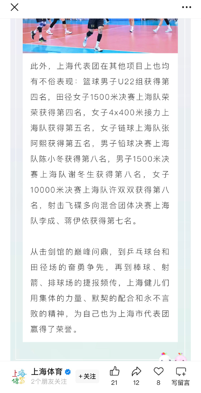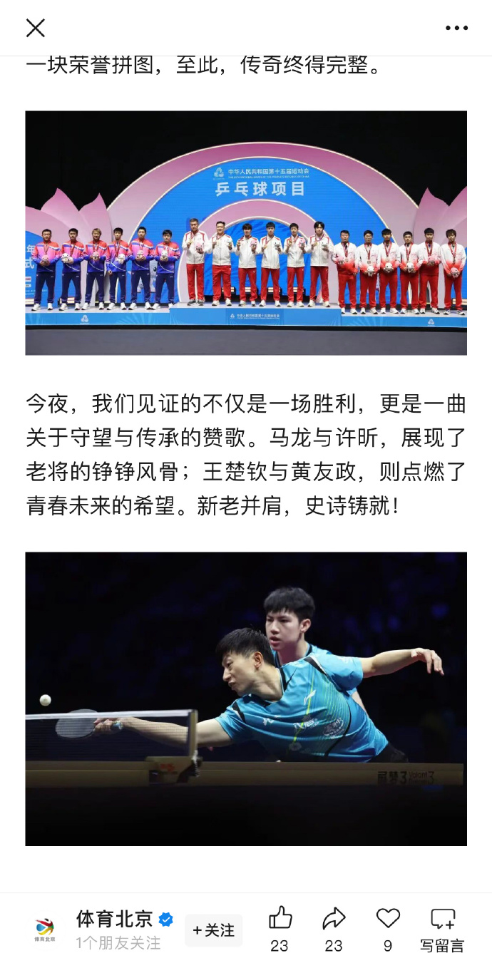上海市体育局祝贺男团亚军,11月20晚,第十五届全运会乒乓球男团冠军争夺战打响!由马龙、王楚钦、黄友政组成的北京男团对阵由樊振东 、许昕、周恺组成的上海男团,经过4潘鏖战,最终北京队获得了时隔32年的男团冠军。而北京、上海体育局也第一时间发出祝贺,为运动健儿打气。