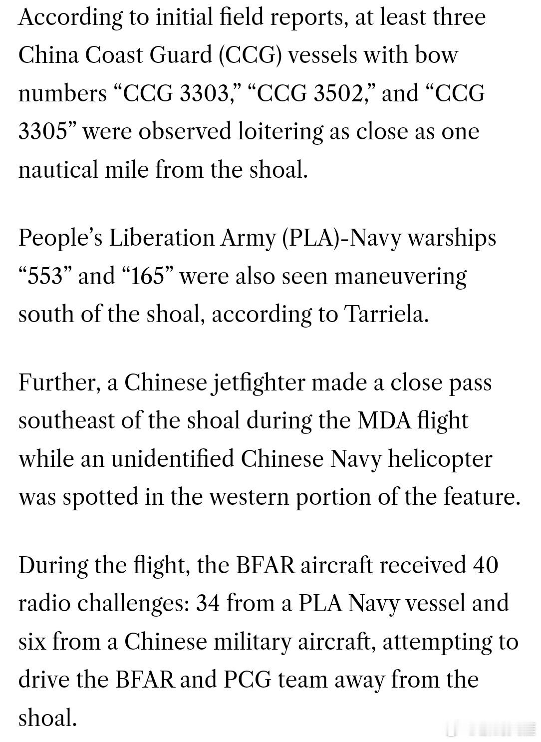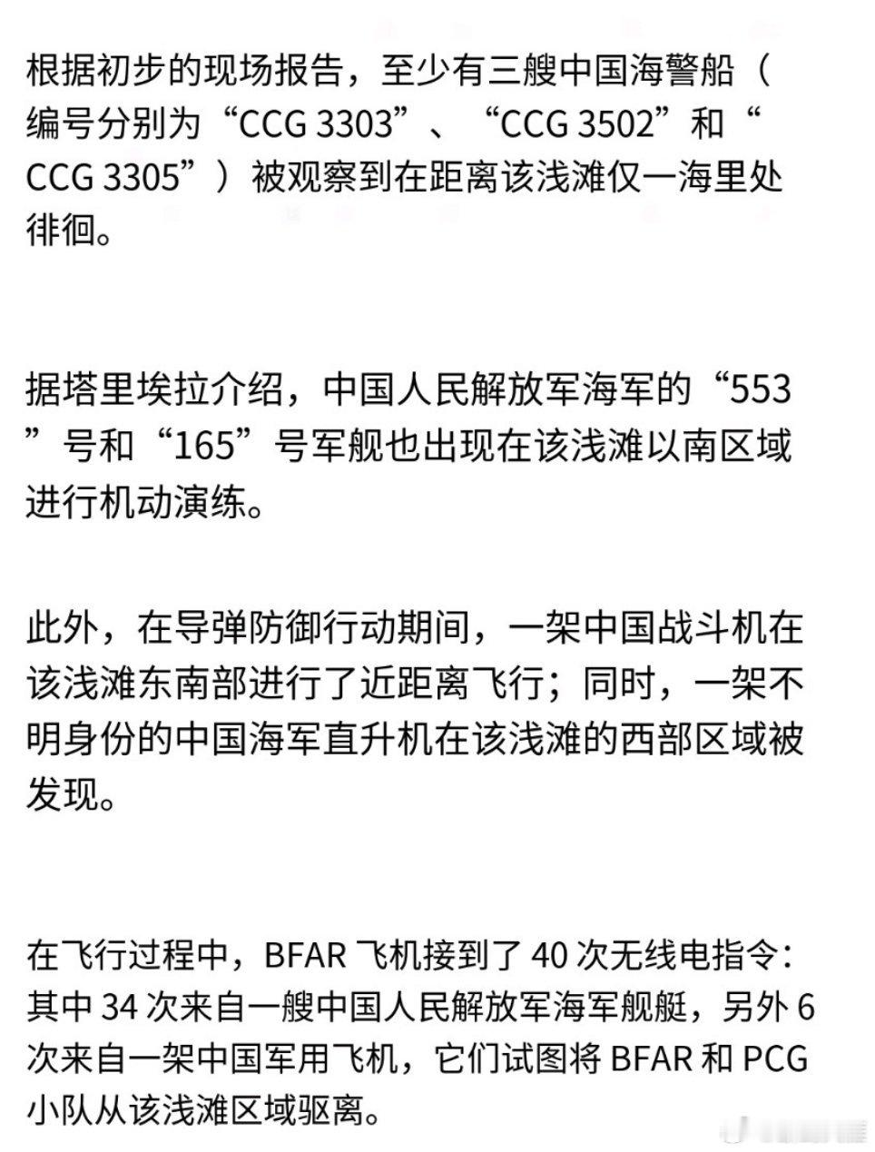 菲律宾马尼拉公报这样说:根据初步的现场报告,至少有三艘中国海警船(编号分别为“CCG 3303”、“CCG 3502”和“CCG 3305”)被观察到在距离该浅滩仅一海里处徘徊。据塔里埃拉介绍,中国人民解放军海军的“553”号和“165”号军舰也出现在该浅滩以南区域进行机动行动。此外,在导弹防御行动期间,一架中国战斗机在该浅滩东南部进行了近距离飞行;同时,一架不明身份的中国海军直升机在该浅滩的西部区域被发现。在飞行过程中,BFAR 飞机接到了 40 次无线电指令:其中 34 次来自一艘中国人民解放军海军舰艇,另外 6 次来自一架中国军用飞机,它们试图将 BFAR 和 PCG 小队从该浅滩区域驱离。