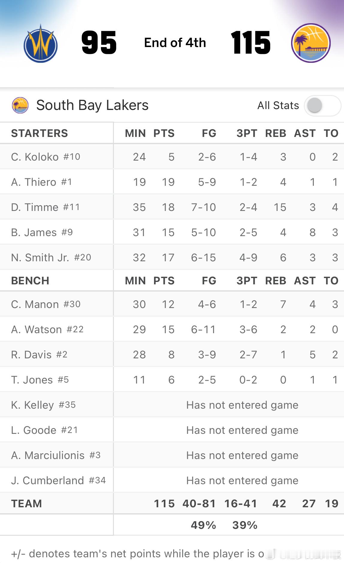 南湾湖人115-95击败圣克鲁兹勇士!阿杜-迪耶罗出场19分钟,9中5,罚球5中5拿下19分4板3抢断;布朗尼15分8助,朱蒂米18分15板,尼克-史密斯17分