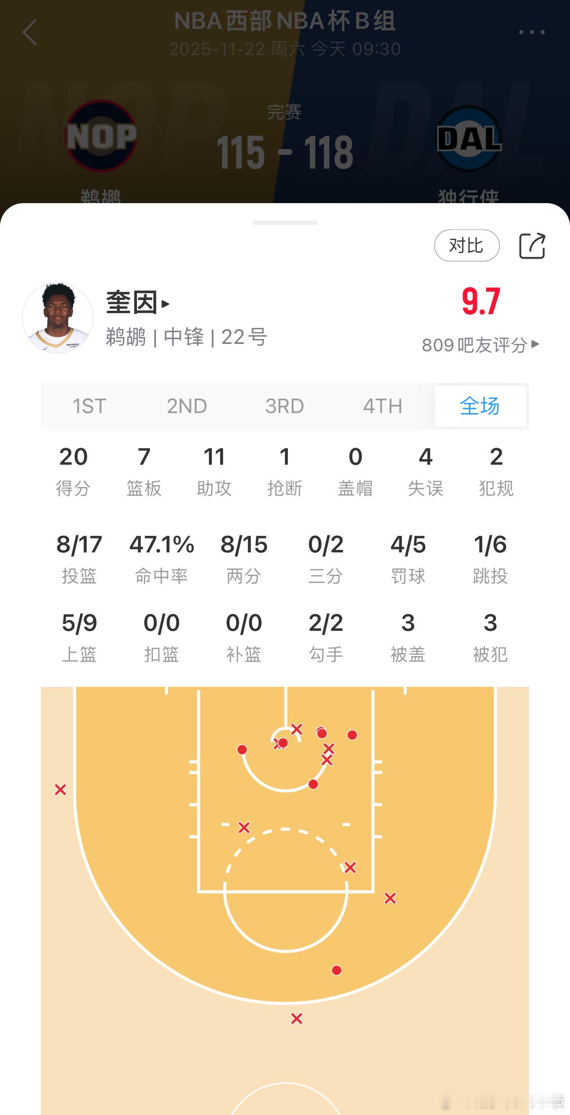13号秀奎因本场20分11助攻,是NBA历史上最快拿下20分10助攻的中锋。