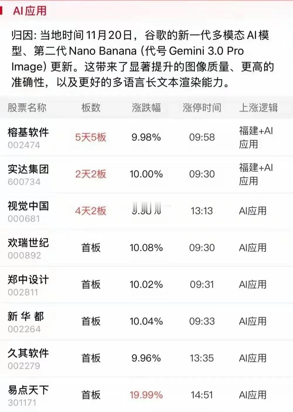 周末复盘:AI应用-弱势行情下市场选择的绝对主线!周五的市场腥风血雨,走出了明显股灾的感觉,但是有一个方向却是很有韧性,板块依然出现了8只涨停,这样的表现是超强的,特别是午后板块的逆势拉升强势表现,那么接下来市场一旦转暖,这个方向就很可能走成绝对的主线!1、实达集团为什么先讲实达,毫无疑问这只个股是AI方向昨天最强个股,消息面上是有谷歌新一代AI模型的更新,而实达是走出了大幅高开秒板的走势,而且全天都是稳稳封住涨停!盘后的龙虎榜买盘5个席位都是活跃游资席位,买入都在6千万左右,卖盘榜一中金青岛北路卖出1.4亿,很明显是潜伏资金,其余卖盘算是短期获利盘离场,再加上3日榜中新闸路的2亿,西大街的6千万,这个榜单其实覆盖了近期多个情绪游资和量化席位,这样的榜单是非常不错的,再叠加实达的形态以及板块的强度,隔日就是大单一字板预期,而一旦它开出一字板,对于整个AI方向的带动肯定会非常明显,毫无疑问它是AI方向周五的日内最强个股!2、榕基软件榕基是AI应用方向最高标,周四PK掉浪潮晋级的形态非常强势,但是周五早盘竞价的低开表现是非常恶劣的,这也导致开盘后不少资金直接砸盘兑现走人,但是考虑到实达的强势,AI应用多只个股在早盘很快出现了异动拉升上板,榕基很快就有资金强势承接做多,并且迅速走出冲板动能,虽然在板上多次出现分歧,但是最终还是在早盘走出了一个放量的5连板走势!盘后的龙虎榜买盘也是以游资为主,卖盘多为之前的获利盘离场,这是一个比较强势的资金接力换手,再加上榕基是AI方向的最高标,隔日如果AI方向继续强势,它走出弱转强的概率还是非常大的,从周五的形态上看,41%的实际换手是非常充分的,在这个位置充分换手并不是坏事,一旦隔日实达开出强势一字板,榕基竞价有资金引导的情况下很可能持续走出来,它唯一的弱点就是次高标,如果中水最终没有回封,它晋级的概率会更大,但是一旦中水竞价负反馈,榕基竞价不是超预期的话肯定会受到影响,所以对于榕基来说,隔日能不能走出来,竞价的表现非常关键!3、视觉中国午后AI应用方向走出了逆势拉升的表现,视觉是最早启动直线封板的那一个,而且它封板后,带动了多只AI应用方向个股拉升封板,虽然最终成功的没有几只,但是它的表现明显起到了一个情绪引导作用,那么它隔日得表现就非常有看点!盘后的龙虎榜成都系和新闸路两个短线情绪游资买入都是1个亿左右,买盘还有两个机构做T,卖盘清一色的机构做T,这样的榜单就完全是游资情绪的拉升带动市场合力去封板了,从这只个股18日的龙虎榜看,也是游资拉板,机构做T,这就说明视觉里面一直是有机构引导的,周五游资的点火就有加速趋势,一旦周一市场认可AI应用这一方向,视觉竞价又是明显的大幅高开,它走出来的概率并不小,而且它这个反包板量能释放的还是比较充分的,隔日高开过前高毫无压力,所以对于视觉来说,只要周一竞价给到了情绪,肯定会有资金疯狂来接力,形成合力上板的概率是非常大的!4、久其软件久其是跟随视觉走出直线拉板的走势,同时拉板的还有一只掌阅,但是掌阅之后出现了炸板兑现,久其最终稳稳封死涨停,走出了一个突破放量的首板形态!盘后的龙虎榜西大街这个量化买入1.2亿,其余买盘都是机构做T,卖盘同样如此,这算是一个一家独大的榜单,西大街这个席位一直是首板收割机,但是能顶住它砸盘走出来的个股都能高看一眼,所以隔日久其会不会有资金跟随做多是一大看点,毕竟AI应用从浪潮到榕基,貌似尾盘带软件的小盘股很受资金欢迎,这可能就是量化的杰作,但是只要后续有资金认可,炒作就可能持续,所以对于久其来说,它虽然不如视觉强势,但是不管股价还是市值都是比较适合炒作的妖股,而且放量突破的形态也比早盘缩量上板的欢瑞、郑中和新华都接力的风险性要低,再就是它辨识度也要高于早盘几只首板,所以隔日如果AI应用方向能持续走出来,久其开盘的表现是可以重点关注的!5、浪潮软件浪潮是AI应用第一波炒作的绝对核心龙头,但是3进4被榕基卡位成功后兑现,周五在竞价不弱的情况下走出了明显修复,尾盘跟随板块情绪上板后多次被先手资金砸盘,最终走出了一个炸板走势!盘后的龙虎榜买盘中信安徽分和学院南路两个游资席位接力入场,西大街也有参与,卖盘被套的作手新一、近良路止损离场,周四的买二金沙江路还在格局,这个榜单其实还算不错,浪潮被砸有情绪因素影响,毕竟它在周五算是后排跟风,大盘情绪不好的情况下一些被套资金选择割肉再正常不过了,但是如果隔日AI方向继续强势,大盘有修复预期,浪潮或许会依然有资金去承接做多,毕竟连续两天高换手其实资金置换非常充分,浪潮辨识度还非常好,不排除它会有二波机会,所以对于浪潮来说,隔日早盘会不会有资金强承接是一大看点!文中的内容仅为分享和交流,不作为实际操作建议!