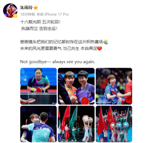 11月22日,朱雨玲发文:十六载光阴 五次轮回!执旗而立,告别全运! 谢谢镜头把我们的记忆都封存在这片炽热赛场[收到] 未来的风光更需要勇气 与己共生 本自具足[心] Not goodbye— always see you again.