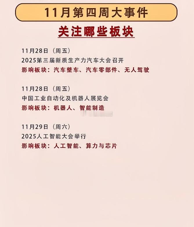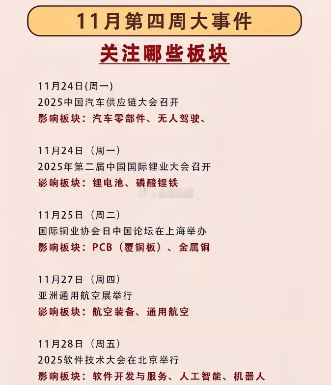 下周热点板块前瞻:聚焦六大高潜力赛道根据11月第四周(24-29日)行业重要会议及展会安排,结合新质生产力与智能化升级主线,梳理出六大具备短期催化潜力的板块及对应核心标的:一、汽车零部件/智能驾驶$拓普集团 sh601689$ :智能驾驶线控底盘核心供应商,深度绑定主流车企旭升集团:新能源车轻量化部件领先企业,技术契合汽车轻量化趋势文灿股份:一体化压铸技术先锋,受益整车制造效率提升二、锂电池/储能$宁德时代 sz300750$ :全球动力电池龙头,磷酸铁锂技术持续领先比亚迪:刀片电池技术开创者,实现电池-整车全链条布局亿纬锂能:动力与储能电池双轮驱动,技术路线多元化三、PCB/铜材$生益科技 sh600183$ :覆铜板领域国内龙头,直接受益铜材应用拓展沪电股份:高端PCB领先企业,汽车电子与通信需求强劲江西铜业:铜产业链上游核心资源企业,行业风向标四、通用航空中航沈飞:军机与通航装备核心制造商,技术实力雄厚中航西飞:民用航空装备主力,大飞机制造领军企业洪都航空:通用航空整机及配套服务重要供应商五、机器人/工业自动化埃斯顿:国产工业机器人领军企业,自动化解决方案完善汇川技术:工业自动化控制龙头,伺服系统国内领先绿的谐波:机器人核心零部件专家,减速器技术突破者六、人工智能/算力科大讯飞:AI应用层领军企业,大模型技术持续迭代中科曙光:算力基础设施核心供应商,国产服务器主力用友网络:企业级软件服务龙头,AI赋能企业管理升级布局逻辑本周系列行业大会密集召开,涵盖汽车供应链、锂业、铜业、通用航空、新质生产力汽车、工业自动化及人工智能等重点领域,预计将释放产业政策与技术升级新动向。对应板块均处于产业升级核心轨道,相关龙头企业在技术积累、产能布局和市场地位方面具备明显优势,有望成为市场关注焦点。本文为公开信息整理,不构成投资建议。市场有风险,投资需谨慎。