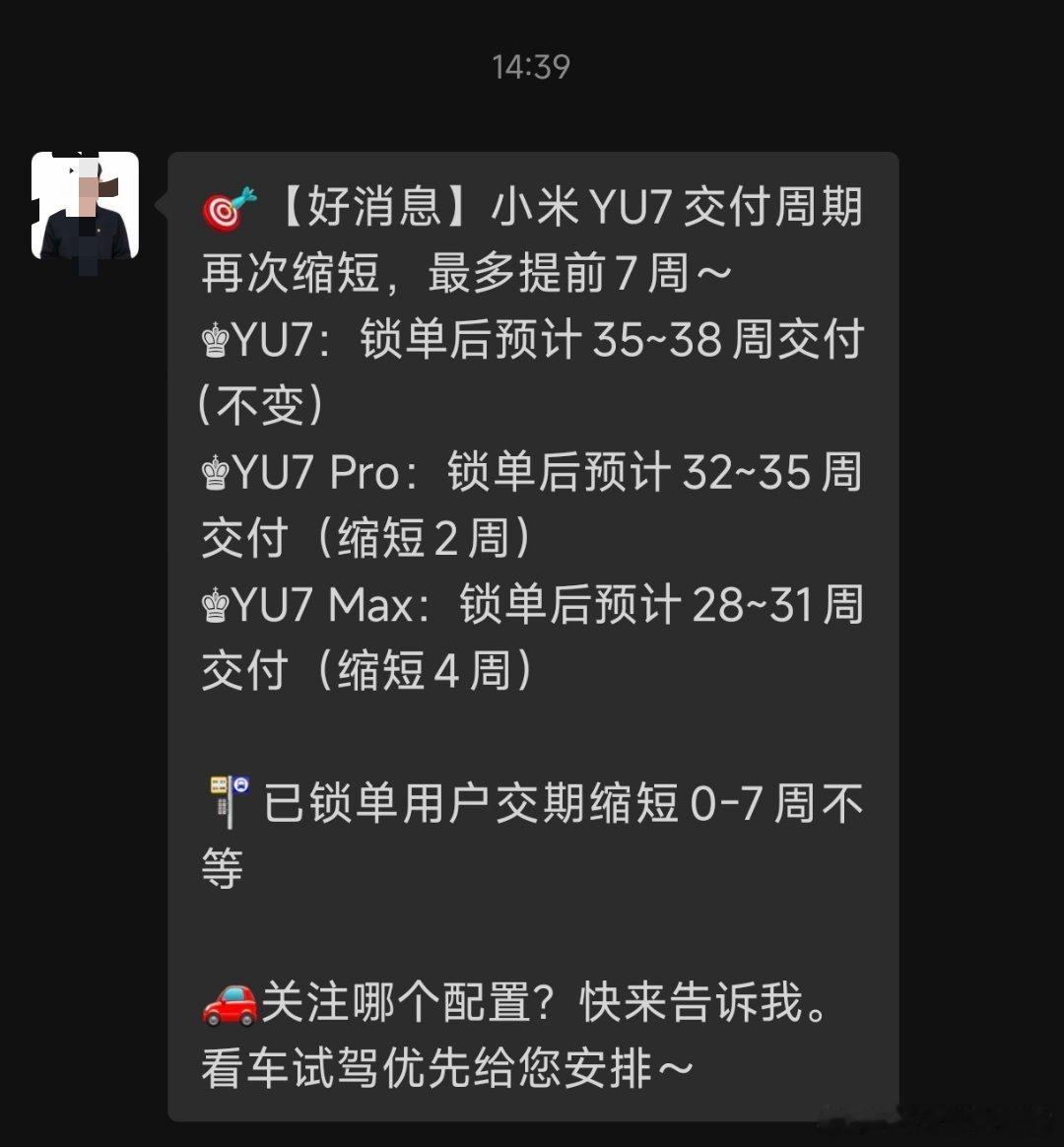 惊喜吗?小米YU7交付周期又双叕缩短了,最高7周现在锁单,最短交付周期为28周(半年多)