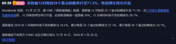 美联储降息概率飙升至 71%,12 月可能真的放水,但别高兴太早!历史显示,消息前机构吸筹,利好后割韭菜可能重演。真正的大戏在 2026 年 1 月,长期放水周期在路上。散户盯着短期只会错过建仓机会,稳健策略:分批买入,跌敢补,涨不贪,布局 2025 牛市周期。
