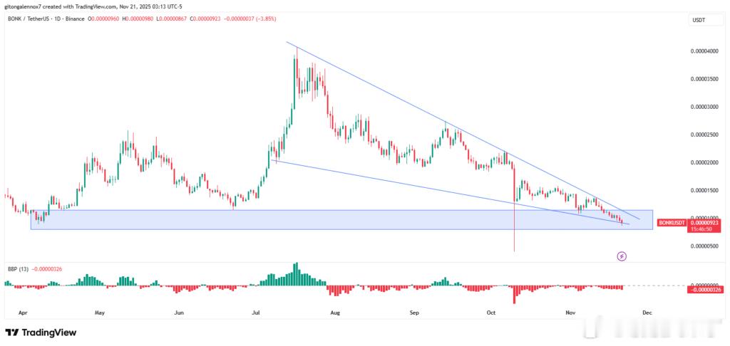 即将迎来 ETP 上市,欧盟投资者可 1:1 持有该币。大户们已在低位大量建仓,交易活跃度提升。尽管短期价格下跌约 10%,整体市场偏弱,但技术形态显示,BONK 有望突破长期盘整区间。历史经验表明,每次盘整结束都有强势反弹,这一次可能重演。散户观望,鲸鱼行动,下一轮行情可能正在酝酿。