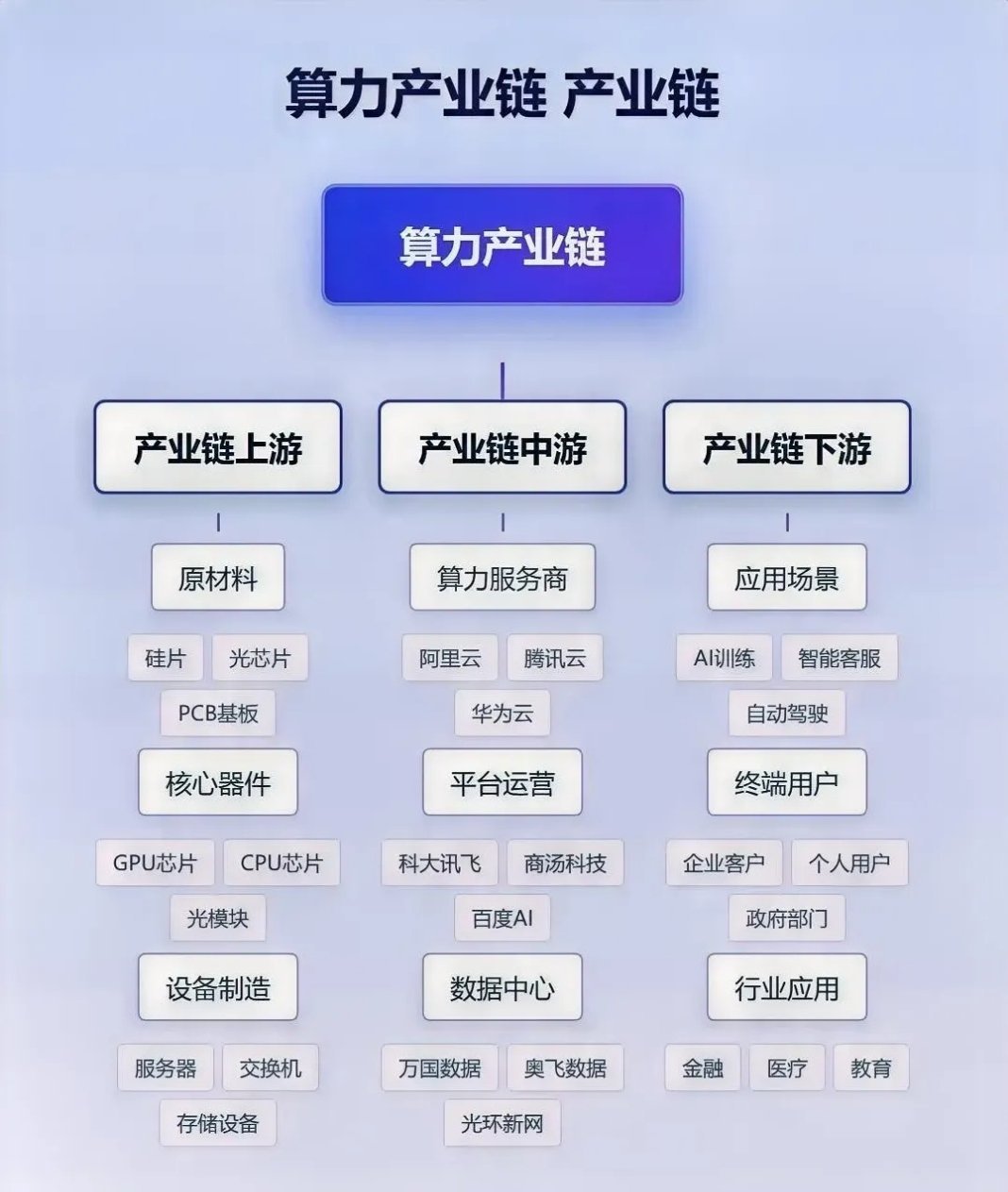算力产业链全景解析:从硬件到应用,20只核心标的瓜分万亿赛道!算力作为数字经济与AI产业的核心引擎,已形成“上游硬件支撑-中游服务运营-下游场景落地”的完整产业链生态。上游聚焦基础设施建设,提供PCB基板、建设,提供PCB基板、GPU芯片、服务器等核心硬件;中游承担算力输出与部署,涵盖算力服务、数据中心运营等环节;下游则延伸至AI训练、自动驾驶、金融科技等多元场景,全方位支撑数字化产业的高速发展。以下是全产业链核心标的深度梳理,助力把握行业增长红利:一、上游:算力基础设施核心硬件,筑牢产业根基上游是算力产业的“硬件基石”,涵盖材料、核心器件、设备制造三大环节,直接决定算力输出的效率与稳定性。1. 沪电股份:高端PCB基板龙头,算力设备核心载体材料供应商,产品精准适配服务器、数据中心硬件需求,高端领域市占率领先,是材料端核心受益企业。2. 生益科技:国内覆铜板领军企业,为PCB基板提供核心原料,产品广泛应用于服务器、交换机制造,是算力原材料环节的关键支撑标的。3. 寒武纪:国产AI芯片龙头,专注GPU芯片研发,其智能芯片可满足算力基础设施的高算力运算需求,在国产替代浪潮中占据核心地位。4. 景嘉微:军用GPU龙头企业,积极拓展民用算力芯片市场,产品适配部分算力硬件运算场景,是核心器件环节的重要参与者。5. 中际旭创:全球高速光模块龙头,产品为算力设备间数据传输提供高带宽支撑,完美适配数据中心、服务器的传输需求,是核心器件环节的标杆企业。6. 新易盛:聚焦高速光模块研发与生产,产品覆盖多速率规格,支撑算力设备高效数据交互,在全球市场份额稳居前列,是该领域重点受益标的。7. 中科曙光:国内服务器龙头企业,算力服务器产品为数据中心、AI训练提供核心硬件支撑,在国产算力设备替代进程中地位突出。8. 浪潮信息:全球服务器领域头部企业,产品涵盖通用及AI专用算力服务器,支撑大规模算力集群部署,是设备制造环节的核心力量。9. 紫光股份:国内ICT设备龙头,交换机产品为算力集群提供稳定网络连接,适配数据中心、服务器组网需求,是设备制造环节的重要支撑。二、中游:算力服务与运营,承接供需桥梁中游是算力产业的“中枢枢纽”,负责将上游硬件转化为可落地的算力服务,涵盖算力租赁、平台运营、数据中心托管等核心环节。10. 阿里巴巴:阿里云作为国内云计算龙头,提供全方位算力租赁、云服务解决方案,覆盖AI训练、企业数字化转型等多元需求,是中游服务环节的核心主体。11. 腾讯控股:腾讯云凭借强大的技术储备,提供算力基础设施服务,支撑AI研发、企业数字化运营等场景,是中游服务环节的头部标的。12. 科大讯飞:国内智能语音龙头,其AI平台为下游应用提供核心技术支撑,涵盖智能客服、AI训练等场景,是中游平台运营的标杆企业。13. 商汤科技:计算机视觉AI领军企业,AI平台聚焦视觉类应用落地,支撑自动驾驶、智能安防等场景的算力需求,是平台运营环节的重要参与者。14. 万国数据:国内第三方数据中心龙头,为算力服务商提供硬件托管、运维服务,适配云计算、大规模AI训练的部署需求,是数据中心环节的核心标的。15. 奥飞数据:专注第三方数据中心运营,为算力硬件提供安全稳定的托管环境,支撑企业数字化、云计算的算力落地,是数据中心环节的重点受益企业。三、下游:多场景应用落地,释放算力价值下游是算力产业的“价值终端”,涵盖AI训练、自动驾驶、金融科技、医疗信息化等多个高景气领域,是算力需求的核心来源。16. 三六零:国内互联网安全龙头,依托算力支撑AI安全防护、大模型训练等应用,为企业及个人提供全方位安全解决方案,是AI训练场景的受益标的。17. 卫宁健康:医疗信息化领军企业,借助算力实现医疗数据智能化分析、智能诊疗落地,推动医疗行业数字化升级,是医疗领域核心受益主体。18. 东方财富:互联网金融龙头,利用算力支撑金融数据分析、智能投顾服务,优化个人及企业金融服务体验,是金融领域算力应用的标杆企业。19. 德赛西威:车载电子龙头企业,依托算力支撑自动驾驶的感知、决策运算,助力智能汽车产业发展,是自动驾驶场景核心受益标的。20. 中科创达:智能汽车操作系统领军者,借助算力优化车载智能系统运算效率,适配自动驾驶软件部署需求,是该场景的重要支撑企业。产业链核心逻辑总结算力产业链已形成“硬件支撑-服务运营-场景落地”的闭环生态,上游硬件的技术迭代(如GPU芯片、高速光模块)、中游服务的效率提升(如算力租赁、数据中心托管)、下游场景的需求爆发(如AI大模型、自动驾驶),共同驱动行业规模持续扩张。梳理的20只核心标的,均覆盖产业链关键环节:上游聚焦硬件核心竞争力,掌握材料、器件、设备制造的核心技术;中游依托平台与资源优势,承接算力供需转化;下游深耕高景气应用场景,直接受益于算力需求放量。随着AI、数字化产业的持续渗透,算力作为核心基础设施的战略地位将进一步凸显,全产业链标的有望同步分享行业发展红利,具备长期成长潜力。