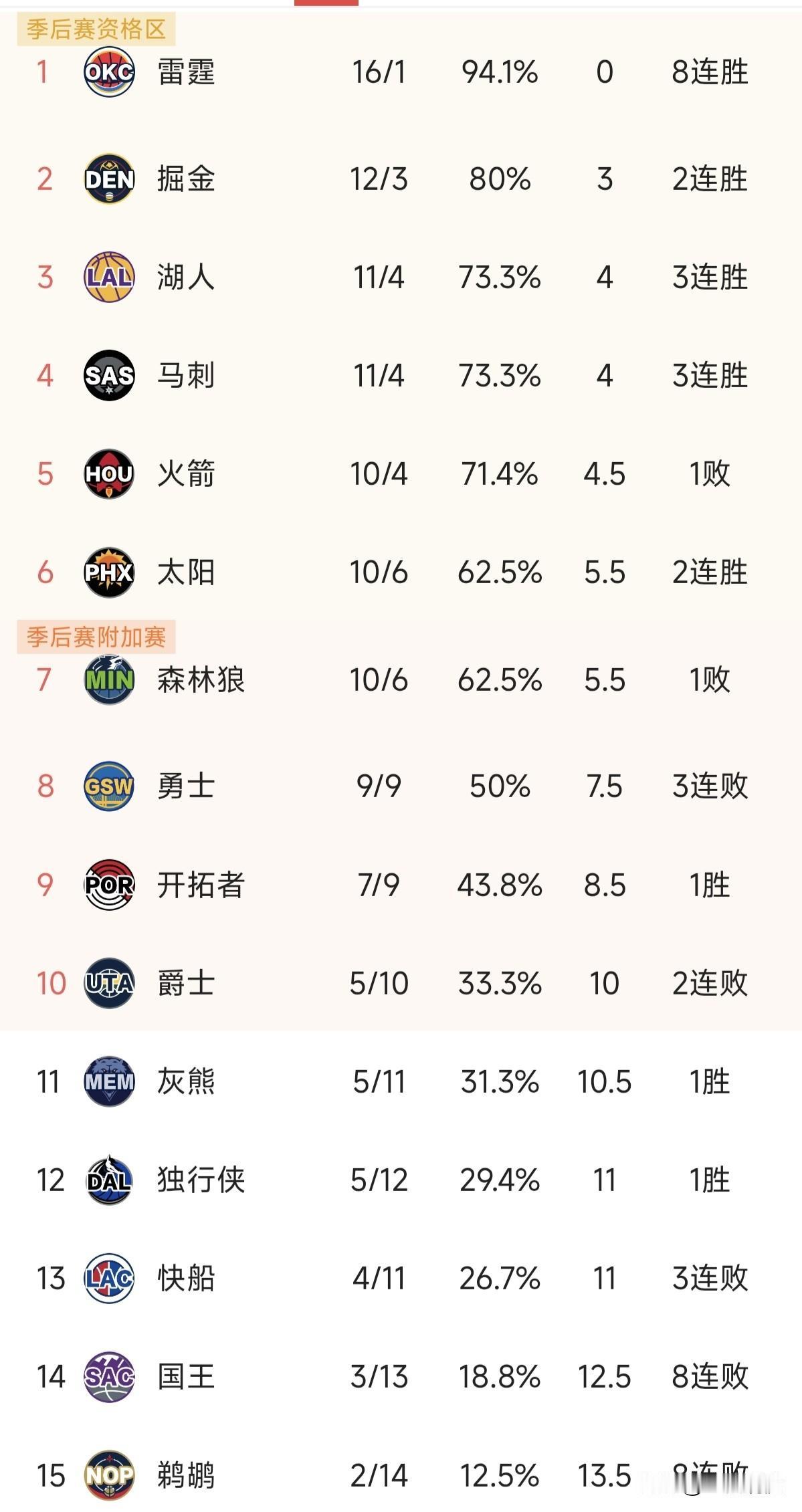 雷霆现在有73胜勇士那个赛季感觉,又拿到了一个八连胜,目前16胜1负是真的遥遥领先其他球队,国王和鹈鹕喜提八连败,火箭今天输球直接跌出前四,现在来看掘金是坐稳西部第二了。湖人最好的机会来了,詹姆斯复出,全员健康有看头!