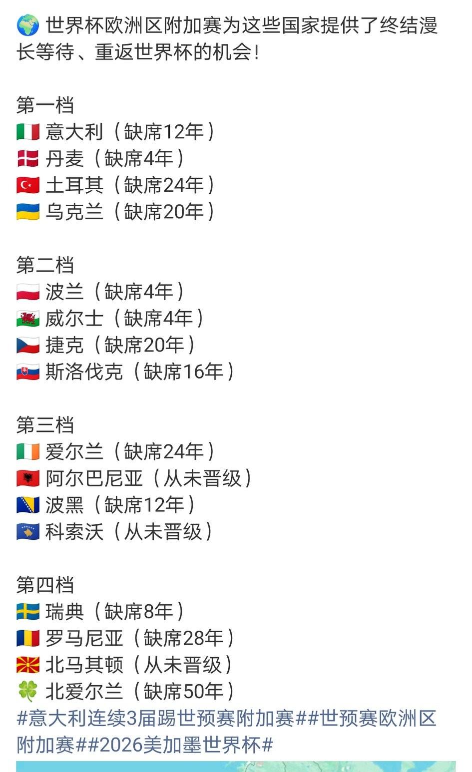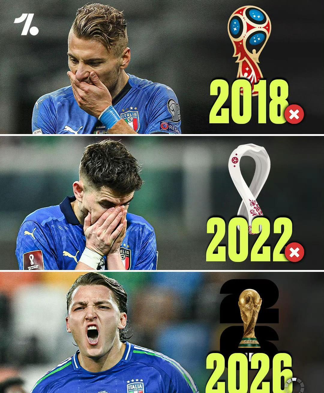 想不到意大利已经连续8年未踢世界杯!甚至有欧洲强队缺席世界杯50年!意大利连续3届踢世预赛附加赛! 2018世预赛,意大利与西班牙同组,最终排名小组第二。附加赛对阵瑞典,总比分0-1无缘晋级。 2022世预赛,意大利与瑞士同组,最终排名小组第二。附加赛半决赛0-1不敌北马其顿。 2026世预赛,意大利与挪威同组,最终排名小组第二。附加赛半决赛对阵北爱尔兰。有希望吗?