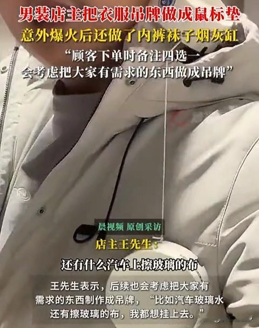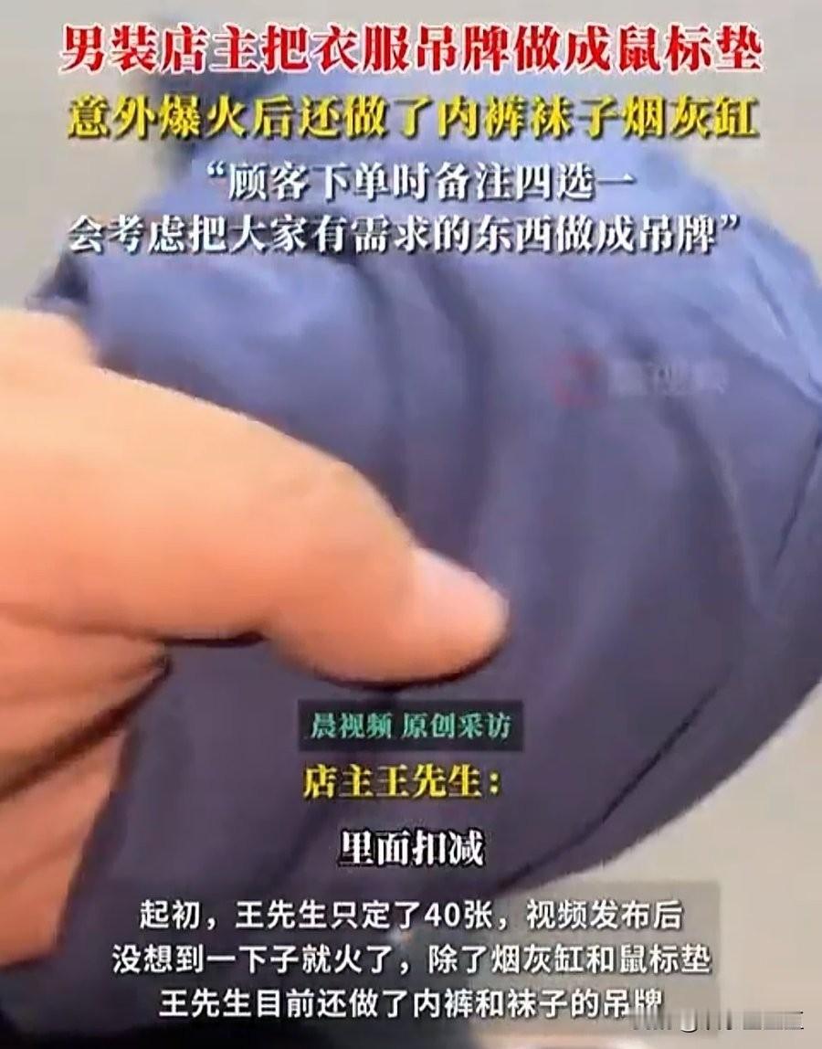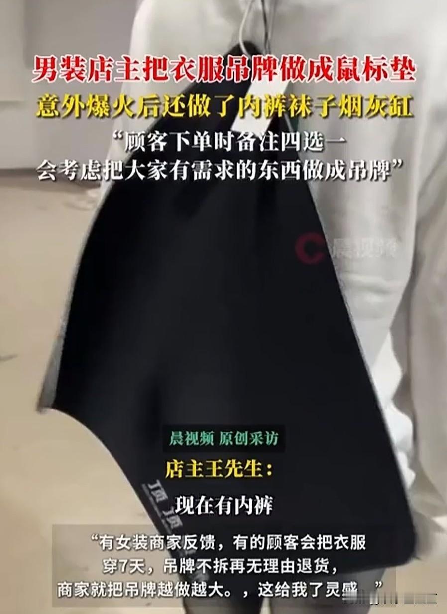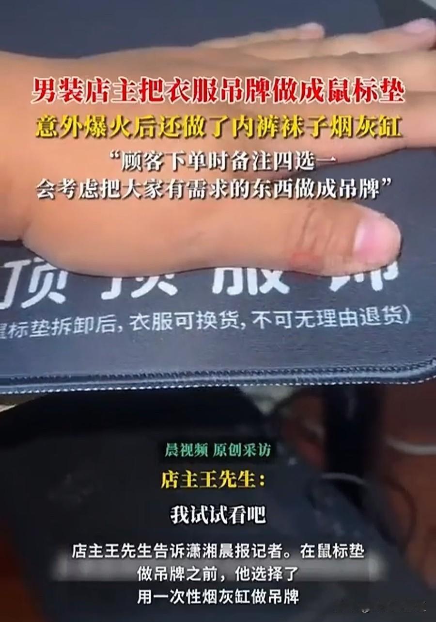 为防止服装被恶意退货,男装店主神操作!将吊牌做成鼠标垫、内裤、袜子、烟灰缸等,这一操作衣服直接爆单。 谁规定吊牌只能是小纸片?江苏常州一位男装店主,直接把吊牌玩出了新高度! 原本只是想效仿女装大吊牌,规避“穿7天不拆牌退货”的痛点,结果被网友一句“要鼠标垫尺寸”点醒,42cm*49cm的超大鼠标垫吊牌横空出世。没成想,开店才一周,这波创意直接引爆销量,40单秒空后累计卖出300+单,连备货都赶不上订单速度。 更贴心的是,除了鼠标垫,还能选内裤、袜子、烟灰缸当吊牌,下单备注即可任选其一。即便鼠标垫吊牌成本要10元,店主也坚持不从顾客身上加价,全从利润里扣除。用他的话说:“卖衣服也是卖服务体验,把吊牌做成大家需要的便民好物,才能让人记住。” 现在店主还在筹备汽车玻璃水、擦玻璃布款吊牌,这波把“实用主义”拉满的操作,谁看了不说一句“太会了”!买件衣服还能白嫖刚需好物,这样的宝藏店铺,难怪大家抢着下单。 这一创意既解决痛点又戳中需求,是低成本高回报的双赢操作! 从实际价值来看,既用大尺寸吊牌规避了“穿后无理由退货”的行业痛点,又把闲置的吊牌功能换成了内裤、鼠标垫等刚需好物,让顾客觉得“买衣附赠实用礼”,性价比感知直接拉满;从传播角度,“吊牌变实用品”的反差感自带话题度,容易引发自发分享,相当于免费获得流量;再加上店主不加价的诚意,还能积累口碑和复购。