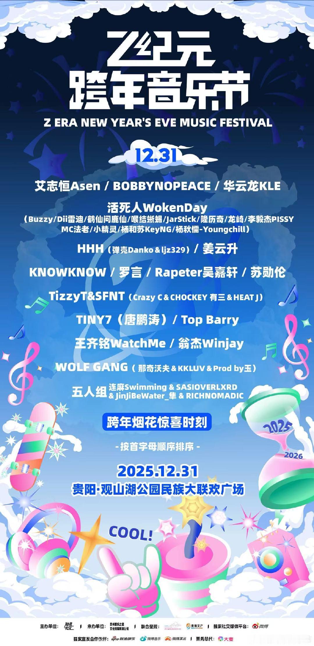Z纪元贵阳跨年音乐节官宣了好多rapper啊!期待!烟花与音浪同步点亮,整夜的节拍、整夜的能量,一起狂欢,一起跨年!我们不见不散~