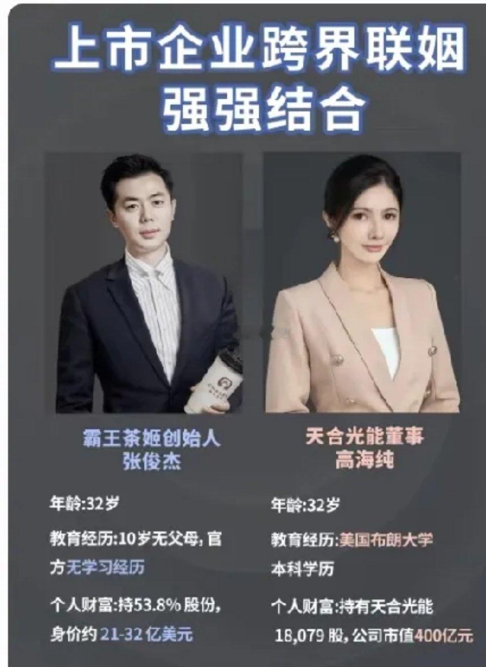 现在看来,有钱人挑媳妇还真有门道。张俊杰17岁当茶饮店员,凌晨4点煮茶切水果,3万块接盘亏损店,摆摊发传单把日销30杯做到8000杯,8年把霸王茶姬做上市,全球6000多家店市值近180亿,全靠自己拼出来的。高海纯是天合光能千金,布朗大学毕业不躺平,回公司从基层干起,一步步当联席董事长,带400亿企业转型,能力不输创一代。这样的两个人走到一起,哪是普通联姻?分明是两个行业尖子手组队打配合,这哪能不叫人羡慕?