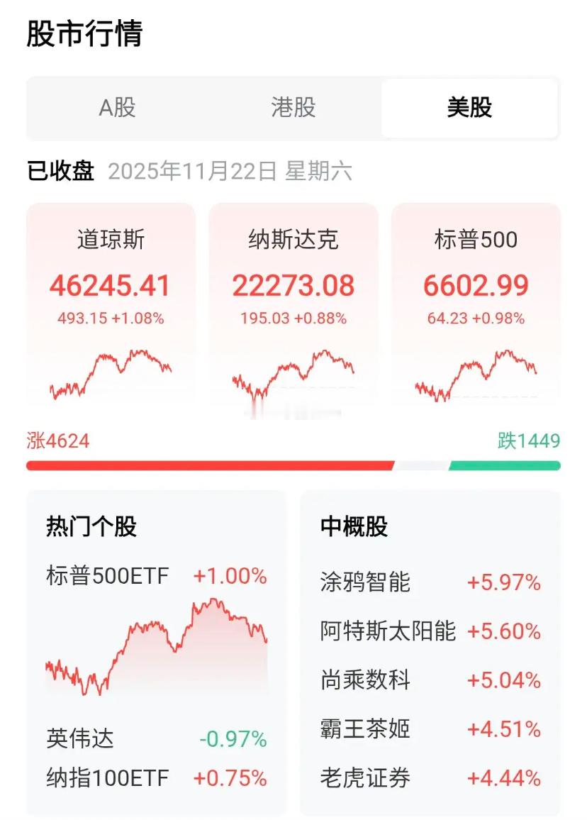道指连夜涨了400点,纳指200点,人工智能飞涨,涨幅近2%!!难怪美国人舍得将个人财富七成放在股市,因为不管美股怎么下跌就拉上来。!这就是为啥美国人不干活,天天大鱼大肉。从2024年到现在,道指涨了好多点,2.8万点到4.6万点,遍地是钱,难怪身边中国人买美股,勇敢于不上班,也能生存。