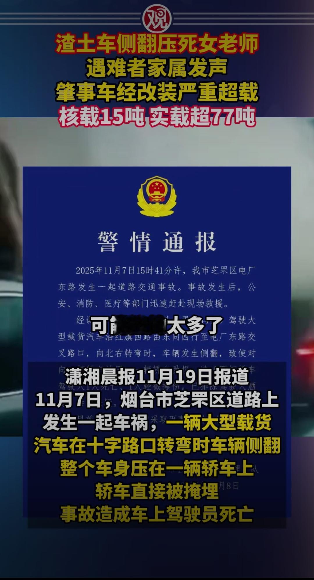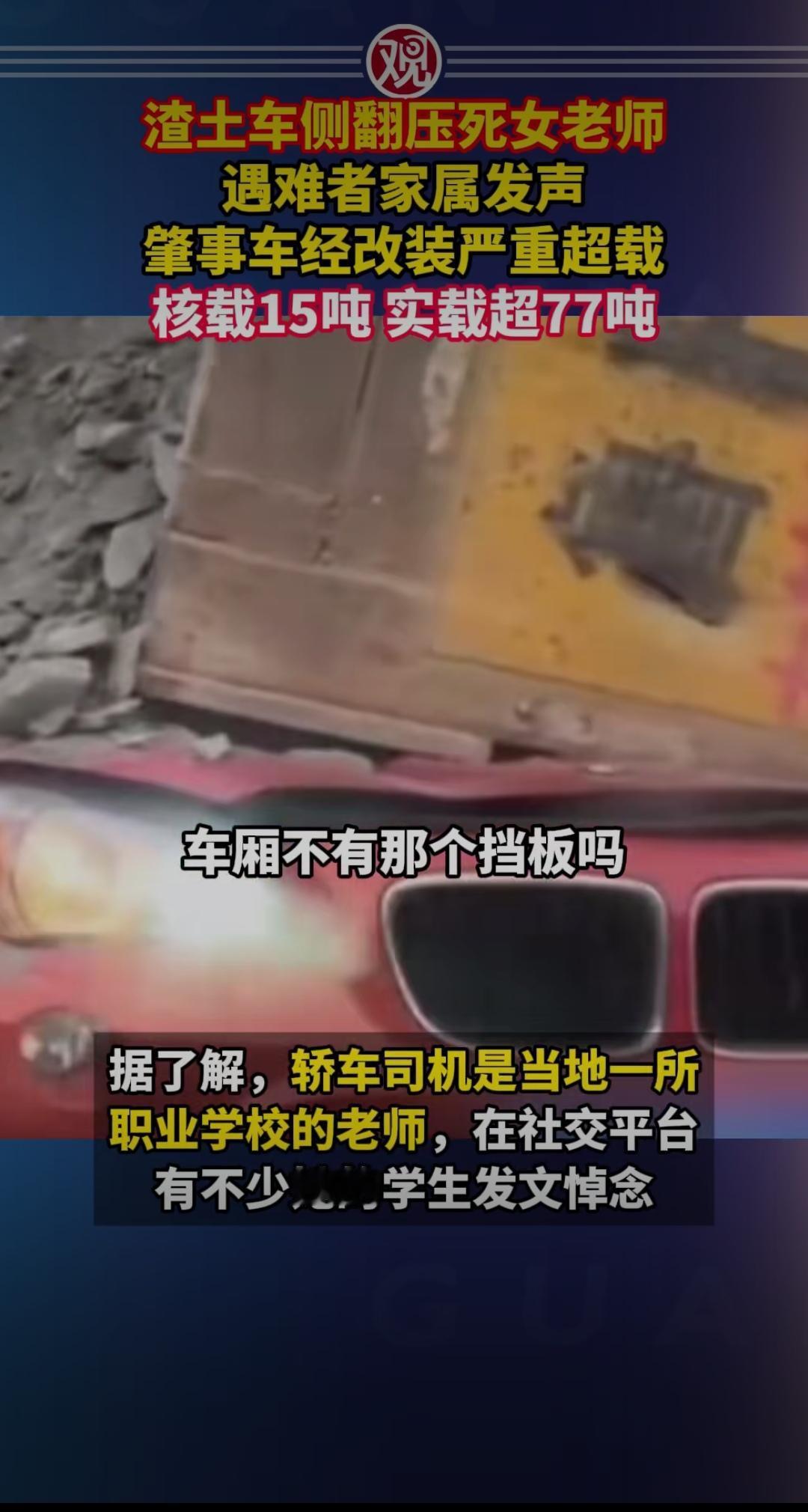 一场突如其来的灾难,将一位平凡的女老师永远留在了这个世界上。那天,她正站在校园门口,迎接学生们的到来,却不料一辆渣土车在肇事瞬间失控侧翻,将她压在了车底。生命的残酷,让人不禁心碎:一位兢兢业业、默默奉献的老师,就这样无声无息地离开了。遇难教师 遇难者家属的发声,震动了整个社会。他们痛心疾首,却也在愤怒中呼吁正义。事故的背后,隐藏着令人震惊的真相:肇事的渣土车经过改装,严重超载,核载15吨,实载竟然超出了77吨!这意味着,车体承载的重量远远超出了设计极限,才导致了这场悲剧的发生。这样的“超载”行为,究竟是个别司机的违规,还是某些企业的无良追利?这个问题,值得我们深思。 更令人愤怒的是,事故发生后,肇事车辆的超载问题早已成为行业的“潜规则”。在一些地方,为了追求短期利益,渣土车的超载、改装、非法改装已成为普遍现象。监管的缺失,让这些危险的“定时炸弹”成为了城市的隐患。而这次悲剧,无疑是这些“潜规则”的悲惨代价。 但在悲痛之余,我们也看到了希望。遇难者的家属在发声中,展现了令人动容的坚韧与勇敢。他们没有选择沉默,而是用行动唤起公众的关注。或许,这正是我们这个社会最需要的:勇于揭露黑暗,敢于追求正义。只有让这些“潜规则”暴露在阳光下,才能防止类似悲剧再次发生。 从这起事故中,我们还能洞察到人性的复杂。一方面,是那些追逐利益、肆意超载的企业和司机,他们用生命的代价换取短暂的利润;另一方面,是无数像女老师一样的普通人,他们坚守岗位,默默奉献,却在不经意间成为了“牺牲品”。这场悲剧,折射出的是制度的缺失、人性的扭曲,也提醒我们每个人都不能对安全掉以轻心。 面对这样的惨剧,公众的心情五味杂陈:愤怒、悲伤、无奈,更有一份对未来的担忧。我们期待,相关部门能够彻底整治行业乱象,严惩违法行为,让每一条道路都不再成为“死亡陷阱”。同时,也希望每一个人都能从中汲取教训:安全无小事,责任重如山。 这不仅仅是一场事故,更是一面镜子,照出了我们社会的某些阴暗角落。希望我们都能从中汲取力量,用行动守护每一份生命的尊严。因为,生命只有一次,任何以“利益”为借口的超载,都不值得用生命去买单。