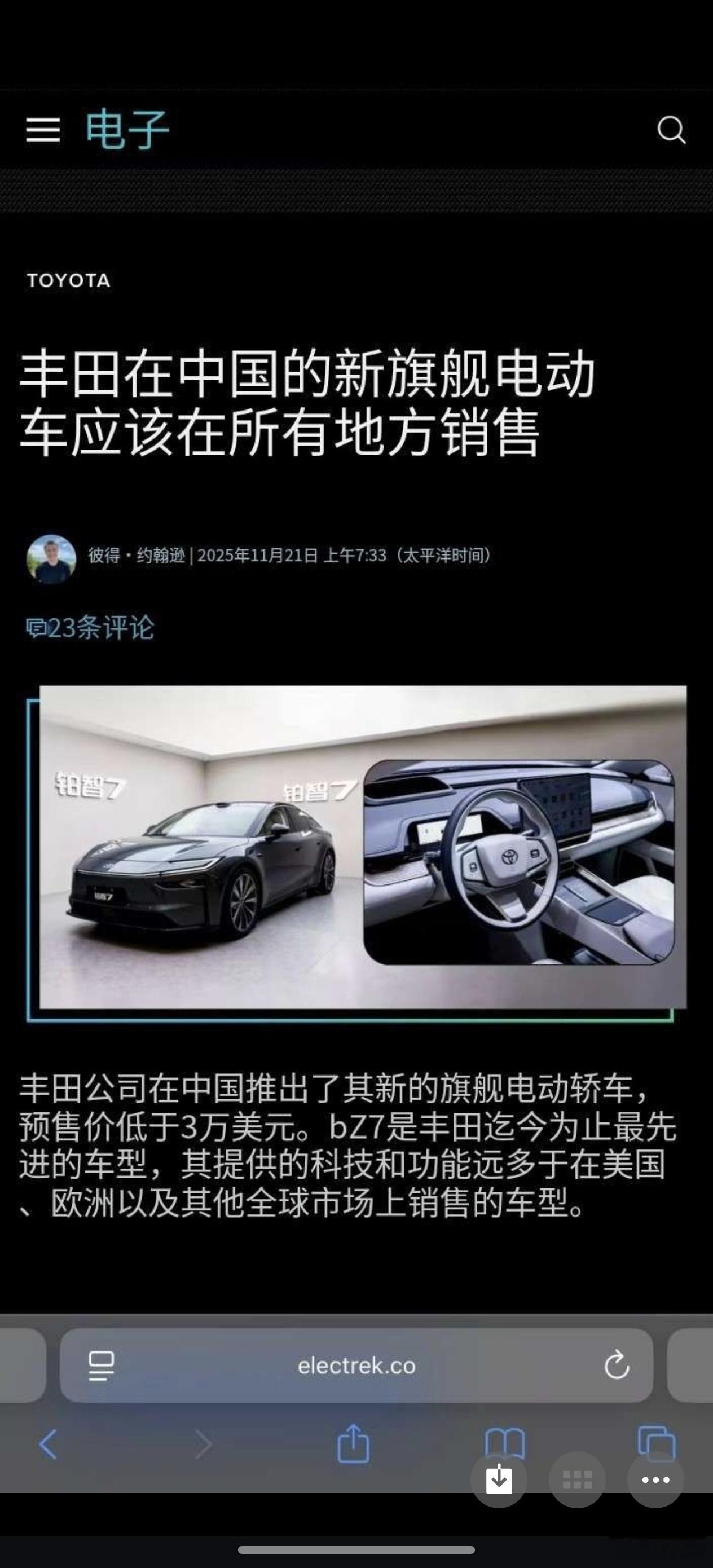 今天丰田展台依然火爆,不少都是冲着铂智7去的,连老外都来打卡、报道了。这次铂智7的7种车色全部亮相,内饰也首次公开,搭载鸿蒙座舱,还有大冰箱、大沙发、大彩电,家电三件套全配齐,车长超5米1,轴距超3米,不仅空间大,用料也豪华。有外媒甚至称它为丰田迄今为止最先进的车型,提供的科技和功能远多于在美国、欧洲以及其他全球市场上销售的车型(图九)