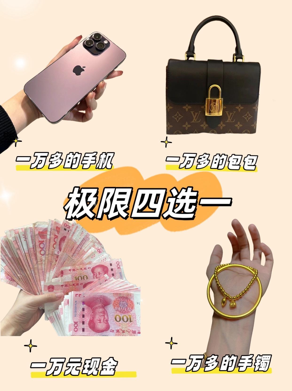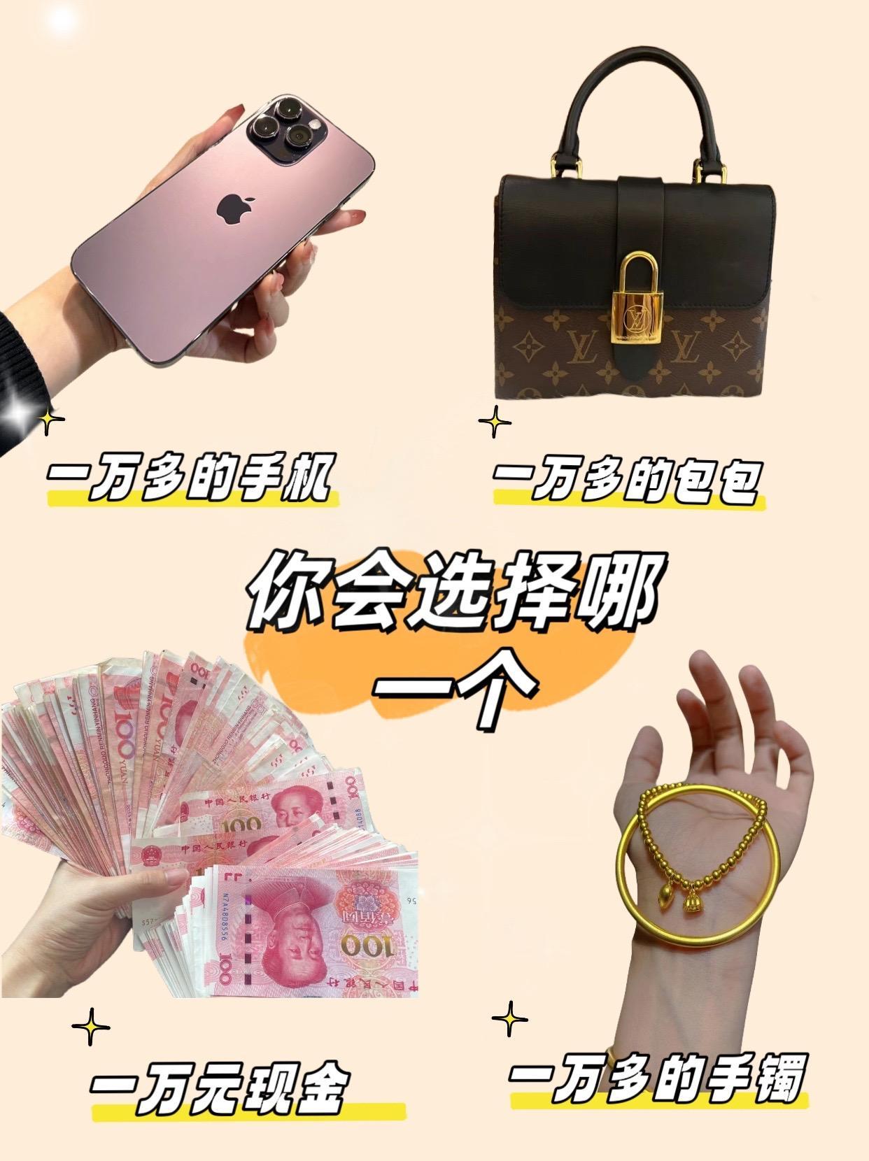 姐妹们!一万多的黄金手镯,一万多的手机,一万多的包包,还有一万多的现金,如果让你们选一个,你们会选哪一个?选择困难症 拉流最火图文 好东西一起分享