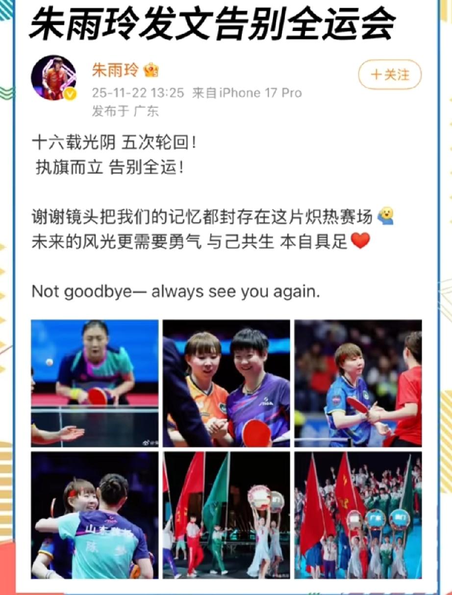 朱雨玲发文告别全运会!这次作为东道主运动员她真是赚到了!! 朱雨玲发文说道,十六载光阴,五次轮回,执旗而立,告别全运!这届全运会应该是朱雨玲复出以来最令人难以忘怀的比赛,因为太巧了 第一巧合:与陈梦的再次交手让她很意外,作为曾经一同的好姐妹,室友,队友,场上的对手,五年未相遇赛场,这次二人在铜牌赛相遇,二人在赛场上给年轻小将鼓舞 第二巧合:作为曾经的世一,与现在的世界第一孙颖莎相遇了,这二人在国际赛场上未遇到过,这次交手正如她自己所说,检验一下自己的打法和莎莎的打法,这次实现了 第三巧合:与陈幸同的第二次相遇,这次想挑战一下她,没想到,朱雨玲果然实现了,这届全运会上赢了陈幸同,这次她又进步了! 第四巧合:这次她在闭幕式上代表澳门队担任旗手,再次证明她真的太优秀了,作为东道主她也完美了 喜欢朱雨玲,无论从球商到发言,再对乒乓球的领悟,我觉得她是最优秀的乒乓人,她的体育精神值得我们所有人为其点赞!