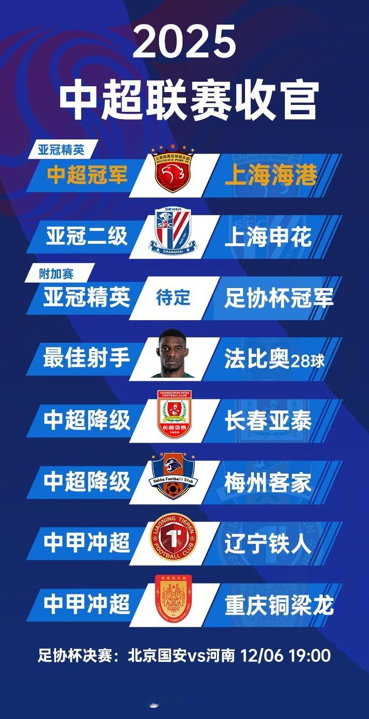 2025赛季中超落下帷幕,上海海港连续三个赛季夺得中超冠军,上海申花获得亚军,蓉城获季军。长春亚泰和梅州客家降入中甲。法比奥28球夺得本赛季中超金靴奖。辽宁铁人和重庆铜梁龙冲超成功。