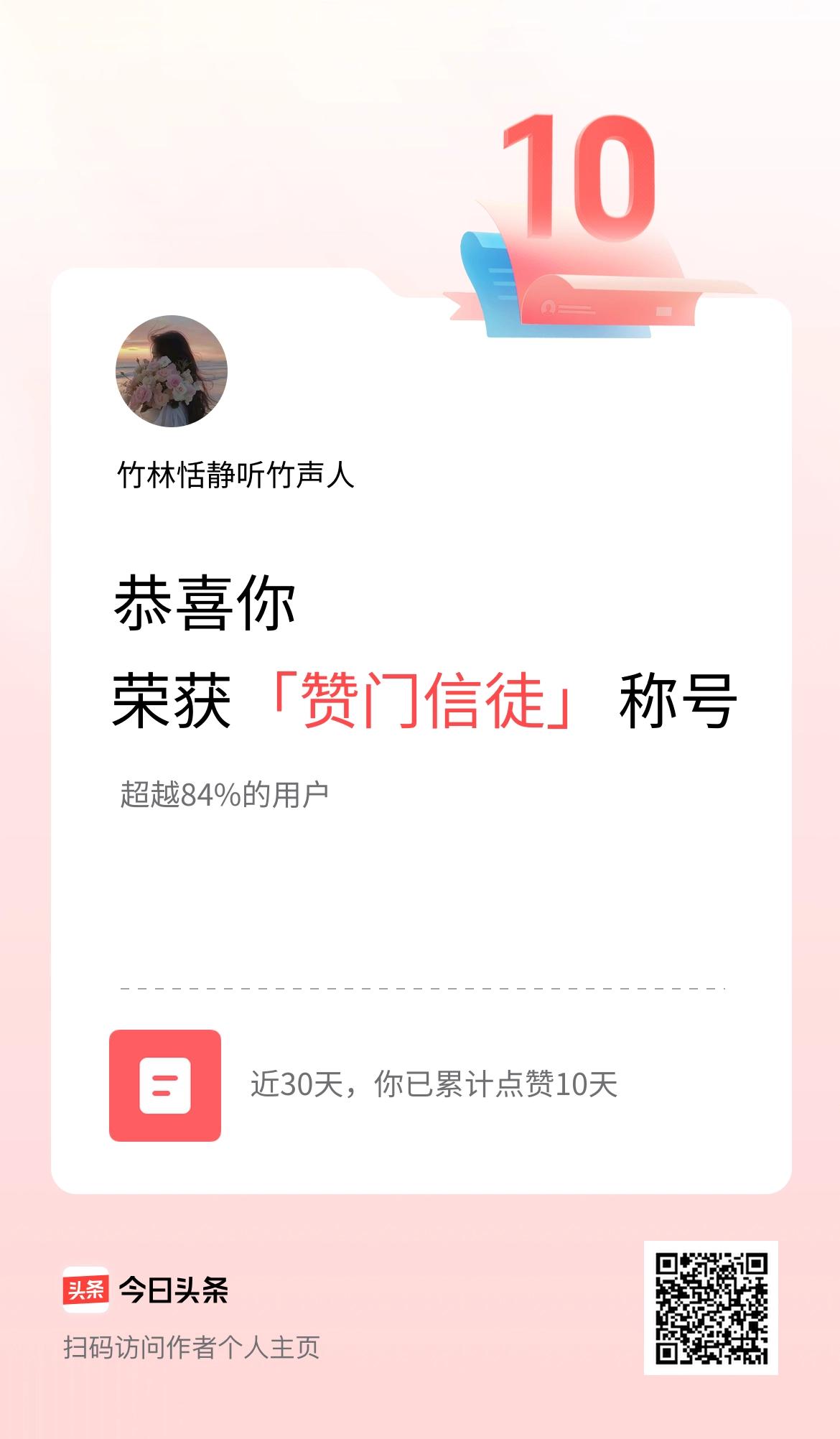 我在头条30天内点赞打卡10天,获得“赞门信徒”称号