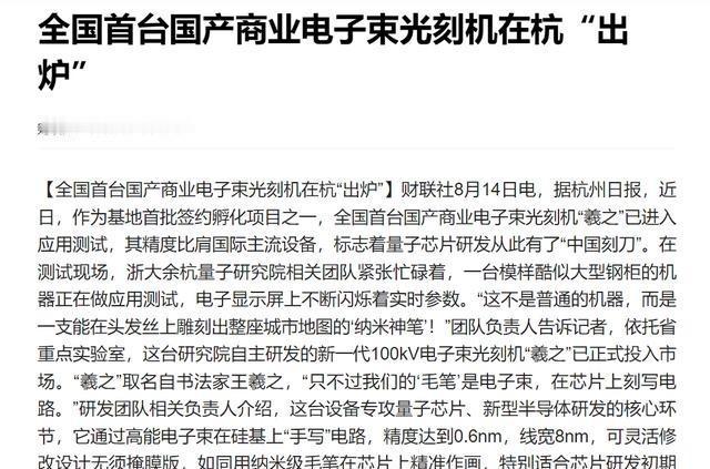 荷兰怕是要坐不住了,中国首台商用电子束光刻机已在杭州成功问世。这台名为“羲之”的设备,精度与国际主流水平比肩,不仅为我国量子芯片研发装上了“中国刻刀”,更让西方看清了中国在半导体领域的硬实力。 这事儿得从头说起,这些年芯片卡脖子卡得大家伙儿都憋着一肚子火。先进光刻机基本被荷兰ASML一家捏着,尤其是EUV那种顶尖货,美国一掐腰,ASML就不敢往中国卖。国内多少实验室想买台高端电子束设备做量子芯片原型验证,结果到处碰壁,中国科学技术大学、之江实验室这些地方以前连采购都难。现在好了,2025年8月,杭州城西科创大走廊的浙江大学成果转化基地直接放出大招:全国首台国产商用电子束光刻机“羲之”正式进入应用测试阶段,彻底把这块空白给填上了。 “羲之”这名字起得有意思,取自王羲之,意思就是用电子束当毛笔,在硅片上直接写电路。这台机器是浙江大学余杭量子研究院靠省重点实验室平台自己搞出来的,加速电压100kV,定位精度干到0.6纳米,最小线宽8纳米,跟国外主流商用电子束设备一个水平线上。关键它不用掩膜版,想改个图案直接在软件里调参数,电子束就重新扫一遍,省了传统光刻那套做掩膜、换掩膜的麻烦钱和时间。尤其对量子芯片这种东西,一开始设计迭代特别快,改来改去是常态,用“羲之”几分钟就能出新版图,效率高得一批。 很多人一听就问,这玩意儿能干翻ASML的EUV吗?别急,先泼盆冷水。电子束光刻和EUV光刻完全不是一个路子。EUV是投影式,一次曝光整片晶圆,几秒钟搞定,ASML的High-NA EUV一小时能处理几百片,适合手机芯片、AI芯片那种海量生产。电子束呢?它是一点一点扫,像用针在纸上画画,精度是高,但速度慢得要命,一片晶圆得扫好几个小时,成本摊下来根本扛不住大批量制造。所以“羲之”压根不是冲着取代EUV去的,它定位就是研发神器、小批量定制、原型验证、量子器件、新型半导体这些场景。国外也一样,JEOL、Raith这些公司的电子束设备基本都用在实验室和掩膜厂,没人拿它去冲7nm以下的逻辑芯片量产线。 但这不代表它不重要,正相反,对中国现在的情况来说,这一步太关键了。以前国内顶尖团队想做个超导量子比特或者硅基量子点实验,得排队等国外那几台老旧设备,或者干脆出国跑数据。现在“羲之”价格比进口同类低一大截,已经跟复旦、华为海思这些单位签了合作,估计很快中科大、之江实验室也会上马。研发前端有了自主工具,后面设计出来的芯片版图就能更快落地验证,迭代速度直接拉上去好几倍。别小看这点,芯片这行当,研发阶段快半年,后面量产就能抢先机。 再往深里说,光刻机从来不是一台机器的事儿,它后面牵着一整条链。电子束这块国产化了,上游的电子枪、电磁透镜、真空系统这些零部件供应商也跟着活了,国产率直接提到七八成。以前进口一台得几千万上亿,还不一定批得下来,现在本土企业能批量供货,成本降、交付快,整个生态就盘活了。跟其他方向一结合,比如上海微电子的28nm浸没式DUV、哈尔滨工业大的激光等离子体EUV光源、中科院的固态深紫外激光,这些加起来,中国光刻技术矩阵慢慢就拼齐了。不是说马上就能出3nm EUV,但至少在研发端、特殊工艺端,我们已经不看别人脸色了。 说白了,荷兰ASML确实牛,但它牛的是量产EUV那一套,中国现在走的路更务实:先把研发工具抓在自己手里,量子计算、碳化硅、氮化镓这些下一代东西先跑起来,等EUV那一天真正突破,再无缝衔接。羲之这台机器出来,等于告诉外面:别以为卡着EUV就能把中国芯片憋死,我们换条道一样跑得飞起。2025年11月了,这设备已经在好几家单位转起来了,数据反馈全线正向,后面肯定还有迭代版本,精度再往上提提,扫描算法再优化优化,说不定哪天小批量先进制程也能上。 总之,这事儿挺提气的,不是吹牛说马上超越谁,而是实打实把最疼的那块补上了。芯片这仗还长着呢,但至少现在,科研人员手里多了一把真正属于自己的刻刀,想刻啥刻啥,不用再低声下气求人。一步一个脚印,慢慢来,总有把ASML拉下马的那一天。