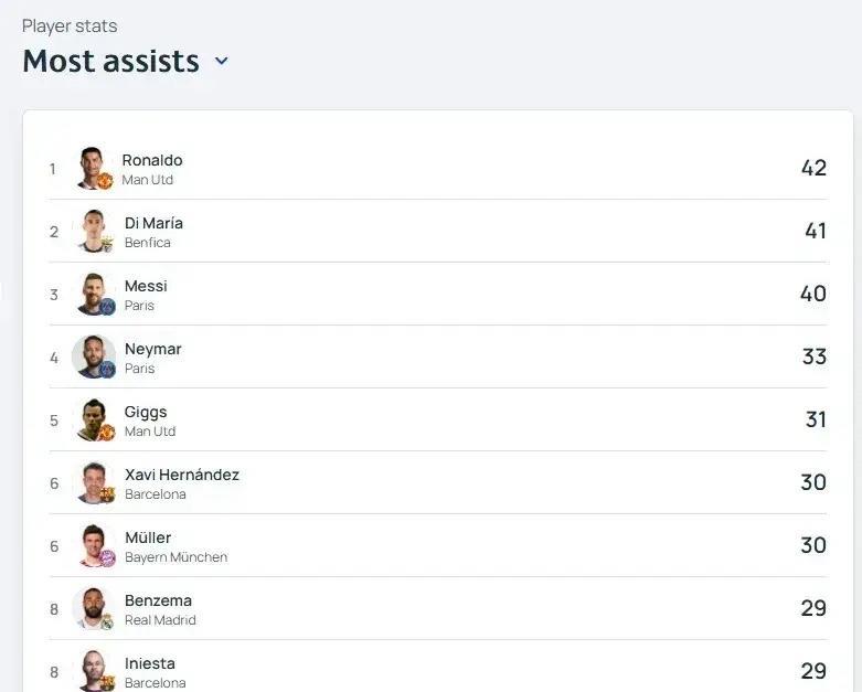 在欧足联的官方统计中,C罗的欧冠助攻高达42次,史上最多,但为什么他称不上“欧冠历史助攻王”呢? 因为C罗从来没在单赛季当过助攻王,前三都很少进去过,最高是一次第二。单纯因为他职业生涯很长,累积至42次。如果这样就可以号称“历史助攻王”,那也太可笑了。 正如C罗当得起“欧冠历史射手王”,不光因为总进球最多,也因为7次单赛季最佳射手等成绩。想象一下,如果C罗一次最佳射手都没有拿过,只因为累计进球最多,就号称“历史射手王”,谁能服他? 那么,欧冠历史助攻王是谁呢?迪马利亚41个,有过一次单赛季助攻王(19-20赛季6个)梅西40个,有过两次单赛季助攻王(11-12赛季5个;14-15赛季6个)。 在总数与C罗相差很小的情况下,阿根廷正副球王可以同享“欧冠历史助攻王”的称号。葡萄牙球玊不配。