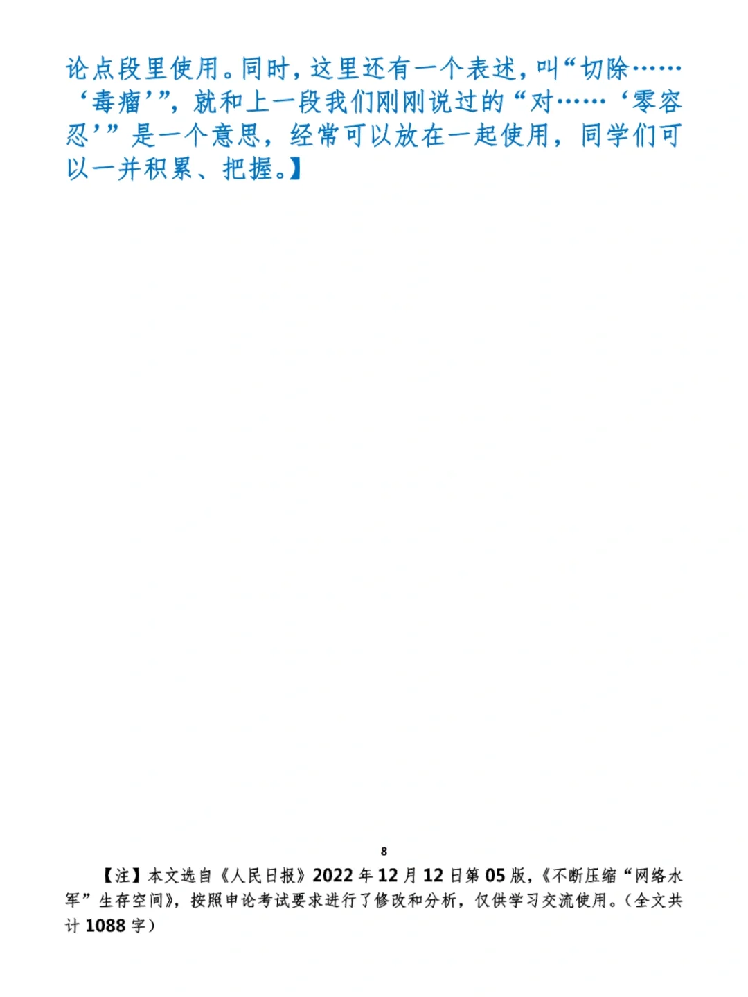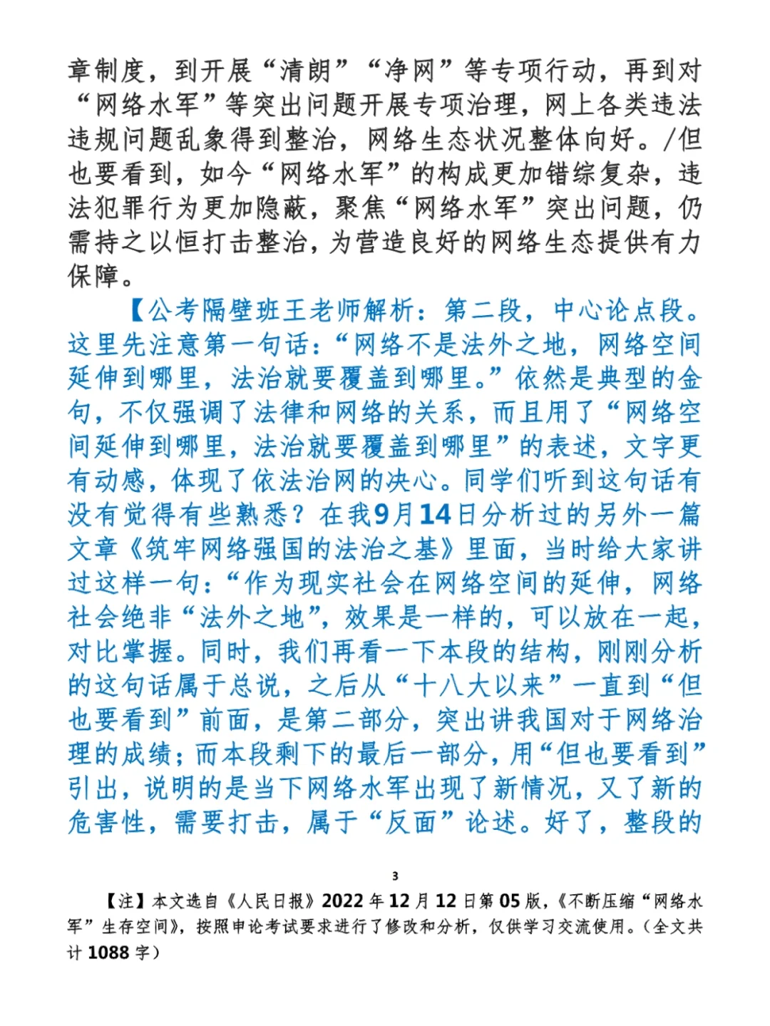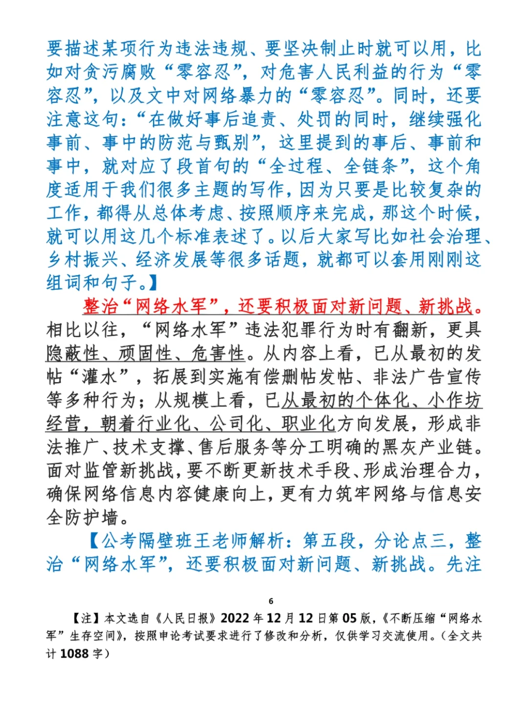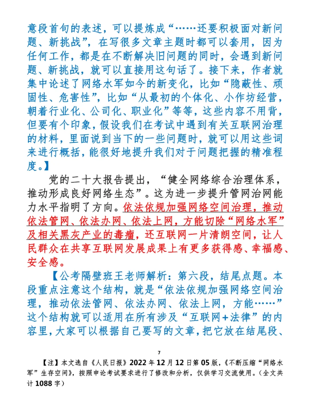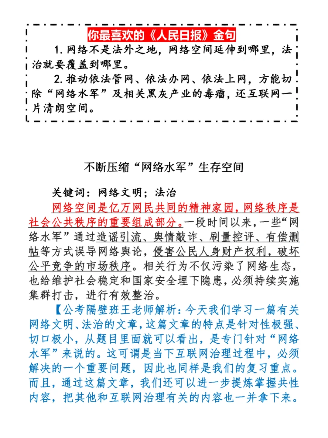 今日打卡作业: 1. 选一句你最喜欢的金句 2. 抄写全文红字+划线部分内容 3. 写完后在留言区打卡 ⭐️ ⭐️ ⭐️ ⭐️ ⭐️ ⭐️ 如何抄写:每天的抄写文章以图片形式发在“公考隔壁班王老师”账号,红色字是重点句和结构句,黑色字是正文,蓝色字是解析,大家抄写时不必抄蓝色字。建议先通读全文(包括蓝色解析部分),做到心中有数再开始抄写,效果会更好。 关于文章:抄写文章来源于人民日报,但每篇文章我都根据申论考试要求进行了修改,主要集中在四个方面:一是重写或修改开头、结尾;二是统一段首句句式结构;三是调整段落字数,使文章结构更均衡;四是简化复杂长难句,使之更具可模仿性。每篇文章修改幅度不同,无论修改多少,都是基于申论考试要求,毫无对人民日报文章品评之意。(此处致敬人民日报) 关于解析:我会在文章每段后面加一段蓝色字的解析,是我自己在抄写时的感悟,篇幅时间有限,不能面面俱到,但求重点突出。如果你有其他感悟,也希望能在评论里分享,我们相互学习、共同进步。 ⭐️ ⭐️ ⭐️ ⭐️ ⭐️ ⭐️ 这里是公考隔壁班王老师独创的“每天半小时・申论80分”抄写团,欢迎加入我们!