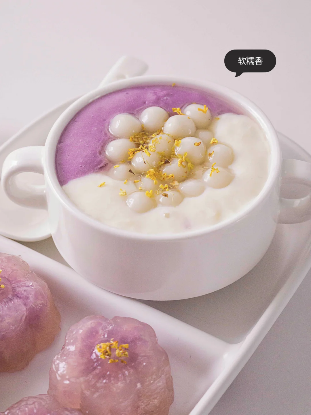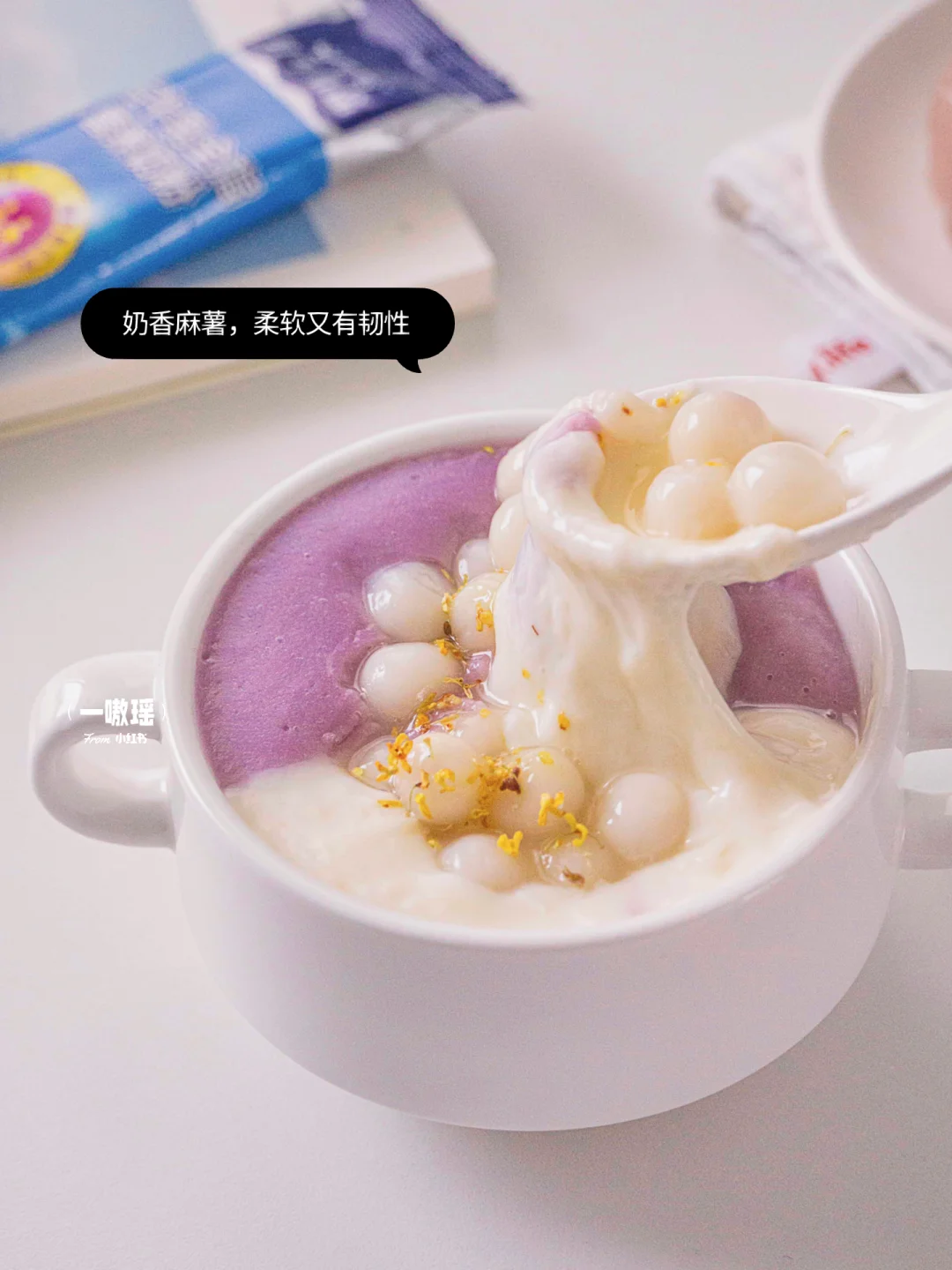 🥣【组装】芋泥倒碗里,再倒入牛奶麻薯,放上小圆子,淋点桂花蜜🫗 搞定️