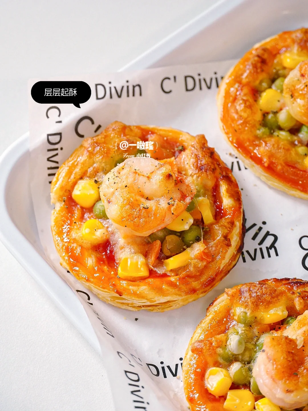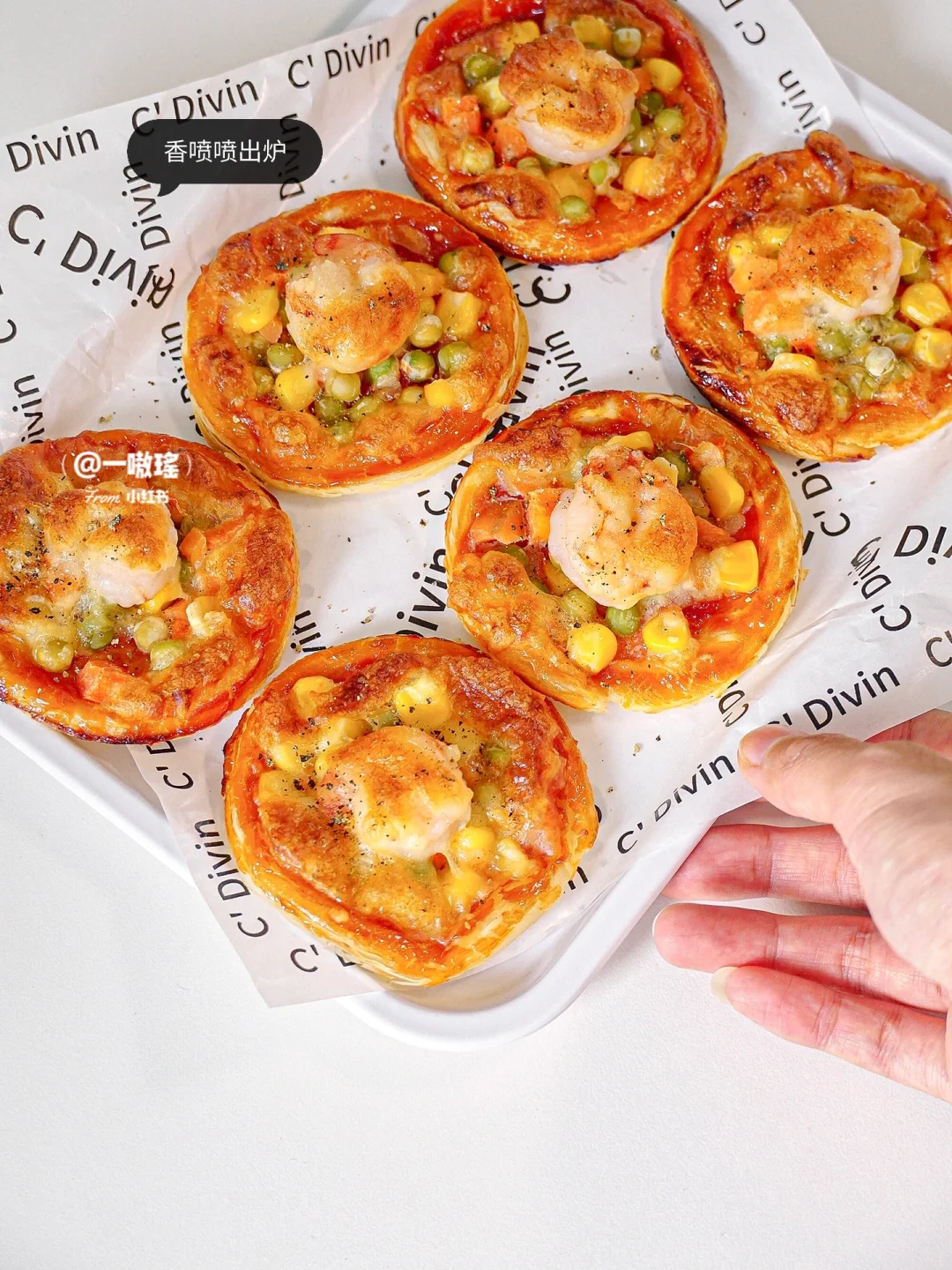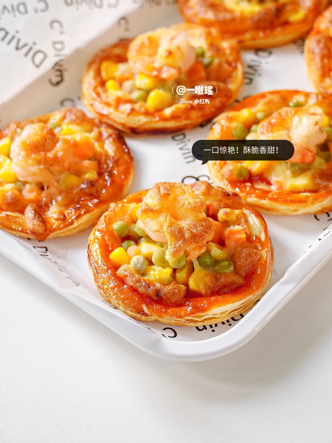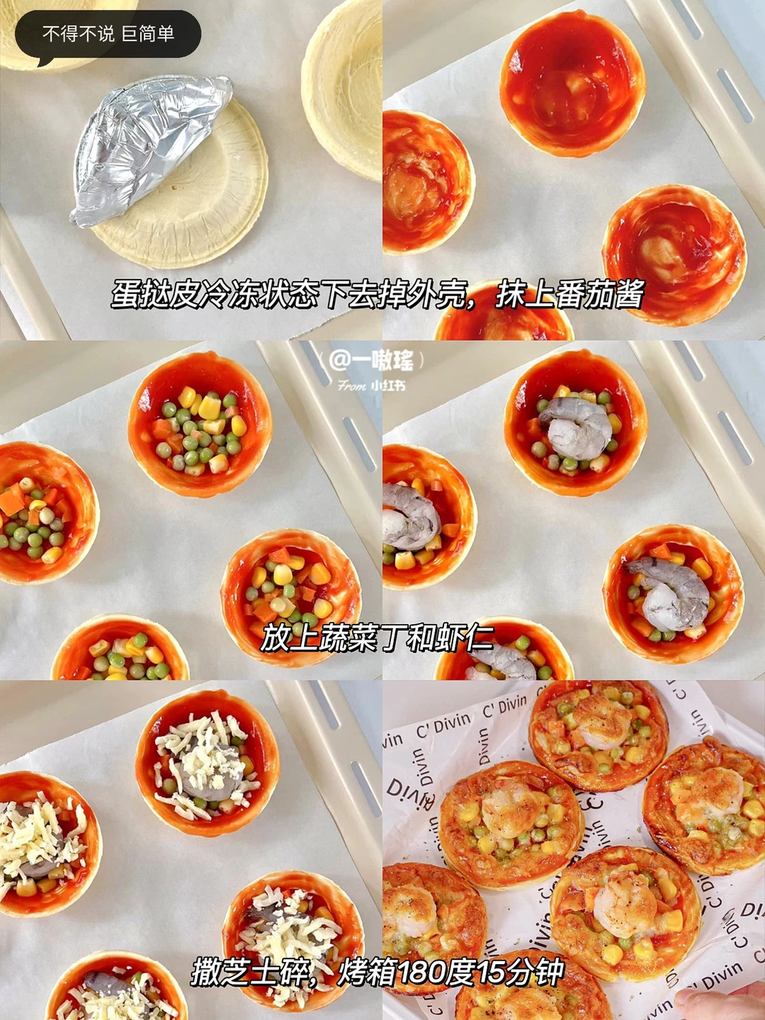 🍕轻松实现披萨自由! 做法简单快手 没有一丁儿难度 酥酥脆脆超好吃,手残党也能get的美味小吃 - 🔖食材 蛋挞皮 蔬菜丁(玉米、胡萝卜、豌豆) 虾仁 番茄酱 芝士碎 黑胡椒 ✨做法 🔸蛋挞皮冷冻状态下去除锡纸 🔸刷番茄酱 🔸放上蔬菜丁和虾仁 🔸撒上芝士碎 🔸烤箱预热180度15分钟(空气炸锅180度20分钟)