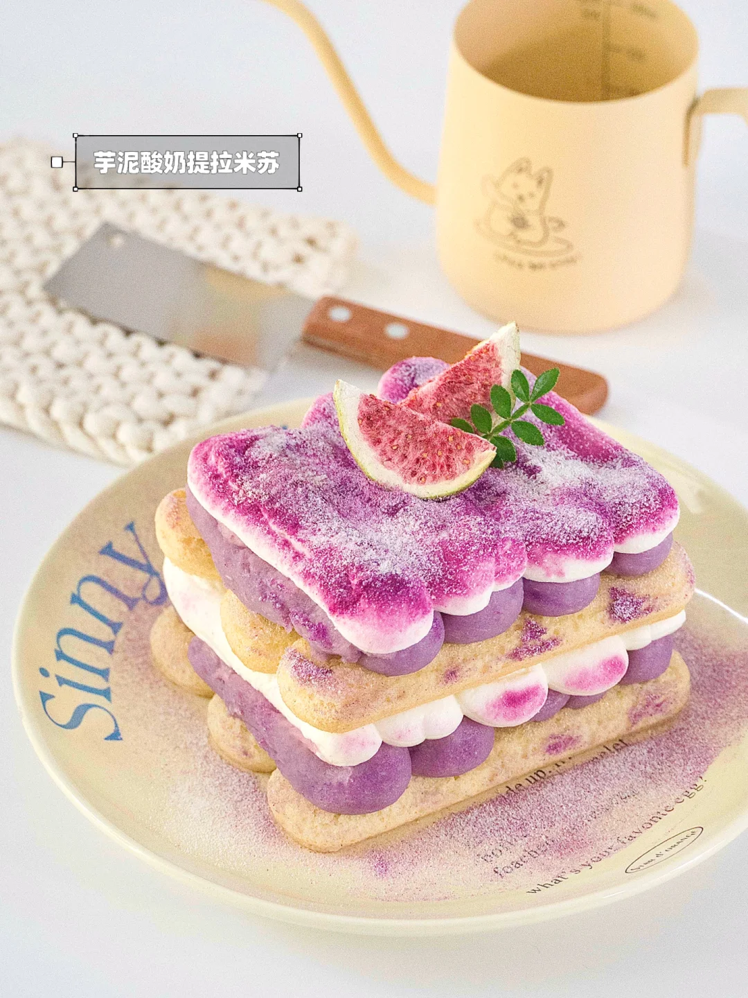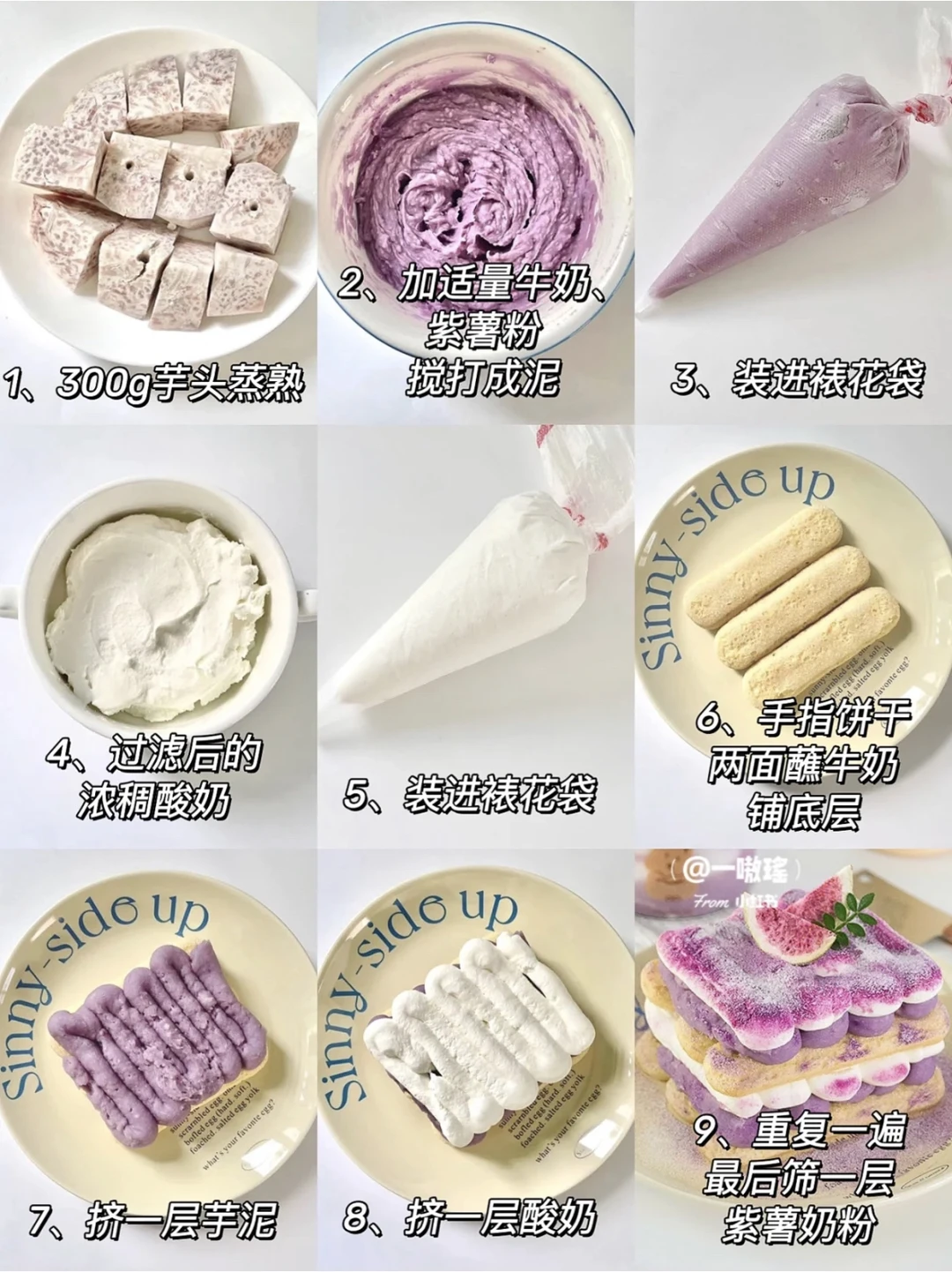 食材:芋头、牛奶、酸奶、手指饼干、紫薯粉、奶粉