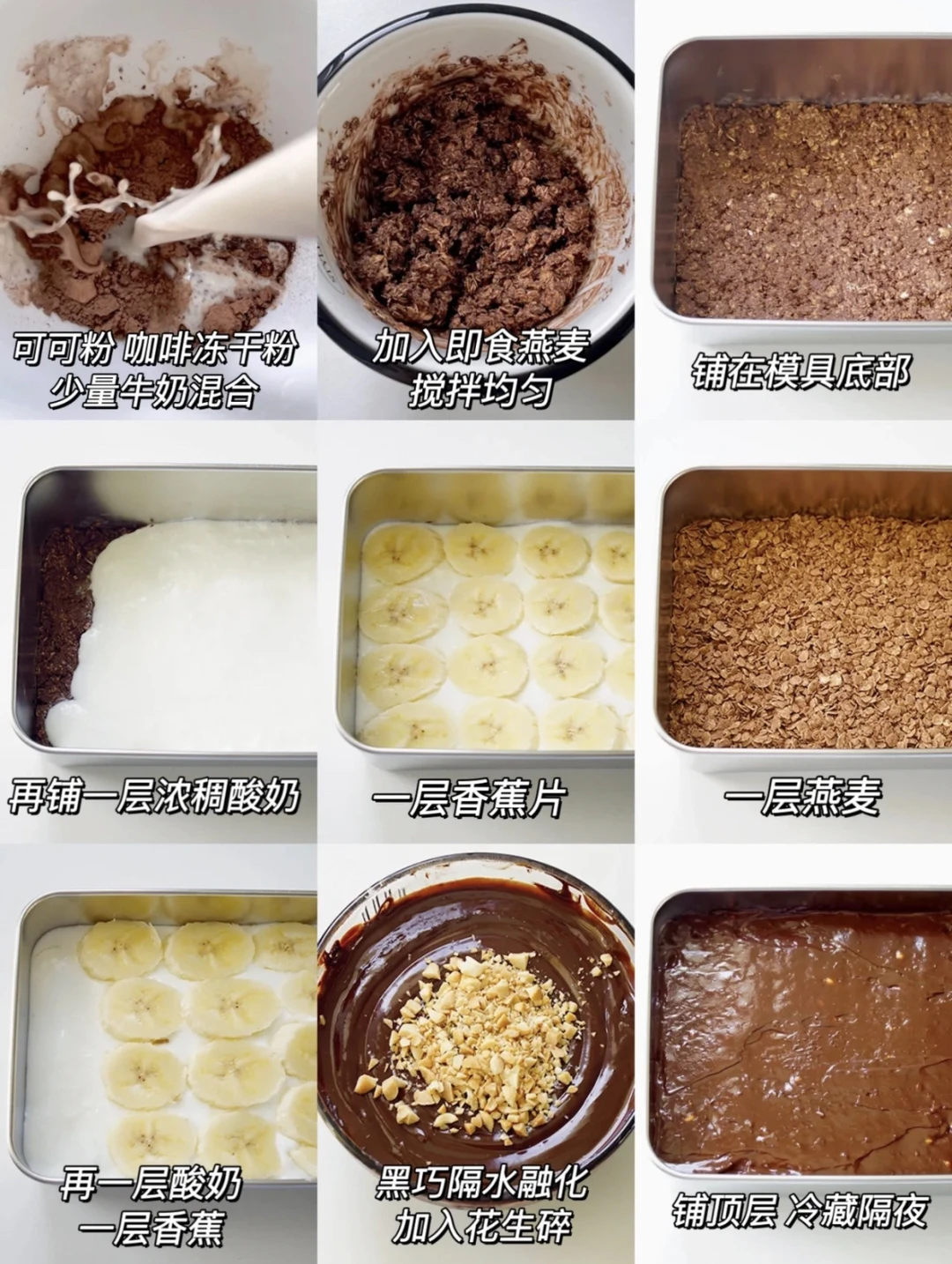 食材:即食燕麦、浓稠酸奶、香蕉、黑巧、可可粉、咖啡冻干粉、花生碎