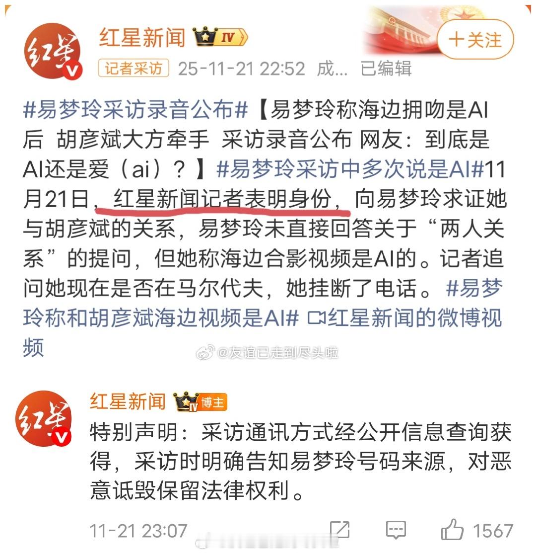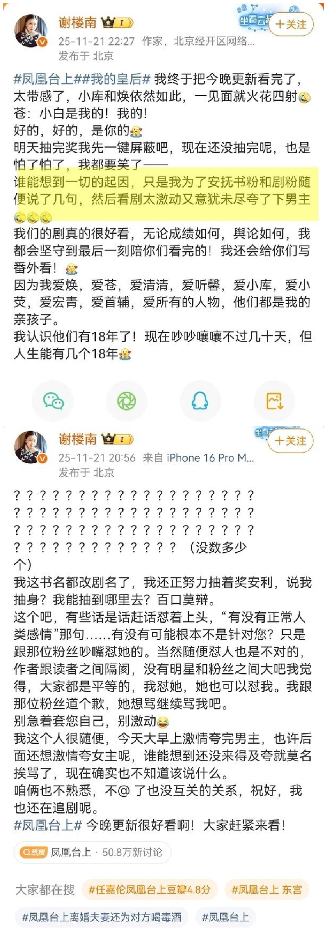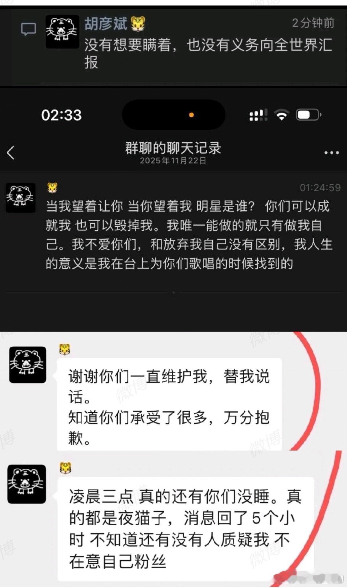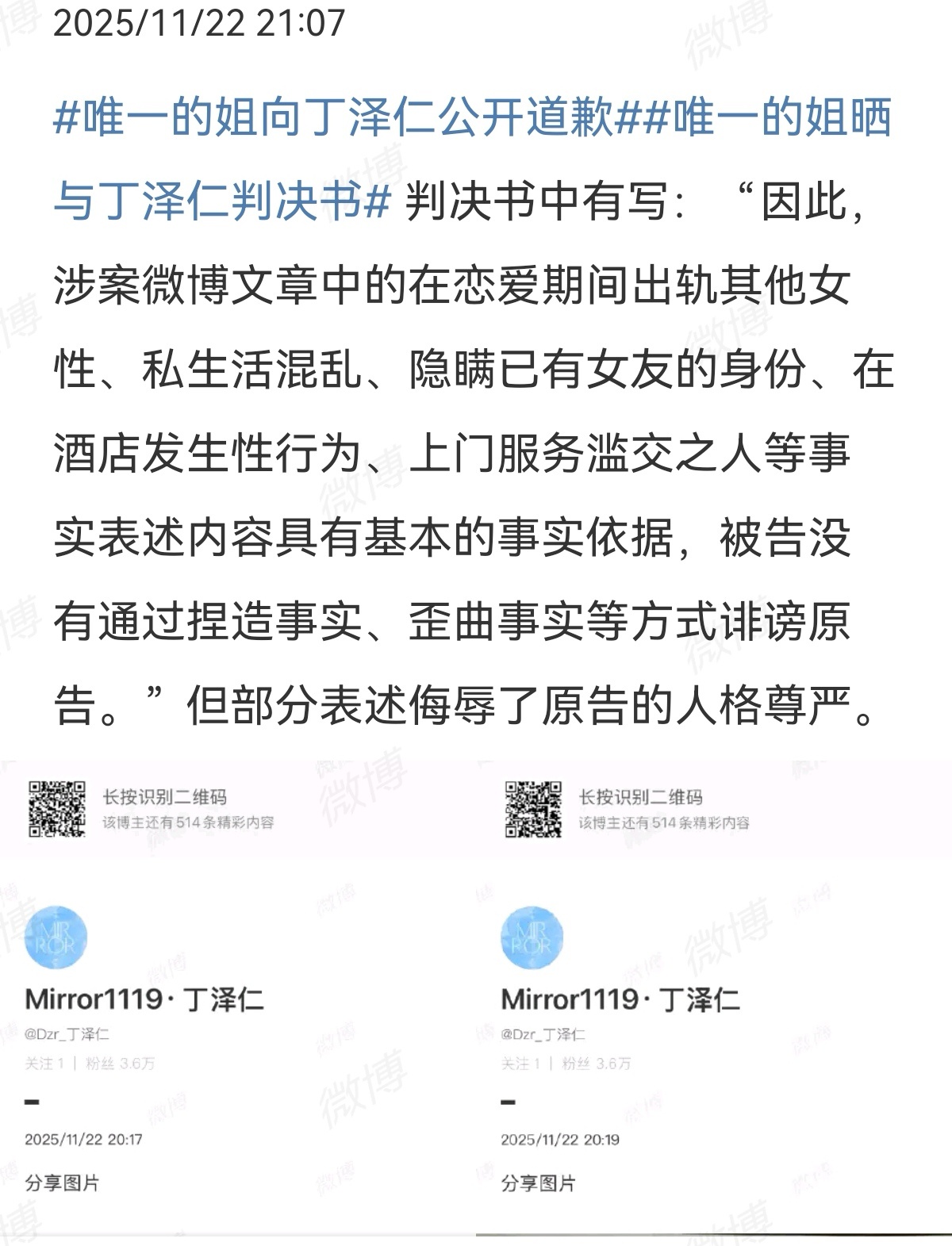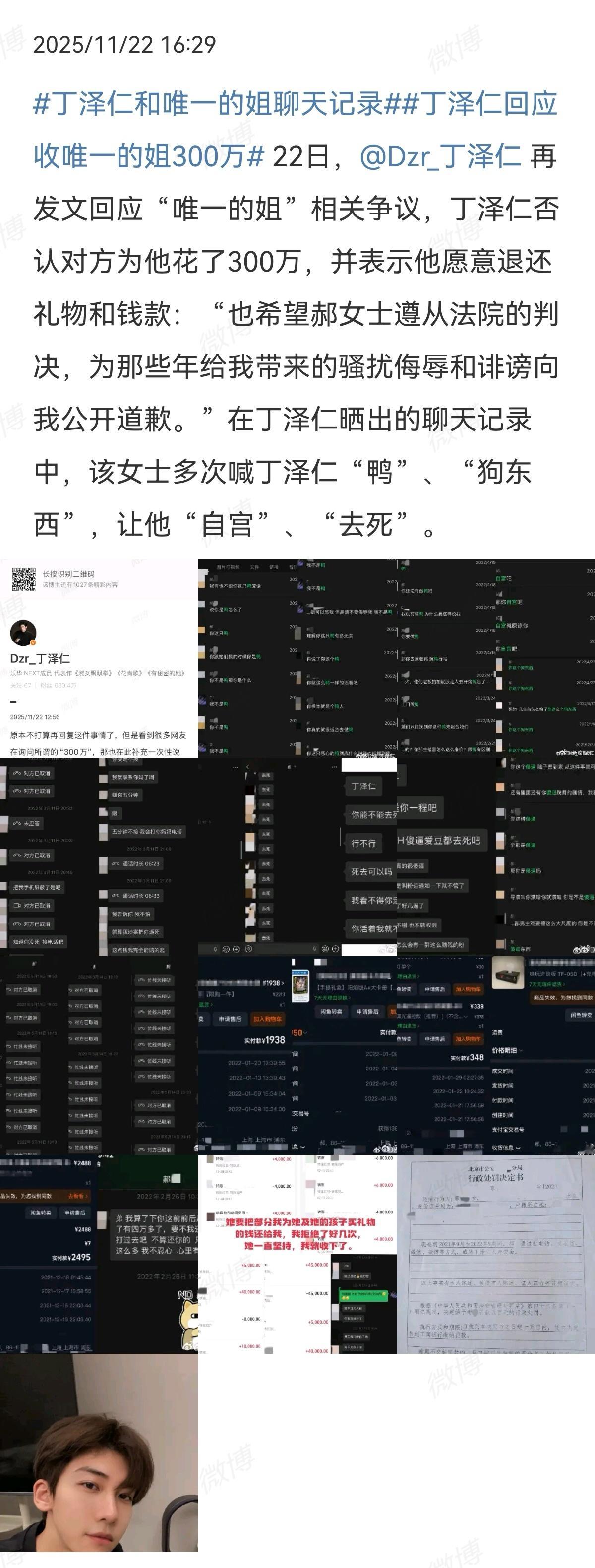 2025-11-22总结①杨坤官宣加入月华 图1②时代峰峻先后辟谣“朱志鑫私联”、“苏新皓私联”相关传闻 图2③丁泽仁贴出跟唯一姐的聊天记录,否认花了他300万,已维权成功 图3丁泽仁“唯一的姐”贴了判决书,爆料为真,嘴臭被罚 图4④赵露思工作室要签约新人 图5⑤红星新闻公开采访录音,否认私生行为 图6⑥胡彦斌深夜空降粉丝群,安抚粉丝 图7撕❶凤凰台上,原著作者表示自己没有公开批评彭小苒演技,只是对剧改人设有表达不满;但她也对彭小苒说的“雌竞”言论表达了不解 图8作者解释这几天争议原由,只是为了安抚书粉跟剧粉随便说了几句话,看剧夸了男主,被人恶意说媚男,厌女 图9作者表示彭小苒给她买黑热搜黑水军 图10❷张歆艺点赞了唐嫣罗晋分居相关帖 图11❸归鸾,张凌赫粉要求绝对一番回车官宣待遇 图12❹孟子义跟何与cp名与张婧仪跟张凌赫cp名一样,情投义何(仪赫),孟子义张婧仪两方比实绩 图13❺侯明昊粉控诉卢昱晓大粉造谣侯明昊与某女星佩戴同款头盔系“恋情实锤”。澄清该头盔为剧组男演员所赠生日礼物,并附赠礼证据 图14双方再翻旧账,入青云路透,卢昱晓片场撑伞动作被侯明昊唯粉指控"职场性骚扰",CP粉澄清源于卢昱晓胃疼侯明昊帮忙。图15卢昱晓V领着装遭恶意评论,粉丝反击"女性穿衣自由被污名化"。图16昨天