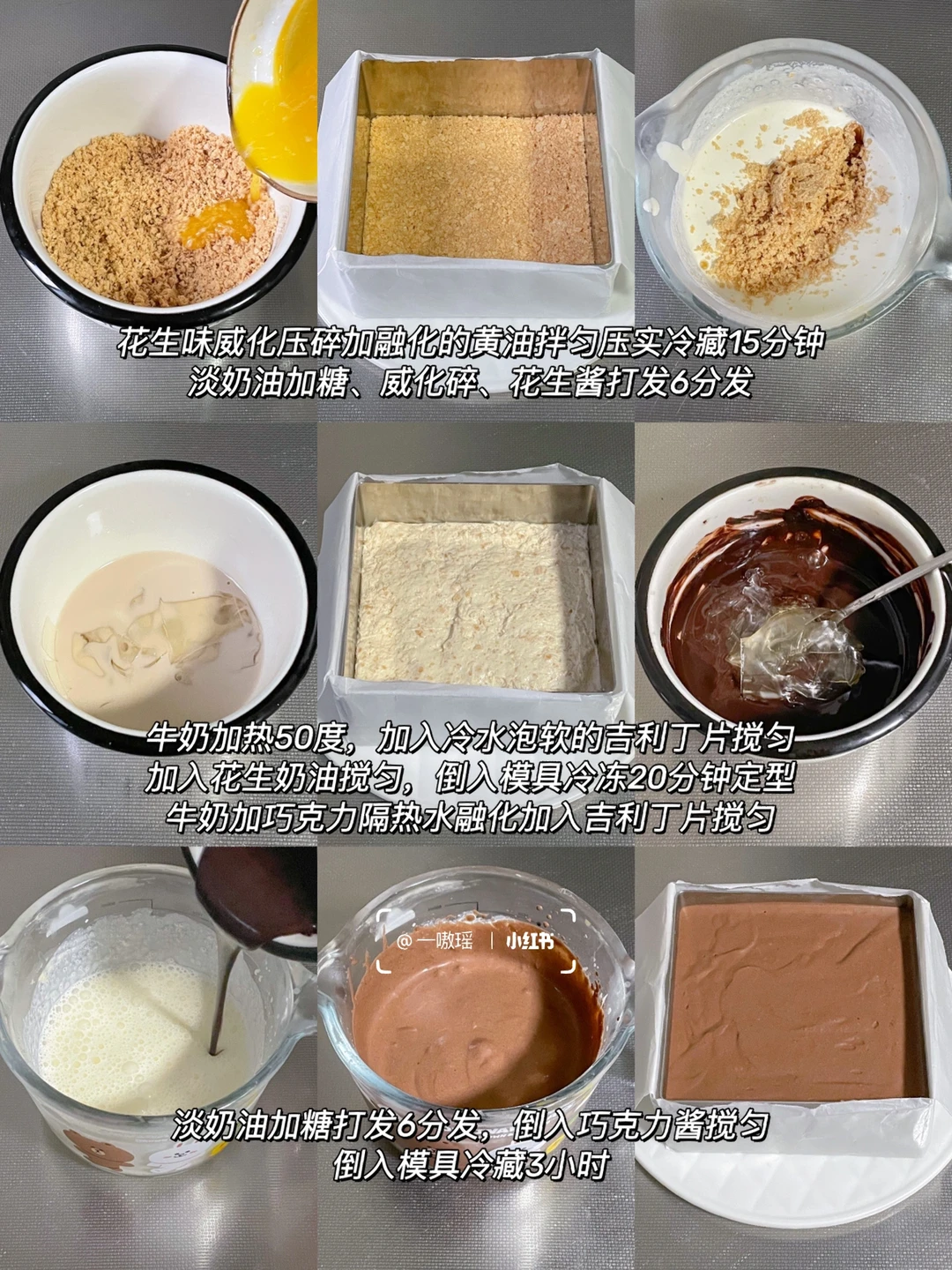 ▫️50g花生味威化压碎,加融化的黄油拌匀压实冷藏15分钟