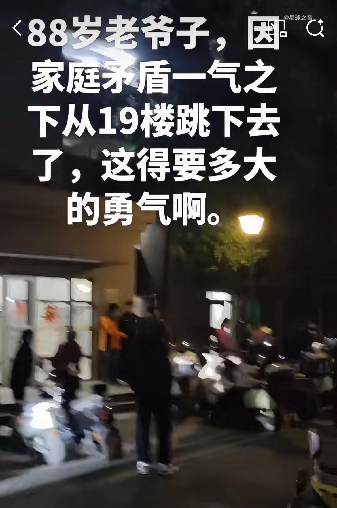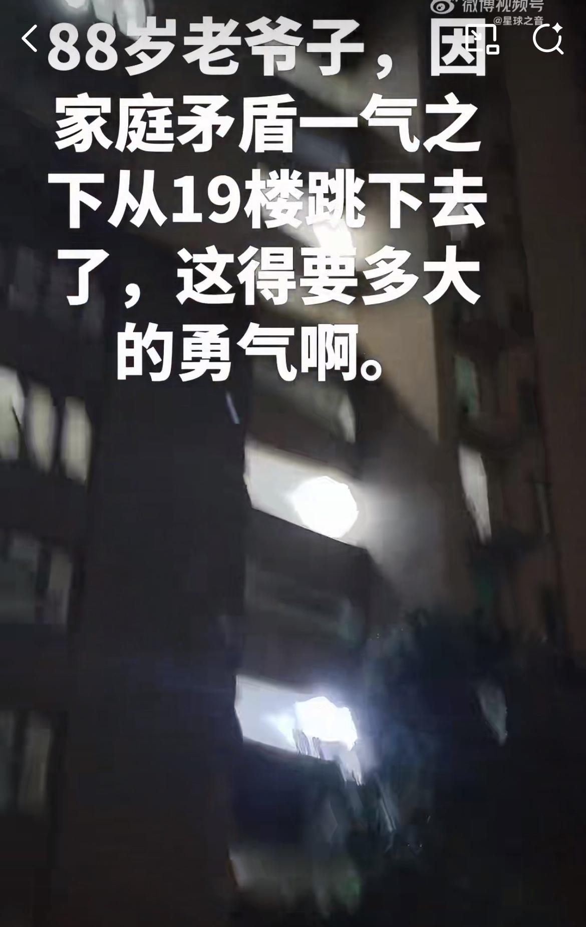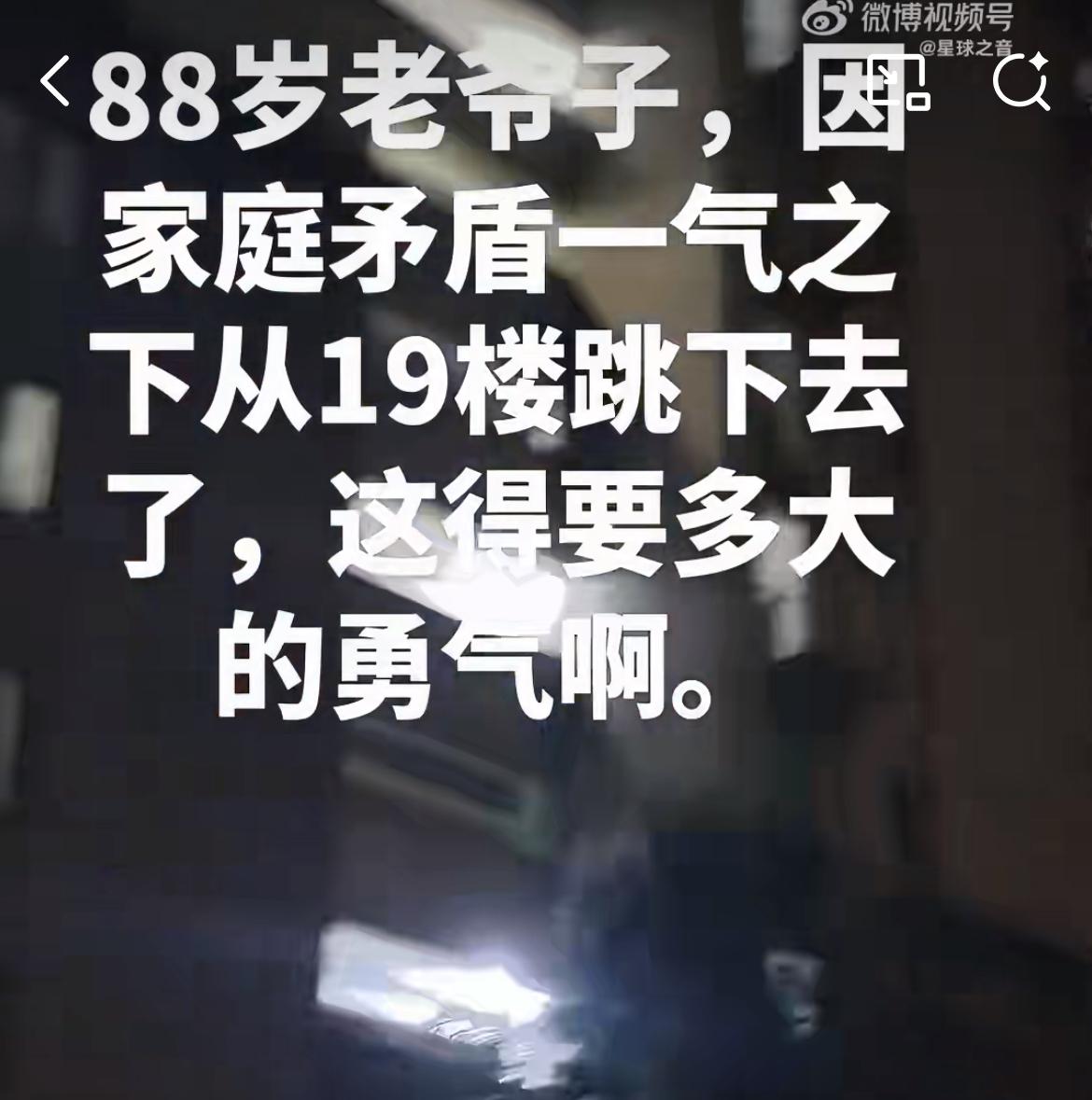88岁大爷家庭矛盾从19楼跳下,这么大年纪火气还如此大?我想这只是表面原因吧,这个年纪多少身体都会很多毛病,疾病的折磨才是最大的问题,如果久病不愈,也许还有家人的埋怨和不解,寿多则辱,在大部分老年人身上都会出现,这是个无解的家庭难题。老年人的悲哀 邻居大爷去世 大爷坠楼