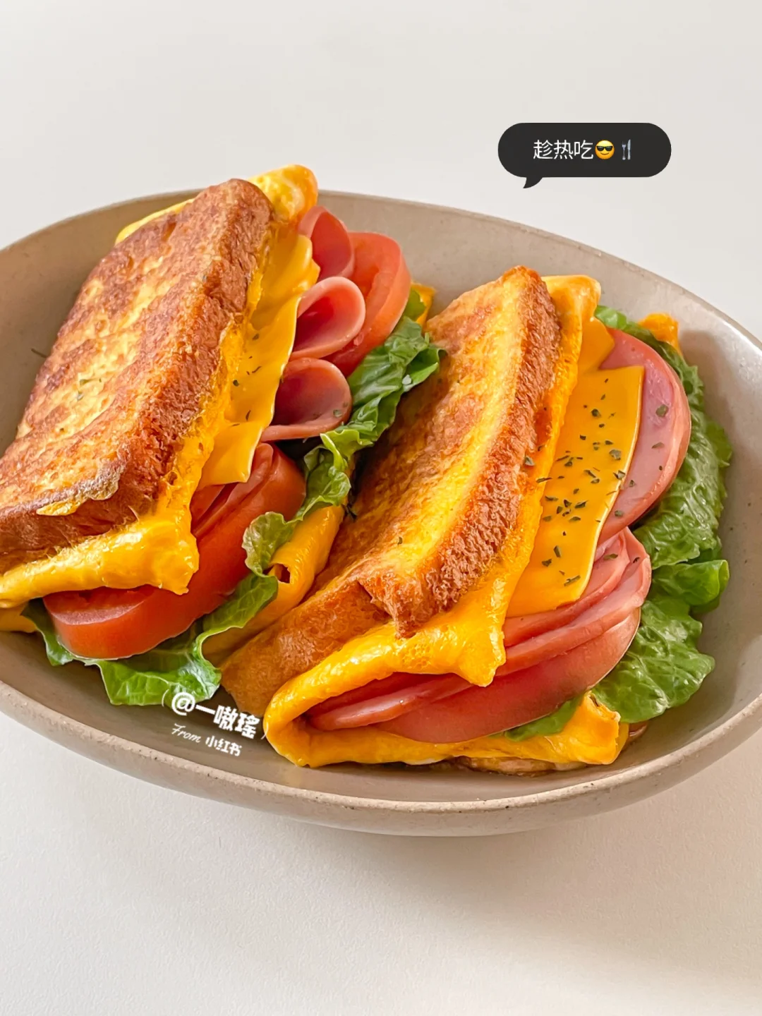 当之无愧的元气早餐一把手,蛋包吐司三明治🥪 早餐不知道吃什么赶快安排‼️ 松软的吐司包住丰富的馅料,一口下去无比治愈🧡 平底锅就能做❗️简单又好吃 - 🛒一个三明治所需食材: 1片吐司 2个鸡蛋 3片火腿 1片芝士 👩🏻🍳做法: ·两个鸡蛋加黑胡椒打散 ·平底锅热油,倒入蛋液 ·吐司对半切开,放在蛋液上,蘸满蛋液翻面 ·待蛋液凝固整个翻面 ·四周对折,挤上番茄酱 ·依次放上生菜、西红柿、火腿 ·盖上芝士片,对折吐司即可