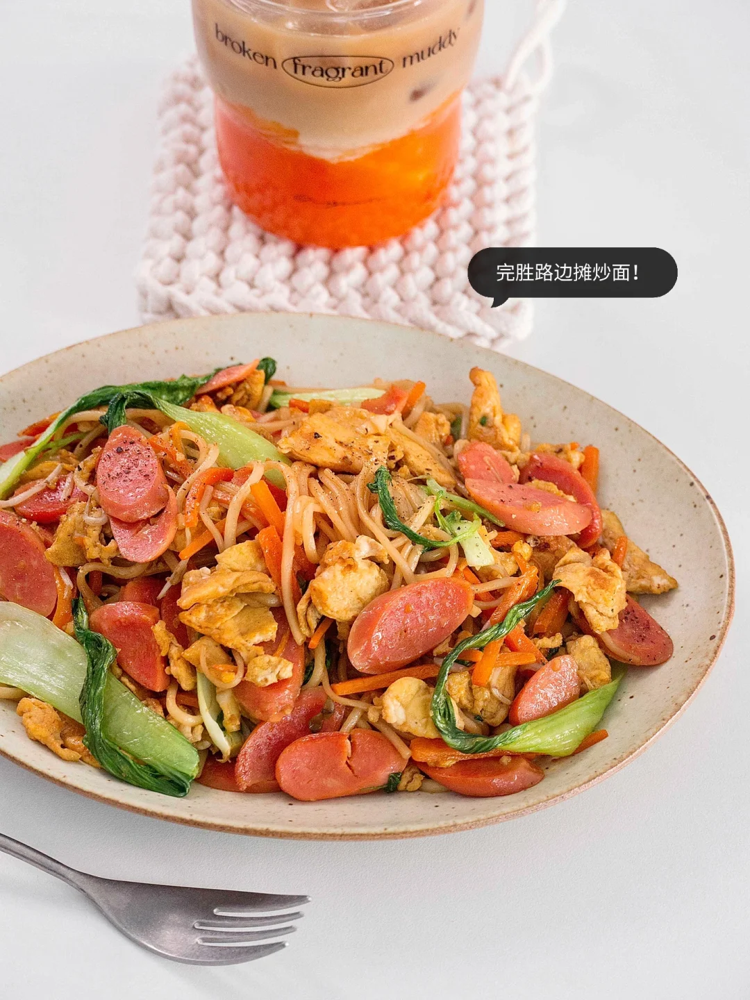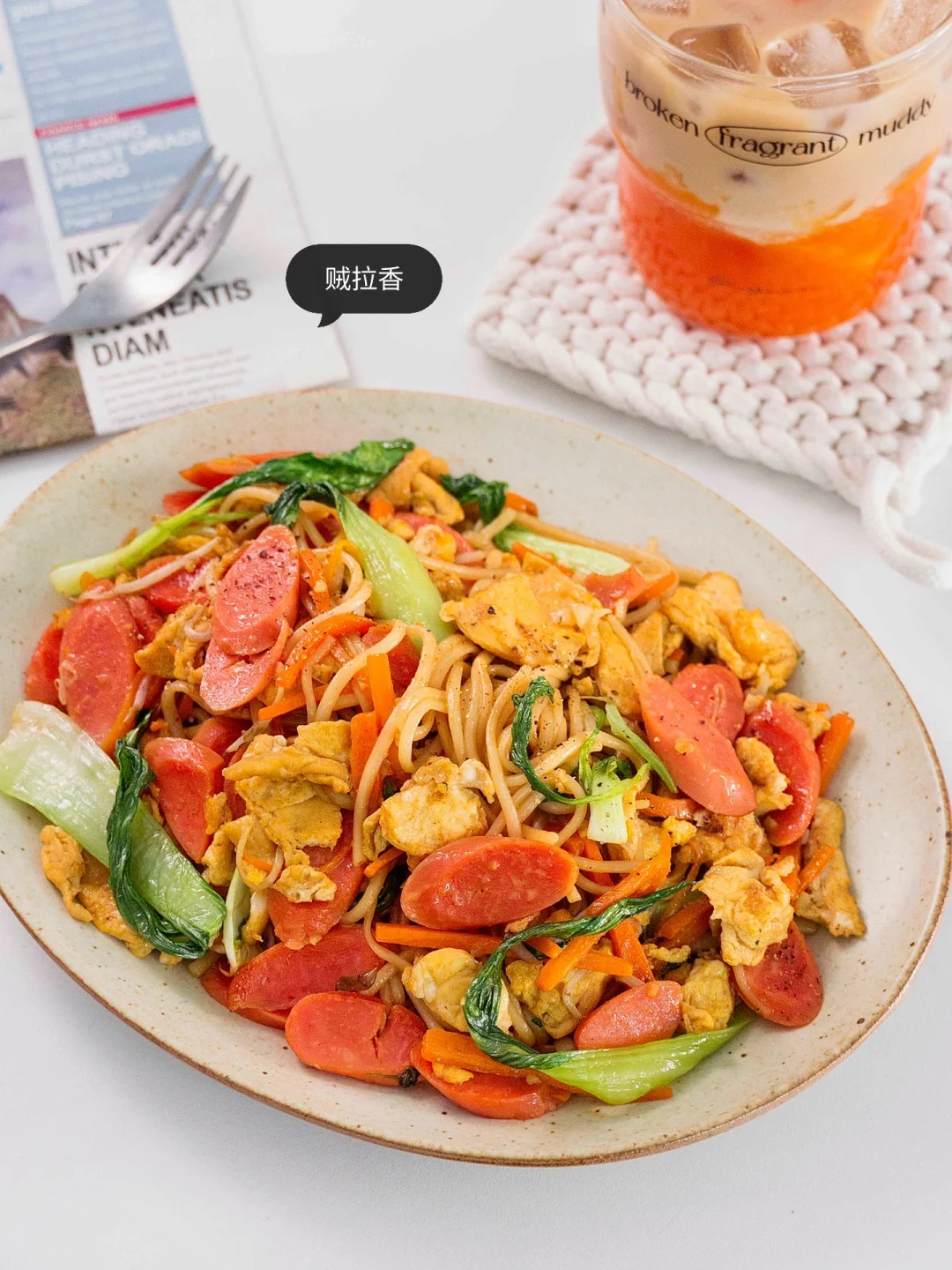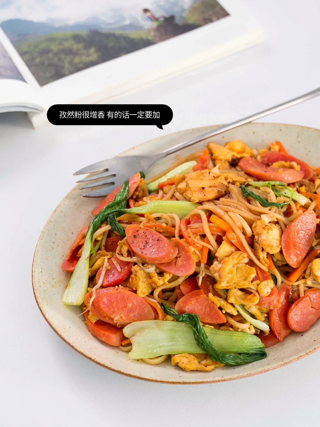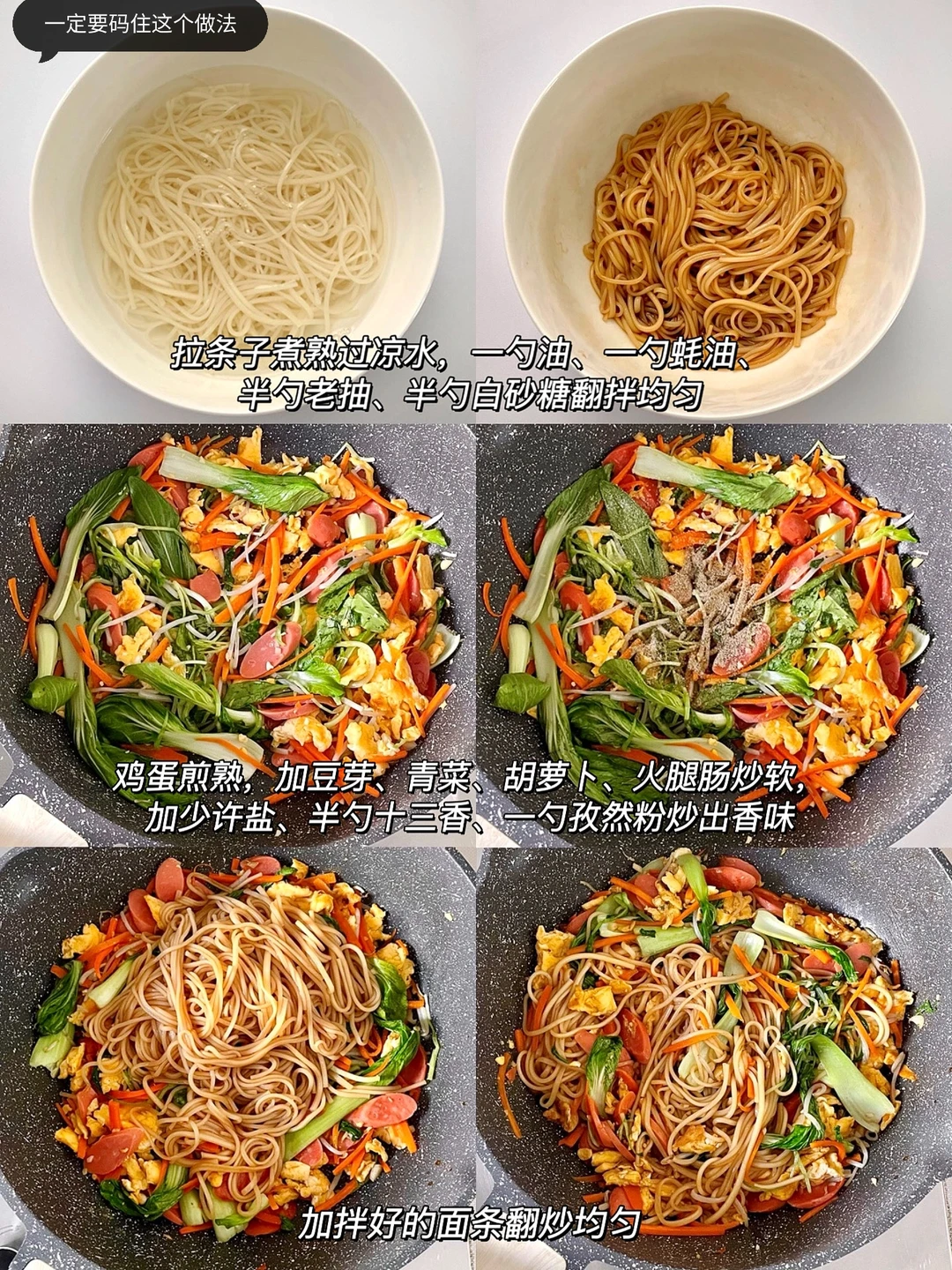 ▫️鸡蛋煎熟,加蒜末、豆芽、青菜、胡萝卜、火腿肠炒软