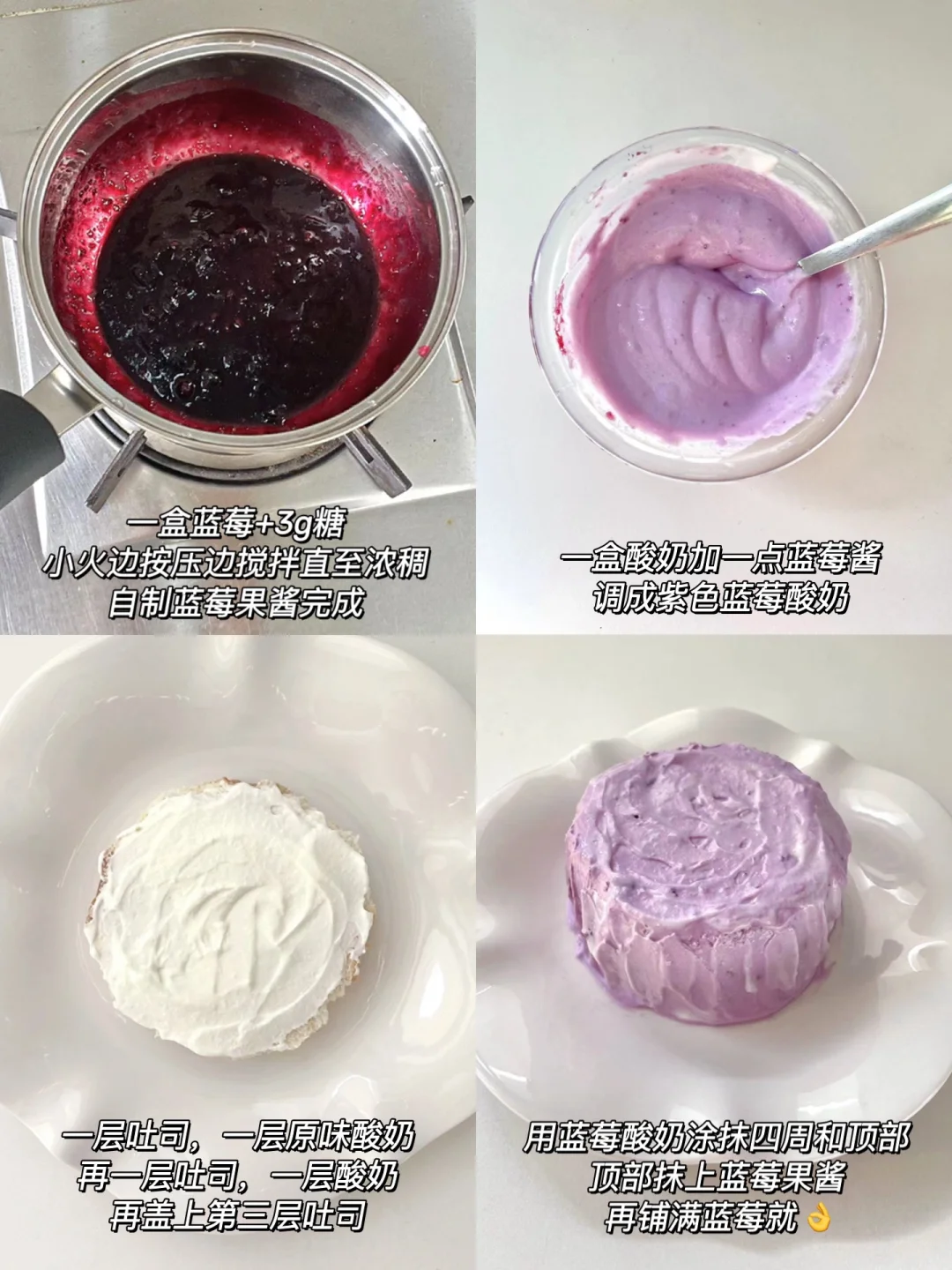 不会长肉的低卡小甜品,用吐司和酸奶做的伪蛋糕〽️低卡无负担,减脂女孩必备技能☑️ 用吐司代替蛋糕,用丝滑醇厚的酸奶代替奶油,口感非常惊艳,既能饱腹,还能解馋! - 食材🔖 蓝莓 全麦吐司3片 浓稠酸奶2杯 做法🔖 ▫️3片吐司用模具划出圆形 ▫️一盒蓝莓+5g糖小火边按压边搅拌,直至浓稠,自制蓝莓果酱完成 ▫️酸奶加一点蓝莓酱,调成紫色蓝莓酸奶 ▫️一层吐司,一层原味酸奶,再一层吐司,一层酸奶,再盖上第三层吐司 ▫️用蓝莓酸奶涂抹四周和顶部 ▫️顶部抹上蓝莓果酱 ▫️再铺满蓝莓就好啦!