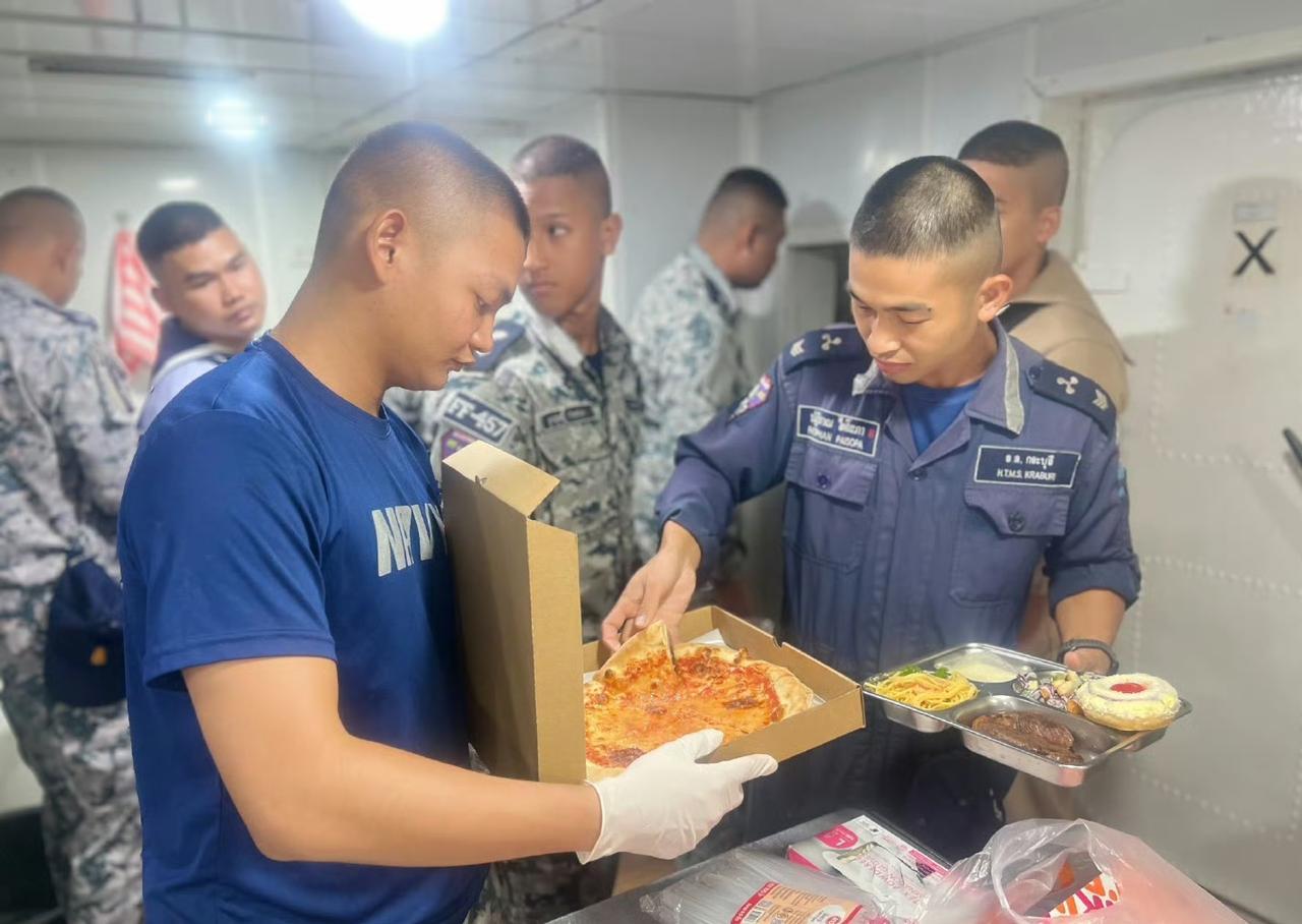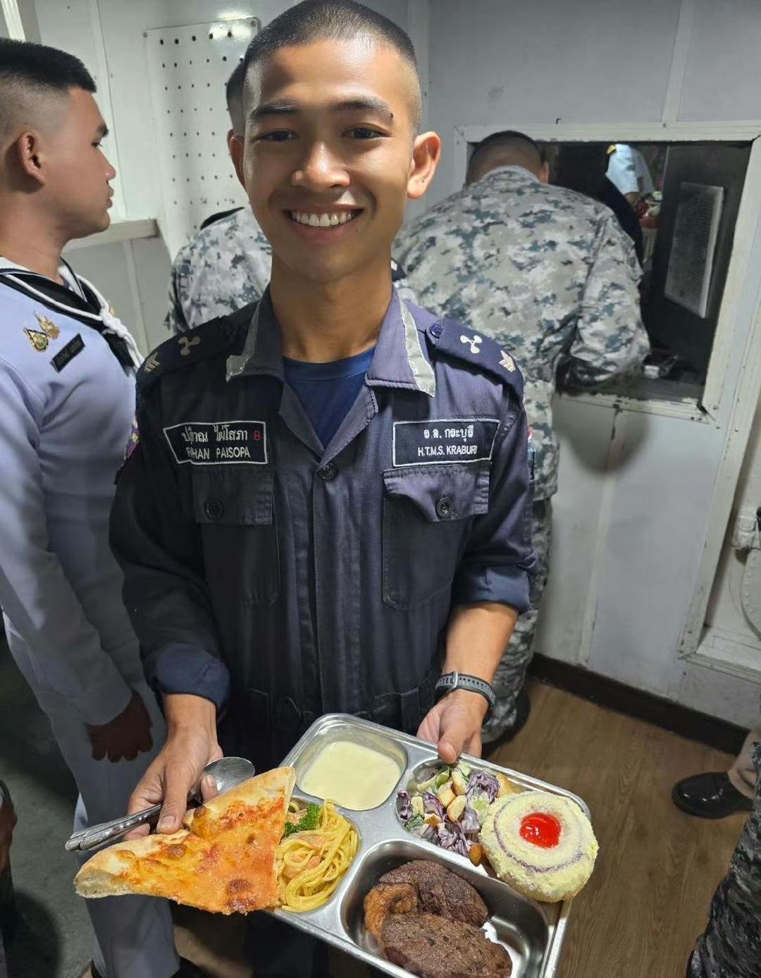 泰国海军457“甲布里”号护卫舰在泰国海军日提供的加餐,泰舰伙食相当可以: “甲布里”号是中国造053HT型护卫舰三号舰,1992年服役,舰龄已33年。 泰国海军