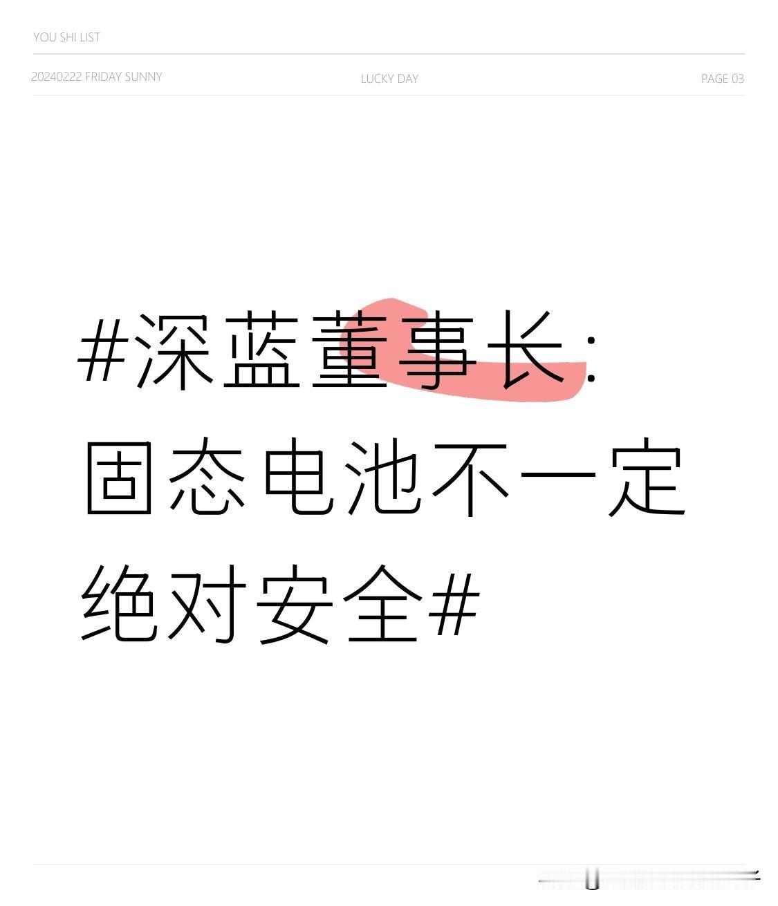 深蓝董事长:固态电池不一定绝对安全 深蓝董事长给固态电池泼冷水,直言固态电池不一定绝对安全。现在网络上很多对固态电池的引导都是错误的,有点小突破就无限放大。市场对全固态电池落地预期太激进,还有虚假宣传,像韩国、日本说2027年量产,到现在也没实现。 深蓝汽车董事长邓承浩认为全固态电池2030年大规模商用已是乐观预期,甚至可能到2035年。中国全固态电池产学研协同创新平台副理事长吴志新预计2032 - 2033年进入“全域增量时代”。看来大家真得客观理性看待固态电池发展,别被过度营销忽悠了。