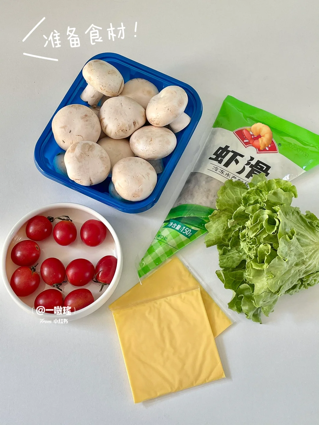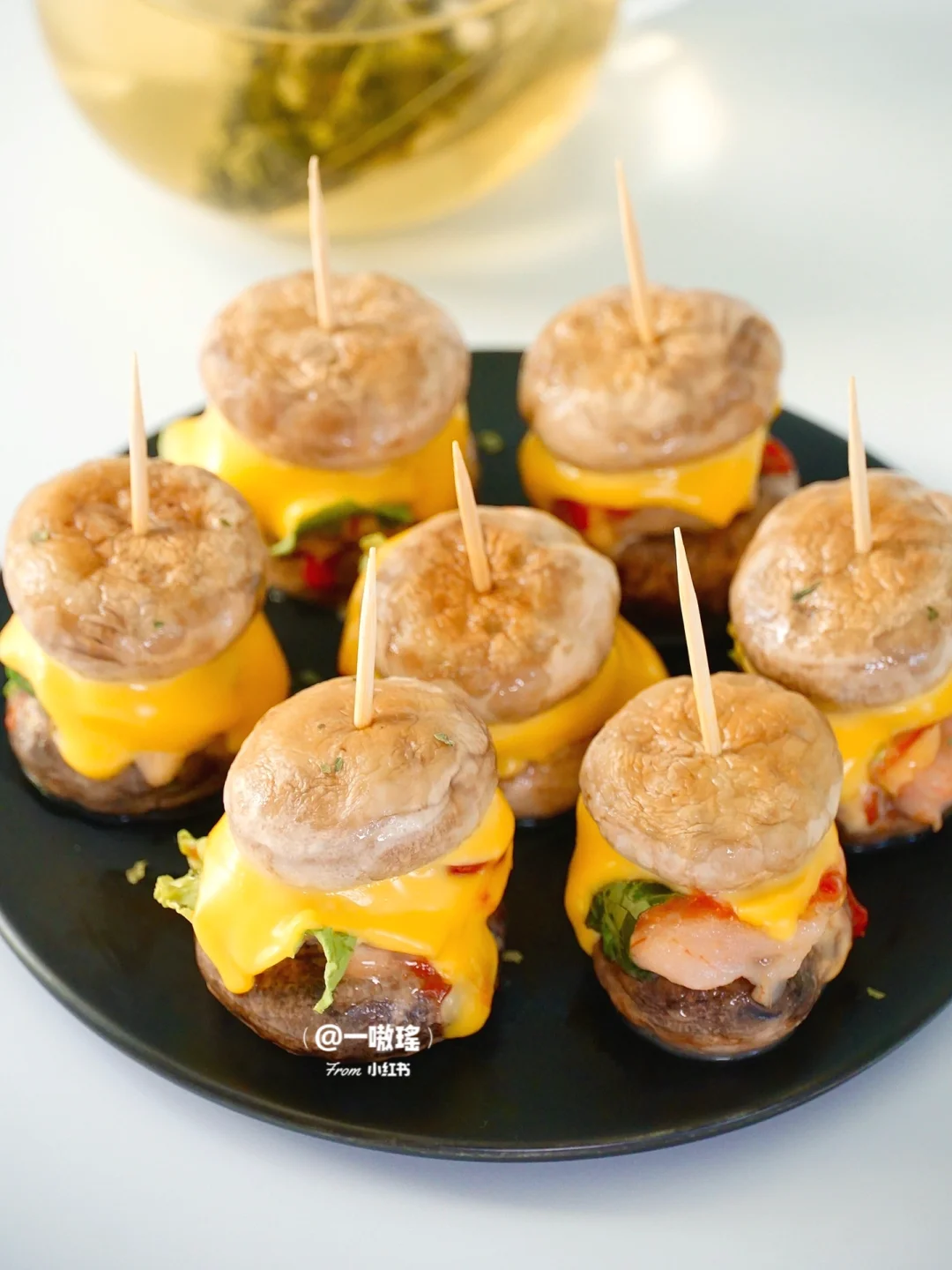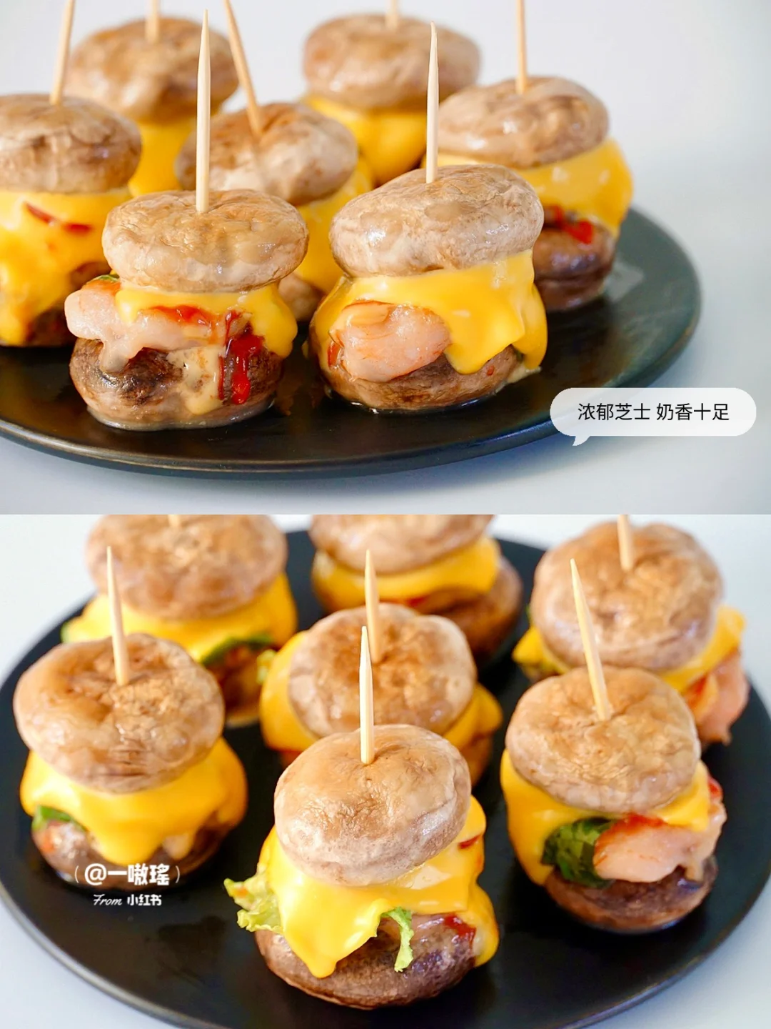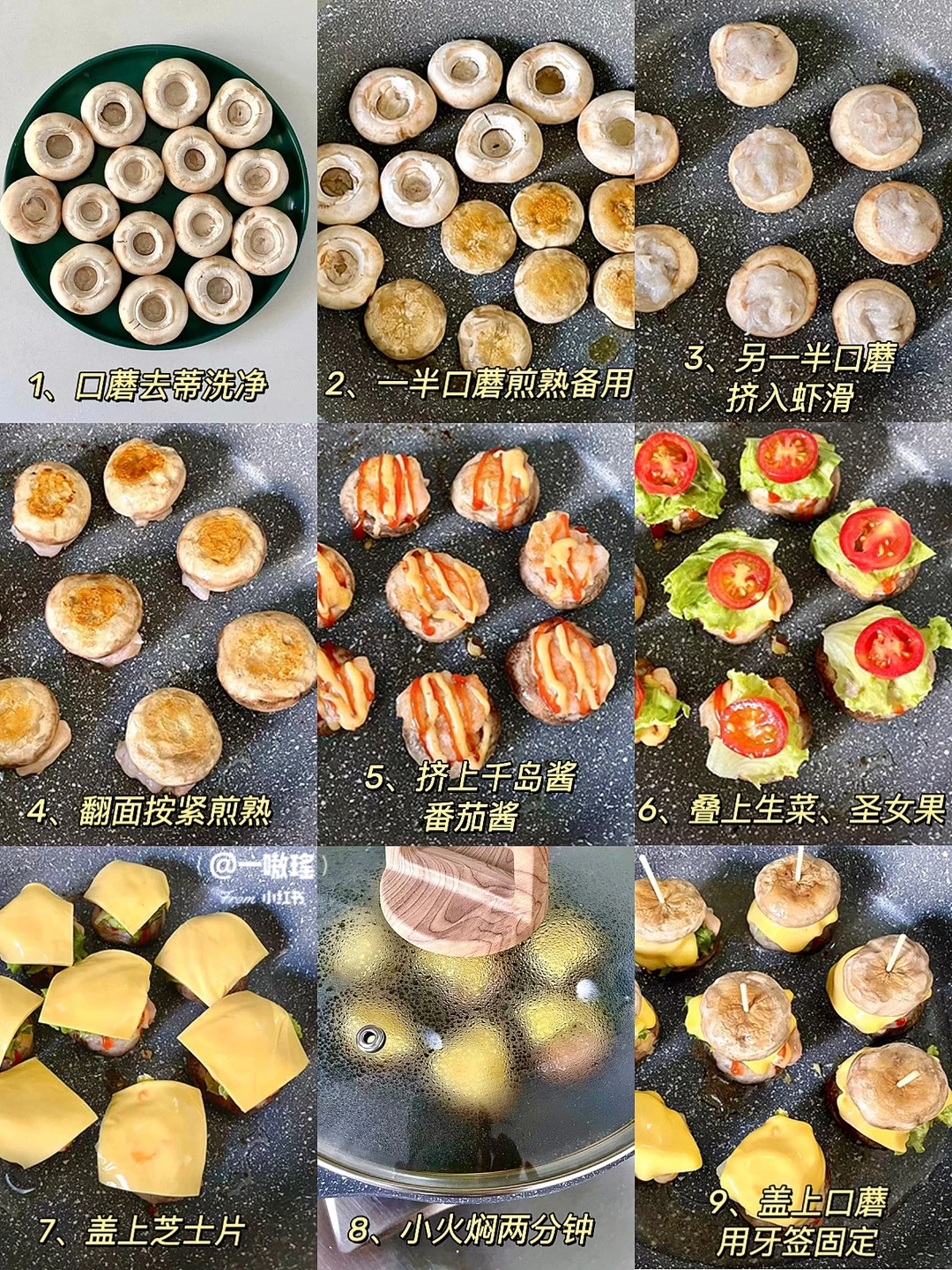 ✔️Get口蘑新吃法!鲜嫩爆汁的虾滑口蘑小汉堡,有手就会! 浓郁芝士搭配口蘑和虾滑的鲜美,一口一个停不下来 - 🔖食材: 口蘑 虾滑 芝士 生菜 小番茄 番茄酱 千岛酱 📍详细做法见图5噢! - 🍄口蘑煎熟就很鲜美了,做成迷你小汉堡🍔无面粉低热量❗️ 搭配浓郁芝士和Q弹虾滑,口感丰富,爆汁满足🤩